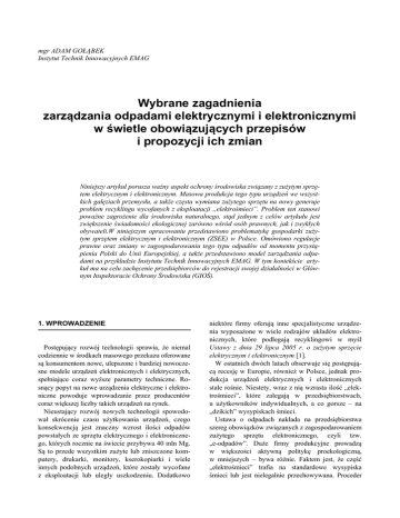 mgr ADAM GOŁĄBEK Instytut Technik Innowacyjnych EMAG Wybrane zagadnienia zarządzania odpadami elektrycznymi i elektronicznymi w świetle obowiązujących przepisów i propozycji ich zmian Niniejszy artykuł porusza ważny aspekt ochrony środowiska związany z zużytym sprzętem elektrycznym i elektronicznym. Masowa produkcja tego typu urządzeń we wszystkich gałęziach przemysłu, a także częsta wymiana zużytego sprzętu na nowy generuje problem recyklingu wycofanych z eksploatacji „elektrośmieci”. Problem ten stanowi poważne zagrożenie dla środowiska naturalnego, stąd jednym z celów artykułu jest zwiększenie świadomości ekologicznej zarówno wśród osób prawnych, jak i zwykłych obywateli.W niniejszym opracowaniu przedstawiono problematykę gospodarki zużytym sprzętem elektrycznym i elektronicznym (ZSEE) w Polsce. Omówiono regulacje prawne oraz zmiany w zagospodarowaniu tego typu odpadów od momentu przystąpienia Polski do Unii Europejskiej, a także przedstawiono model zarządzania odpadami na przykładzie Instytutu Technik Innowacyjnych EMAG. W tym kontekście artykuł ma na celu zachęcenie przedsiębiorców do rejestracji swojej działalności w Głównym Inspektoracie Ochrony Środowiska (GIOŚ). 1. WPROWADZENIE Postępujący rozwój technologii sprawia, że niemal codziennie w środkach masowego przekazu oferowane są konsumentom nowe, ulepszone i bardziej nowoczesne modele urządzeń elektronicznych i elektrycznych, spełniające coraz wyższe parametry techniczne. Rosnący popyt na nowe urządzenia elektryczne i elektroniczne powoduje wprowadzanie przez producentów coraz większej liczby takich urządzeń na rynek. Nieustający rozwój nowych technologii spowodował skrócenie czasu użytkowania urządzeń, czego konsekwencją jest znaczny wzrost ilości odpadów powstałych ze sprzętu elektrycznego i elektronicznego, których rocznie na świecie przybywa 40 mln Mg. Są to przede wszystkim zużyte lub zniszczone komputery, drukarki, monitory, kserokopiarki i wiele innych podobnych urządzeń, które zostały wycofane z eksploatacji lub uległy uszkodzeniu. Dodatkowo niektóre firmy oferują inne specjalistyczne urządzenia wyposażone w wiele rodzajów układów elektronicznych, które podlegają recyklingowi w myśl Ustawy z dnia 29 lipca 2005 r. o zużytym sprzęcie elektrycznym i elektronicznym [1]. W ostatnich dwóch latach obserwuje się postępującą recesję w Europie, również w Polsce, jednak produkcja urządzeń elektrycznych i elektronicznych stale rośnie. Niestety, wraz z nią wzrasta ilość „elektrośmieci”, które zalegają w przedsiębiorstwach, u użytkowników indywidualnych, a co gorsze – na „dzikich” wysypiskach śmieci. Ustawa o odpadach nakłada na przedsiębiorstwa szereg obowiązków związanych z zagospodarowaniem zużytego sprzętu elektronicznego, czyli tzw. „e-odpadów”. Duże firmy produkcyjne prowadzą w większości aktywną politykę proekologiczną, w mniejszych – bywa różnie. Faktem jest, że część „elektrośmieci” trafia na standardowe wysypiska śmieci lub jest nielegalnie przechowywana. Proceder 44 MECHANIZACJA I AUTOMATYZACJA GÓRNICTWA ten trwa mimo kontroli ze strony odpowiednich służb. W zmianie ludzkiej mentalności mają pomóc coraz wyższe kary za nieprawidłowe postępowanie z zużytym sprzętem elektrycznym i elektronicznym oraz nowelizacja ustawy1 zmuszająca zarówno wprowadzających na rynek, jak i recyklerów do prowadzenia odzysku odpadów elektronicznych i ich właściwej utylizacji. Nie da się wyobrazić współczesnego górnictwa podziemnego bez urządzeń i sprzętu elektrycznego oraz elektronicznego. Dlatego zarówno wśród producentów, jak i wprowadzających na rynek tego typu urządzenia i sprzęt są także jednostki zaplecza górniczego. Ich specyfika powoduje, że w zakresie gospodarki „e-odpadami” mają znaczący udział w skali kraju. Natomiast „zużyty sprzęt" to taki, który poza warunkami określonymi wyżej spełnia definicję odpadu zawartą w ustawie o odpadach, tj. którego posiadacz pozbywa się, zamierza się pozbyć lub jest zobowiązany do jego pozbycia się. Potocznie taki sprzęt nazywany jest „elektrośmieciami”, „elektroodpadami”, „e-śmieciami” lub „e-odpadami” i takie nazewnictwo przyjęto w niniejszym artykule. Zawiera on liczne elementy charakteryzujące się właściwościami trującymi i toksycznymi, które po przedostaniu się do środowiska mogą powodować poważne zagrożenie dla organizmów żywych, dlatego należy go umieszczać w specjalnych pojemnikach, a nie w pojemnikach z odpadami komunalnymi. Do zużytego sprzętu elektrycznego i elektronicznego zaliczamy: wielkogabarytowe urządzenia gospodarstwa domowego, małogabarytowe urządzenia gospodarstwa domowego, sprzęt teleinformacyjny i telekomunikacyjny, sprzęt audiowizualny, sprzęt oświetleniowy, narzędzia elektryczne i elektroniczne, zabawki, sprzęt rekreacyjny i sportowy, przyrządy medyczne, przyrządy do nadzoru i kontroli oraz automaty do wydawania. Poszczególne grupy i ważniejsze rodzaje sprzętu elektrycznego i elektronicznego przedstawiono w tabeli nr 1. 2. „E-SPRZĘT” I JEGO RODZAJE Termin „sprzęt elektryczny i elektroniczny” (także: „e-sprzęt”, „e-urządzenia”) oznacza urządzenia, których prawidłowe działanie jest uzależnione od dopływu prądu elektrycznego lub od obecności pól elektromagnetycznych, a także urządzenia mogące służyć do wytwarzania, przesyłu lub pomiaru prądu elektrycznego bądź pól elektromagnetycznych [2]. Tabela 1. Grupy i ważniejsze rodzaje sprzętu elektrycznego i elektronicznego [1] Grupa Rodzaje sprzętu elektrycznego i elektronicznego Wielkogabarytowe urządzenia gospodarstwa domowego chłodziarki, zamrażarki, pralki, suszarki do ubrań, zmywarki, urządzenia kuchenne, w tym kuchenki, piece i płyty elektryczne, kuchenki mikrofalowe, elektryczne urządzenia grzejne, wenty