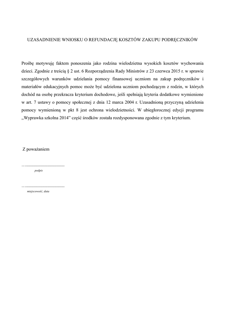UZASADNIENIE WNIOSKU O REFUNDACJĘ KOSZTÓW ZAKUPU PODRĘCZNIKÓW Prośbę motywuję faktem ponoszenia jako rodzina wielodzietna wysokich kosztów wychowania dzieci. Zgodnie z treścią § 2 ust. 6 Rozporządzenia Rady Ministrów z 23 czerwca 2015 r. w sprawie szczegółowych warunków udzielania pomocy finansowej uczniom na zakup podręczników i materiałów edukacyjnych pomoc może być udzielona uczniom pochodzącym z rodzin, w których dochód na osobę przekracza kryterium dochodowe, jeśli spełniają kryteria dodatkowe wymienione w art. 7 ustawy o pomocy społecznej z dnia 12 marca 2004 r. Uzasadnioną przyczyną udzielenia pomocy wymienioną w pkt 8 jest ochrona wielodzietności. W ubiegłorocznej edycji programu ,,Wyprawka szkolna 2014” część środków została rozdysponowana zgodnie z tym kryterium. Z poważaniem ….................................. podpis ….................................. miejscowość, data