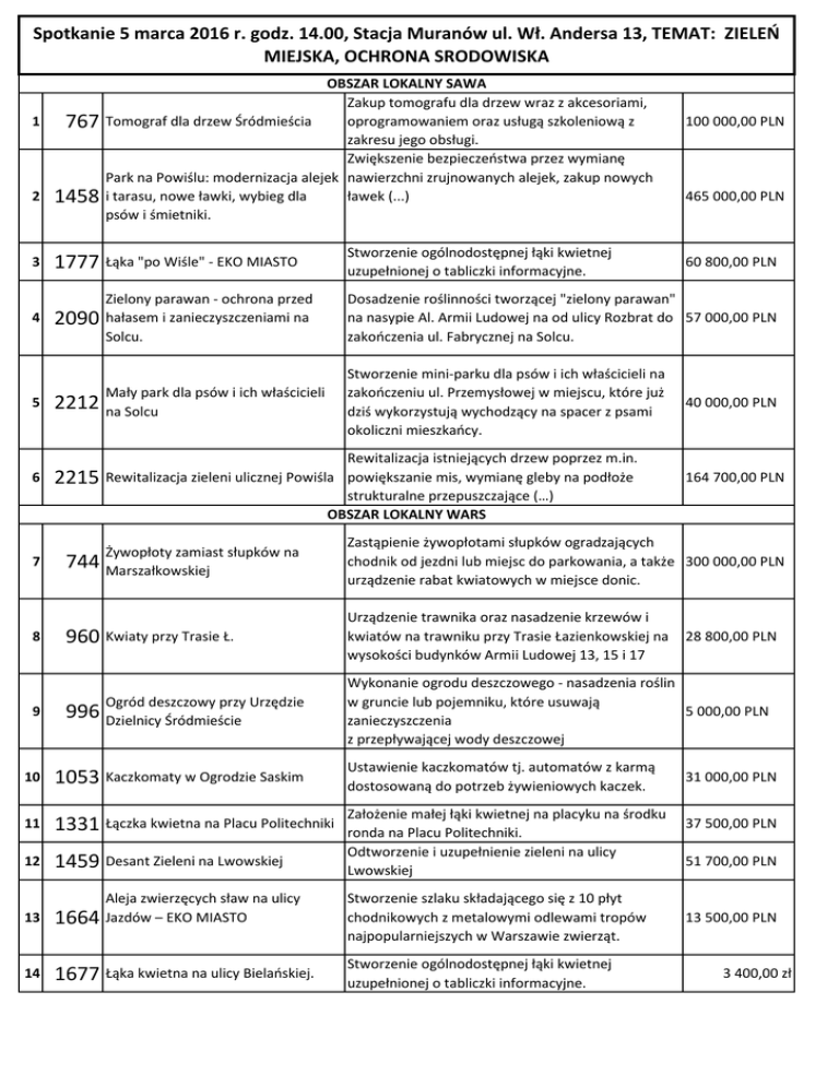 Spotkanie 5 marca 2016 r. godz. 14.00, Stacja Muranów ul. Wł. Andersa 13, TEMAT: ZIELEŃ MIEJSKA, OCHRONA SRODOWISKA OBSZAR LOKALNY SAWA Zakup tomografu dla drzew wraz z akcesoriami, Tomograf dla drzew Śródmieścia oprogramowaniem oraz usługą szkoleniową z zakresu jego obsługi. Zwiększenie bezpieczeństwa przez wymianę Park na Powiślu: modernizacja alejek nawierzchni zrujnowanych alejek, zakup nowych i tarasu, nowe ławki, wybieg dla ławek (...) psów i śmietniki. 1 767 2 1458 3 1777 Łąka "po Wiśle" - EKO MIASTO 4 5 6 7 8 9 2090 Zielony parawan - ochrona przed hałasem i zanieczyszczeniami na Solcu. Mały park dla psów i ich właścicieli 2212 na Solcu 2215 744 Żywopłoty zamiast słupków na Marszałkowskiej Ogród deszczowy przy Urzędzie Dzielnicy Śródmieście Stworzenie mini-parku dla psów i ich właścicieli na zakończeniu ul. Przemysłowej w miejscu, które już dziś wykorzystują wychodzący na spacer z psami okoliczni mieszkańcy. Urządzenie trawnika oraz nasadzenie krzewów i kwiatów na trawniku przy Trasie Łazienkowskiej na wysokości budynków Armii Ludowej 13, 15 i 17 Ustawienie kaczkomatów tj. automatów z karmą dostosowaną do potrzeb żywieniowych kaczek. 11 1331 Łączka kwietna na Placu Politechniki 12 1459 Desant Zieleni na Lwowskiej Założenie małej łąki kwietnej na placyku na środku ronda na Placu Politechniki. Odtworzenie i uzupełnienie zieleni na ulicy Lwowskiej 1664 14 1677 Łąka kwietna na ulicy Bielańskiej. 40 000,00 PLN 164 700,00 PLN 28 800,00 PLN Wykonanie ogrodu deszczowego - nasadzenia roślin w gruncie lub pojemniku, które usuwają 5 000,00 PLN zanieczyszczenia z przepływającej wody deszczowej 1053 Kaczkomaty w Ogrodzie Saskim Aleja zwierzęcych sław na ulicy Jazdów – EKO MIASTO 60 800,00 PLN Zastąpienie żywopłotami słupków ogradzających chodnik od jezdni lub miejsc do parkowania, a także 300 000,00 PLN urządzenie rabat kwiatowych w miejsce donic. 10 13 465 000,00 PLN Dosadzenie roślinności tworzącej "zielony parawan" na nasypie Al. Armii Ludowej na od ulicy Rozbrat do 57 000,00 PLN zakończenia ul. Fabrycznej na Solcu. Rewitalizacja istniejących drzew poprzez m.in. Rewitalizacja zieleni ulicznej Powiśla powiększanie mis, wymianę gleby na podłoże strukturalne przepuszczające (…) OBSZAR LOKALNY WARS 960 Kwiaty przy Trasie Ł. 996 Stworzenie ogólnodostępnej łąki kwietnej uzupełnionej o tabliczki informacyjne. 100 000,00 PLN Stworzenie szlaku składającego się z 10 płyt chodnikowych z metalowymi odlewami tropów najpopularniejszych w Warszawie zwierząt. Stworzenie ogólnodostępnej łąki kwietnej uzupełnionej o tabliczki informacyjne. 31 000,00 PLN 37 500,00 PLN 51 700,00 PLN 13 500,00 PLN 3 400,00 zł 15 1756 Zielony Plac Politechniki 16 1792 Łąka centralna - EKO MIASTO 17 1863 Łąka Żelaznej Bramy - EKO MIASTO 18 1868 Łąka Marszałkowska - EKO MIASTO 19 2104 Rewitalizacja zieleni ulicznej w kwartale Marszałkowska Koszykowa - Chałubińskiego Jerozolimskie 20 2255 Kwietniki na Polnej 21 2617 Centralnego do Metra Śródmieście wita różami - od Założenie na terenie należącym do miasta na obecnym chodniku pomiędzy ulicami Śniadeckich i Lwowską małej, 10 m2, przestrzeni zielonej obsadzonej kwiatami. Przestrzeń na „zielnik” nie upośledza przejścia ani widoku na jezdnie z ronda. Stworzenie ogólnodostępnej łąki kwietnej uzupełnionej o tabliczki informacyjne. Stworzenie ogólnodostępnej łąki kwietnej uzupełnionej o tabliczki informacyjne. Stworzenie ogólnodostępnej łąki kwietnej uzupełnionej o tabliczki informacyjne. 8 000,00 PLN 80 800,00 PLN 100 800,00 PLN 20 800,00 PLN Rewitalizacja istniejących drzew poprzez m.in. powiększanie mis, wymianę gleby na podłoże strukturalne przepuszczające (…) 363 200,00 PLN Doprowadzenie do porządku niekultywowanych i nieobsadzonych niczym, pustych trawników z resztkami trawy po nieparzystej stronie ul. Polnej. nia przy przejściach bocznych. 60 000,00 PLN Posadzenie tysięcy róż na 6-ciu duzych kwietnikach 110 000,00 PLN