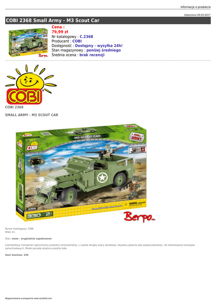 Informacje o produkcie Utworzono 04-03-2017 COBI 2368 Small Army - M3 Scout Car Cena : 79,99 zł Nr katalogowy : C.2368 Producent : COBI Dostępność : Dostępny - wysyłka 24h! Stan magazynowy : poniżej średniego Średnia ocena : brak recenzji COBI 2368 SMALL ARMY - M3 SCOUT CAR Numer katalogowy: 2368 Wiek: 6+ Stan: nowe - oryginalnie zapakowane Czterokołowy transporter opancerzony produkcji amerykańskiej, z czasów drugiej wojny światowej. Używany głównie jako pojazd patrolowy i do eskortowania konwojów samochodowych. Model posiada skrętne przednie koła Ilość klocków: 330 Wygenerowano w programie www.oscGold.com Dostępność w salonach: Ilość: Sklep - Złotniki: 3 Sklep - zlikwidowany: 0 Sklep - Szczepankowo: 1 Dostępne opcje COBI 2368 Small Army - M3 Scout Car » Wiek: 5 - 7 lat, 8 - 11 lat, 12 lat i więcej.