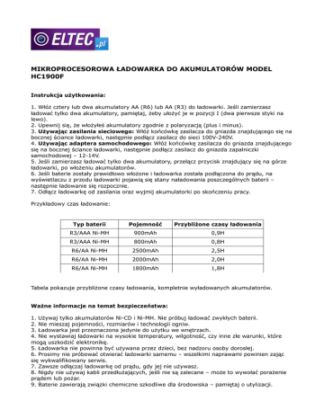 MIKROPROCESOROWA ŁADOWARKA DO AKUMULATORÓW MODEL HC1900F Instrukcja użytkowania: 1. Włóż cztery lub dwa akumulatory AA (R6) lub AA (R3) do ładowarki. Jeśli zamierzasz ładować tylko dwa akumulatory, pamiętaj, żeby ułożyć je w pozycji I (dwa pierwsze styki na lewo). 2. Upewnij się, że włożyłeś akumulatory zgodnie z polaryzacją (plus i minus). 3. Używając zasilania sieciowego: Włóż końcówkę zasilacza do gniazda znajdującego się na bocznej ściance ładowarki, następnie podłącz zasilacz do sieci 100V-240V. 4. Używając adaptera samochodowego: Włóż końcówkę zasilacza do gniazda znajdującego się na bocznej ściance ładowarki, następnie podłącz zasilacz do gniazda zapalniczki samochodowej – 12-14V. 5. Jeśli zamierzasz ładować tylko dwa akumulatory, przełącz przycisk znajdujący się na górze ładowarki, po włożeniu akumulatorów. 6. Jeśli baterie zostały prawidłowo włożone i ładowarka została podłączona do prądu, na wyświetlaczu z przodu ładowarki pojawią się stany naładowania poszczególnych baterii – następnie ładowanie się rozpocznie. 7. Odłącz ładowarkę od zasilania oraz wyjmij akumulatorki po skończeniu pracy. Przykładowy czas ładowanie: Typ baterii Pojemność Przybliżone czasy ładowania R3/AAA Ni-MH 900mAh 0,9H R3/AAA Ni-MH 800mAh 0,8H R6/AA Ni-MH 2500mAh 2,5H R6/AA Ni-MH 2000mAh 2,0H R6/AA Ni-MH 1800mAh 1,8H Tabela pokazuje przybliżone czasy ładowania, kompletnie wyładowanych akumulatorów. Ważne informacje na temat bezpieczeństwa: 1. Używaj tylko akumulatorów Ni-CD i Ni-MH. Nie próbuj ładować zwykłych baterii. 2. Nie mieszaj pojemności, rozmiarów i technologii ogniw. 3. Ładowarka jest przeznaczona jedynie do użytku we wnętrzach. 4. Nie wystawiaj ładowarki na wysokie temperatury, wilgotność, czy inne złe warunki, które mogą uszkodzić elektronikę. 5. Ładowarka nie powinna być używana przez dzieci, bez nadzoru osoby dorosłej. 6. Prosimy nie próbować otwierać ładowarki samemu – wszelkimi naprawami powinien zając się wykwalifikowany serwis. 7. Zawsze odłączaj ładowarkę od prądu, gdy jej nie używasz. 8. Nigdy nie używaj kabli przedłużających, jeśli nie są zalecane – może to wywołać porażenie prądem lub pożar. 9. Baterie zawierają związki chemiczne szkodliwe dla środowiska – pamiętaj o utylizacji. Dane techniczne: Ładowarka: Wejście: 100V-240V AC, 50/60Hz 10W, lub 12-14V DC Moc ładowania: 1000mA System Delta V/0 Delta V Ochrona czasowa, ochrona przed przegrzaniem, przeładowaniem. Detekcja wadliwych akumulatorów. Ochrona przeciw niewłaściwej polaryzacji. Importer: ELTEC Krzysztof Ryfka ul. Andrzejowska 3/14 02-312 Warszawa Sklep i serwis: ul. Słupecka 4 02-309 Warszawa tel. (022) 659 53 38 WWW.ELTEC.PL