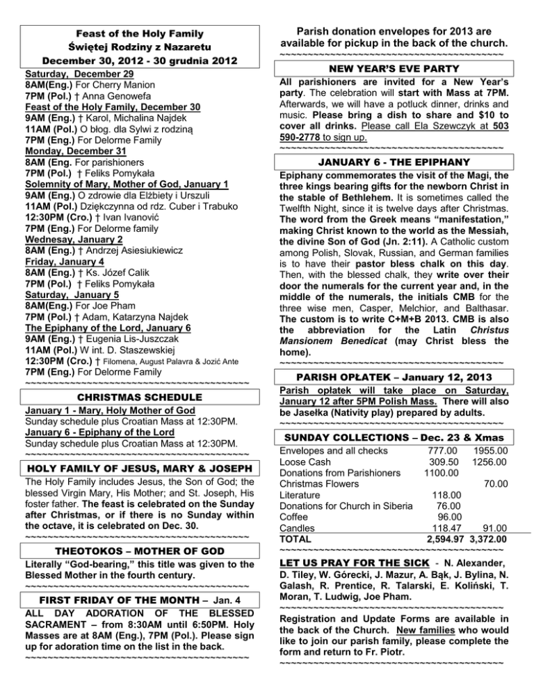Feast of the Holy Family Świętej Rodziny z Nazaretu December 30, 2012 - 30 grudnia 2012 Saturday, December 29 8AM(Eng.) For Cherry Manion 7PM (Pol.) † Anna Genowefa Feast of the Holy Family, December 30 9AM (Eng.) † Karol, Michalina Najdek 11AM (Pol.) O błog. dla Sylwi z rodziną 7PM (Eng.) For Delorme Family Monday, December 31 8AM (Eng. For parishioners 7PM (Pol.) † Feliks Pomykała Solemnity of Mary, Mother of God, January 1 9AM (Eng.) O zdrowie dla Elżbiety i Urszuli 11AM (Pol.) Dziękczynna od rdz. Cuber i Trabuko 12:30PM (Cro.) † Ivan Ivanović 7PM (Eng.) For Delorme family Wednesay, January 2 8AM (Eng.) † Andrzej Asiesiukiewicz Friday, January 4 8AM (Eng.) † Ks. Józef Calik 7PM (Pol.) † Feliks Pomykała Saturday, January 5 8AM(Eng.) For Joe Pham 7PM (Pol.) † Adam, Katarzyna Najdek The Epiphany of the Lord, January 6 9AM (Eng.) † Eugenia Lis-Juszczak 11AM (Pol.) W int. D. Staszewskiej 12:30PM (Cro.) † Filomena, August Palavra & Jozić Ante 7PM (Eng.) For Delorme Family ~~~~~~~~~~~~~~~~~~~~~~~~~~~~~~~~~~~~~~~~ CHRISTMAS SCHEDULE January 1 - Mary, Holy Mother of God Sunday schedule plus Croatian Mass at 12:30PM. January 6 - Epiphany of the Lord Sunday schedule plus Croatian Mass at 12:30PM. ~~~~~~~~~~~~~~~~~~~~~~~~~~~~~~~~~~~~~~~~ HOLY FAMILY OF JESUS, MARY & JOSEPH The Holy Family includes Jesus, the Son of God; the blessed Virgin Mary, His Mother; and St. Joseph, His foster father. The feast is celebrated on the Sunday after Christmas, or if there is no Sunday within the octave, it is celebrated on Dec. 30. ~~~~~~~~~~~~~~~~~~~~~~~~~~~~~~~~~~~~~~~~ THEOTOKOS – MOTHER OF GOD Literally “God-bearing,” this title was given to the Blessed Mother in the fourth century. ~~~~~~~~~~~~~~~~~~~~~~~~~~~~~~~~~~~~~~~~ FIRST FRIDAY OF THE MONTH – Jan. 4 ALL DAY ADORATION OF THE BLESSED SACRAMENT – from 8:30AM until 6:50PM. Holy Masses are at 8AM (Eng.), 7PM (Pol.). Please sign up for adoration time on the list in the back. ~~~~~~~~~~~~~~~~~~~~~~~~~~~~~~~~~~~~~~~~ Parish donation envelopes for 2013 are available for pickup in the back of the church. ~~~~~~~~~~~~~~~~~~~~~~~~~~~~~~~~~~~~~~~~ NEW YEAR’S EVE PARTY All parishioners are invited for a New Year’s party. The celebration will start with Mass at 7PM. Afterwards, we will have a potluck dinner, drinks and music. Please bring a dish to share and $10 to cover all drinks. Please call Ela Szewczyk at 503 590-2778 to sign up. ~~~~~~~~~~~~~~~~~~~~~~~~~~~~~~~~~~~~~~~~ JANUARY 6 - THE EPIPHANY Epiphany commemorates the visit of the Magi, the three kings bearing gifts for the newborn Christ in the stable of Bethlehem. It is sometimes called the Twelfth Night, since it is twelve days after Christmas. The word from the Greek means “manifestation,” making Christ known to the world as the Messiah, the divine Son of God (Jn. 2:11). A Catholic custom among Polish, Slovak, Russian, and German families is to have their pastor bless chalk on this day. Then, with the blessed chalk, they write over their door the numerals for the current year and, in the middle of the numerals, the initials CMB for the three wise men, Casper, Melchior, and Balthasar. The custom is to write C+M+B 2013. CMB is also the abbreviation for the Latin Christus Mansionem Benedicat (may Christ bless the home). ~~~~~~~~~~~~~~~~~~~~~~~~~~~~~~~~~~~~~~~~ PARISH OPŁATEK – January 12, 2013 Parish opłatek will take place on Saturday, January 12 after 5PM Polish Mass. There will also be Jasełka (Nativity play) prepared by adults. ~~~~~~~~~~~~~~~~~~~~~~~~~~~~~~~~~~~~~~~~ SUNDAY COLLECTIONS – Dec. 23 & Xmas Envelopes and all checks 777.00 1955.00 Loose Cash 309.50 1256.00 Donations from Parishioners 1100.00 Christmas Flowers 70.00 Literature 118.00 Donations for Church in Siberia 76.00 Coffee 96.00 Candles 118.47 91.00 TOTAL 2,594.97 3,372.00 ~~~~~~~~~~~~~~~~~~~~~~~~~~~~~~~~~~~~~~~~ LET US PRAY FOR THE SICK - N. Alexander, D. Tiley, W. Górecki, J. Mazur, A. Bąk, J. Bylina, N. Galash, R. Prentice, R. Talarski, E. Koliński, T. Moran, T. Ludwig, Joe Pham. ~~~~~~~~~~~~~~~~~~~~~~~~~~~~~~~~~~~~~~~~ Registration and Update Forms are available in the back of the Church. New families who would like to join our parish family, please complete the form and return to Fr. Piotr. ~~~~~~~~~~~~~~~~~~~~~~~~~~~~~~~~~~~~~~~~ ŻYJEMY W EPOCE MĘCZENNIKÓW 105 tysięcy chrześcijan zginęło w tym roku na świecie za wiarę - to oznacza śmierć jednej osoby co 5 minut. “Pojawić się tam na mszy świętej oznacza ryzykować życiem”... w krajach o silnej obecności islamskiego fundamentalizmu, czyli w Nigerii, Somali, Mali, Pakistanie i Egipcie. ~~~~~~~~~~~~~~~~~~~~~~~~~~~~~~~~~~~~~~~~ OPŁATEK PARAFIALNY - 12 stycznia 2013 Spotkanie opłatkowe rozpoczniemy Mszą św. o godz. 17:00. Potem wspólny posiłek i Jasełka przygotowane przez dorosłych parafian. ~~~~~~~~~~~~~~~~~~~~~~~~~~~~~~~~~~~~~~~~ OPŁATEK Opłatek jest nawiązaniem do Chleba Eucharystycznego, który jest źródłem jedności i miłości. Słowo opłatek pochodzi od łac. oblata, oblatio – dar ofiarowany Bogu – Boska Hostia – źródło wszelkiego dobra, oddanie się Chrystusa Bogu i człowiekowi. „Darzysz prawdziwie gdy sam siebie dajesz drugiemu.” ~~~~~~~~~~~~~~~~~~~~~~~~~~~~~~~~~~~~~~~~ “Kto broni Boga, ten broni człowieka” Benedykt XVI zwrócił uwagę na fundamentalne znaczenie biblijnego opisu stworzenia kobiety i mężczyzny przez Boga i podkreślił, że obecnie dualizm ten jest kwestionowany. Papież przestrzegał, że tam, gdzie wolność czynienia staje się wolnością czynienia siebie samego, nieuchronnie dochodzi się do zanegowania samego Stwórcy, a wraz z tym do poniżenia człowieka jako stworzonego przez Boga. “W walce o rodzinę stawką jest sam człowiek. I staje się oczywiste, że tam, gdzie dochodzi do zanegowania Boga, zniszczeniu ulega także godność człowieka. Kto broni Boga, ten broni człowieka” – mówił Benedykt XVI w czasie bożonarodzeniowego sp