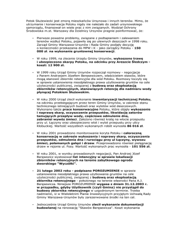 Potok Służewiecki jest zmorą mieszkańców Ursynowa i innych terenów. Mimo, że utrzymanie i konserwacja Potoku nigdy nie należało do zadań ursynowskiego samorządu, finansował on wiele prac z nim związanych. Wydział Ochrony Środowiska m.st. Warszawy dla Dzielnicy Ursynów pragnie poinformować, że: • Pierwsze poważne problemy, związane z podtapianiem i zalewaniem terenów wzdłuż Potoku, pojawiły się po ulewnych deszczach w 1998 roku. Zarząd Gminy Warszawa-Ursynów i Rada Gminy podjęły decyzję o konieczności przekazania do MPW i K - jako zarządcy Potoku - 150 000 zł. na wykonanie gruntownej konserwacji. • W roku 1999, na zlecenie Urzędu Gminy Ursynów, wykoszono trawę i ubezpieczono skarpy Potoku, na odcinku przy Areszcie Śledczym koszt: 12 900 zł. • W 1999 roku Urząd Gminy Ursynów rozpoczął rozmowy - negocjacje z Panem Andrzejem Józefem Beręsewiczem, właścicielem stawów, które mogą stanowić zbiorniki retencyjne dla wód Potoku. Rozmowy toczyły się w sprawie ustanowienia nieodpłatnego prawa użytkowania gruntów na cele użyteczności publicznej, związanej z budową oraz eksploatacją zbiorników retencyjnych, stanowiących retencję dla nadmiaru wody płynącej Potokiem Służewskim. • W roku 2000 Urząd zlecił wykonanie inwentaryzacji technicznej Potoku, na odcinku przebiegającym przez teren Gminy Ursynów, w zakresie stanu technicznego istniejących budowli oraz wylotów wód deszczowych. Wykonano także prace konserwacyjne Potoku, które objęły wykoszenie i naprawę skarp, oczyszczenie przepustów, likwidację zatorów tamujących przepływ wody, częściowe odmulenie dna, zebraniei wywóz śmieci. Założono również kratę na wlocie przepustu przy ul. Łączyny oraz ubezpieczono wlot i wylot przepustu przy ulicy Kłobuckiej. Wartość wszystkich wykonanych robót wynosiła 86 016 zł. • W roku 2001 prowadzono monitorowanie koryta Potoku i całoroczną konserwację w zakresie wykoszenia i naprawy skarp, oczyszczenia przepustów, odmulenia dna i rurociągu przy ul Łączyny, wywozu śmieci, połamanych gałęzi i drzew. Przeprowadzono również pielęgnację drzew w rejonie ul. Fosy. Wartość wykonanych prac wynosiła - 101 556 zł. • W roku 2001, w wyniku prowadzonych negocjacji, Pan Andrzej Józef Beręsewicz wystosował list intencyjny w sprawie lokalizacji zbiorników retencyjnych na terenie zabytkowego ogrodu dworskiego "Wyczółki". • 21 lutego 2002 roku - podpisano POROZUMIENIE w sprawie ustanowienia nieodpłatnego prawa użytkowania gruntów na cele użyteczności publicznej, związanej z budową oraz eksploatacją zbiornika retencyjnego - położonego na terenie własności Pana A.J. Beręsewicza. Niniejsze POROZUMIENIE wygasa z dniem 31.12.2003 r. w przypadku, gdyby Użytkownik (czyli Gmina) nie przystąpił do budowy zbiornika retencyjnego w uzgodnionym terminie. Trzeba nadmienić, iż w Wieloletnim Planie Inwestycyjnym przyjętym Uchwałą Rady Gminy Warszawa-Ursynów były zarezerwowane środki na ten cel. • Jednocześnie Urząd Gminy Ursynów zlecił wykonanie dokumentacji budowlanej na renowację "Stawów Beręsewicza". Koszt wykonania dokumentacji wyniósł 112 362 zł. • Jak wynika z projektu budowlanego koszt wykonania rekultywacji "Stawów Beręsewicza" ma wynieść 1 394.345 zł. Wykonanie pierwszych zbiorników retencyjnych na Potoku Służewieckim, w "Stawach Beręsewicza", da możliwość przechwycenia ~14.000 m wody. Prawdą jest, że ta pojemność jest obecnie niewystarczająca. Jest natomiast szansa budowy następnych zbiorników retencyjnych w rejonie ul. Kłobuckiej. Właścicielem terenów jest także Pan A. J. Beręsewicz, który gotów jest negocjować sposób udostępnienia terenu na następne zbiorniki retencyjne. • Równolegle w roku 2002 Gmina wykonała, jak każdego roku, dwukrotne koszenie traw, czyszczenie przepustów przy ul. Łączyny i ul. Fosy, likwidację zatorów powstających wzdłuż cieku, wywożenie zebranych zanieczyszczeń jak również zajęła się usuwaniem skutków powodzi, tzn.: założeniem nowej kraty przy ul. Łączyny i naprawą ubezpieczeń przy przepuście, wykonaniem barierek na przepuście przy ul. Kłobuckiej, przebudową mostku przy ul. Fosy, zebraniem połamanych drzew i gałęzi zalegających w korycie Potoku. Prace te wykonane zostały na koszt Gminy za łączną sumę 142 433 zł. Łącznie od 1998 do 2002 roku Gmina Warszawa-Ursynów wydała na utrzymanie Potoku Służewieckiego 605 267 zł.