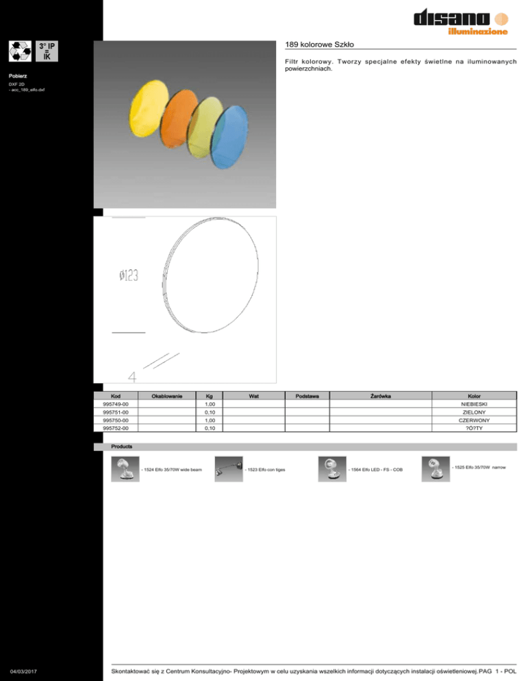 189 kolorowe Szkło Filtr kolorowy. Tworzy specjalne efekty świetlne na iluminowanych powierzchniach. Pobierz DXF 2D - acc_189_elfo.dxf Kod Okablowanie Kg Wat Podstawa Źarówka Kolor NIEBIESKI 995749-00 1,00 995751-00 0,10 ZIELONY 995750-00 1,00 CZERWONY 995752-00 0,10 ?Ó?TY Products - 1524 Elfo 35/70W wide beam 04/03/2017 - 1523 Elfo con tiges - 1564 Elfo LED - FS - COB - 1525 Elfo 35/70W narrow Skontaktować się z Centrum Konsultacyjno- Projektowym w celu uzyskania wszelkich informacji dotyczących instalacji oświetleniowej. PAG 1 - POL