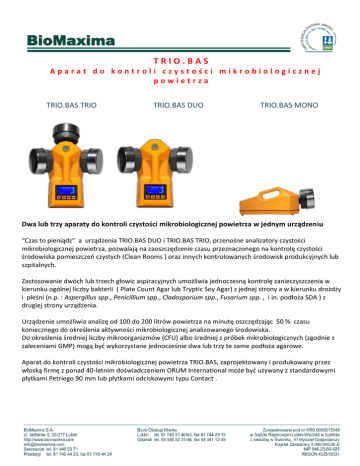 TRIO.BAS Aparat do kontroli czystości mikrobiologicznej powietrza TRIO.BAS TRIO TRIO.BAS DUO TRIO.BAS MONO Dwa lub trzy aparaty do kontroli czystości mikrobiologicznej powietrza w jednym urządzeniu “Czas to pieniądz” a urządzenia TRIO.BAS DUO i TRIO.BAS TRIO, przenośne analizatory czystości mikrobiologicznej powietrza, pozwalają na zaoszczędzenie czasu przeznaczonego na kontrolę czystości środowiska pomieszczeń czystych (Clean Rooms ) oraz innych kontrolowanych środowisk produkcyjnych lub szpitalnych. Zastosowanie dwóch lub trzech głowic aspiracyjnych umożliwia jednoczesną kontrolę zanieczyszczenia w kierunku ogólnej liczby bakterii ( Plate Count Agar lub Tryptic Soy Agar) z jednej strony a w kierunku drożdży i pleśni (n.p. : Aspergillus spp., Penicillium spp., Cladosporium spp., Fusarium spp. , i in. podłoża SDA ) z drugiej strony urządzenia. Urządzenie umożliwia analizę od 100 do 200 litrów powietrza na minutę oszczędzając 50 % czasu koniecznego do określenia aktywności mikrobiologicznej analizowanego środowiska. Do określenia średniej liczby mikroorganizmów (CFU) albo średniej z próbek mikrobiologicznych (zgodnie z zaleceniami GMP) mogą być wykorzystane jednocześnie dwa lub trzy te same podłoża agarowe. Aparat do kontroli czystości mikrobiologicznej powietrza TRIO.BAS, zaprojektowany i produkowany przez włoską firmę z ponad 40-letnim doświadczeniem ORUM International może być używany z standardowymi płytkami Petriego 90 mm lub płytkami odciskowymi typu Contact . PARAMETRY URZĄDZENIA • • • • • • • • • • • • • • • • • • • • • • • • • • • • • • • • • • • • Do stosowania w warunkach zagrożonych wybuchem, system przeciwwybuchowy wg dyrektywy ATEX ( ver.1 i ver. 2) - opcja Bagnetowa głowica - możliwość wyboru urządzenia z jedną, dwiema lub trzema głowicami aspirującymi Czas i objętość próbkowania : 1.000 litrów powietrza w czasie poniżej 3,5 minuty Głowice do wyboru: - ze stali nierdzewnej - z przezroczystego tworzywa sztucznego PS sterylne, jednorazowe - z tworzywa sztucznego PC nadającego się do sterylizacji, do wielorazowego użycia Automatyczna kalibracja Kontrola poprawności kalibracji na miejscu Brak zewnętrznych połączeń Ładowarka indukcyjna Czytnik RFID Czytnik kodów paskowych Przesyłanie danych za pomocą bluetooth : PC, smartfon, tablet, drukarka Identyfikacja wg GPL/GMP/QM Odporność na pył i wodę zgodnie ze standardem IP65 Wstrząsoodporny Komora próbkowania ze stali nierdzewnej dla wersji Isolator Odporny na działanie środków bakteriobójczych i chemicznych Pilot bluetooth 90 cykli pracy x 1.000 litrów dla każdej głowicy System otwarty dla płytek różnych producentów - możliwość zastosowania płytek odciskowych (RODAC) lub płytek Petriego bez adaptera Wydajność baterii do 100.000 litrów powietrza Łatwy w obsłudze Próbkowanie przy 210° Szybkość przepływu : 100 lub 200 litrów powietrza na minutę dla jednej głowicy 3 niezależne hasła o różnych poziomach dostępu (operator, manager, serwis) Lekkie, przenośne urządzenie łatwe w obsłudze Wyświetlacz alfanumeryczny Próbkowanie sekwencyjne , symultaniczne, interwałowe (przedziałowe) Automatyczny wyłącznik Dokumentacja I.Q, O.Q., P.Q. Zapamiętywanie cykli pracy CFR 21 Alarm niskiego poziomu baterii Wielojęzyczne menu Informacja dotycząca bioaerozolu Dźwiękowa sygnalizacja końca cyklu pracy Sygnalizacja świetlna podczas aspiracji Zgodność z standardami międzynarodowymi · EN 61010-1-2010 Wymagania bezpieczeństwa dotyczące elektrycznych przyrządów pomiarowych, automatyki i urządzeń laboratoryjnych -- Część 1: Wymagania ogólne · EN 61326-1:2006 Wyposażenie elektryczne do pomiarów, sterowania i użytku w laboratoriach -Wymagania dotyczące kompatybilności elektromagnetycznej (EMC) -- Część 1: Wymagania ogólne · EN 62321:2009 Wyroby elektrotechniczne -- Oznaczanie zawartości sześciu substancji podlegających przepisom (ołowiu, rtęci, kadmu, sześciowartościowego chromu, bifenyli polibromowanych, difenylowych eterów polibromowanych) · CERTYFIKACJA ATEX Wg następujących oznakowań: IIG Ex ib IIC T4 Gb IID Ex tb IIIC T135°C Db IP67 ATEX urządzenie dopuszczone do współpracy ze strefami zagrożonymi wybuchem sklasyfikowanych jako strefa 1 · ISO Standard 14698-1 – 2004 Pomieszczenia czyste i związane z nimi środowiska kontrolowane -- Kontrola biozanieczyszczeń -- Część 1: Główne zasady i metody · FDA – 1987 przewodnik FDA dla systemów jakości wytwarzania produktów sterylnych w przemyśle farmaceutycznym · ACGIH – Guideline for Assessment of Bio-aerosol in the Indoor Environment · ASTM – Draft Protocol – Committee D22.05.06 · USP Chapter <1116> Microbiological Evaluation of Clean Rooms and Controlled Environments · EU Guide for GMP – Manufacture of Sterile Medicinal Products Control Medicines and Inspection
