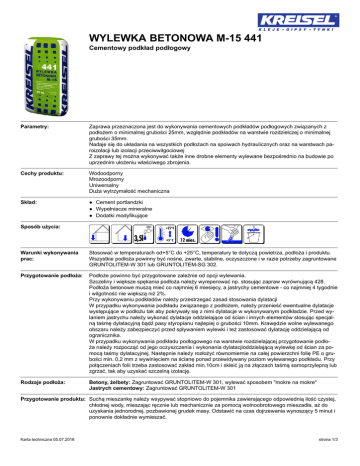 WYLEWKA BETONOWA M-15 441 Cementowy podkład podłogowy Parametry: Zaprawa przeznaczona jest do wykonywania cementowych podkładów podłogowych związanych z podłożem o minimalnej grubości 25mm, względnie podkładów na warstwie rozdzielczej o minimalnej grubości 35mm. Nadaje się do układania na wszystkich podłożach na spoiwach hydraulicznych oraz na warstwach paroizolacji lub izolacji przeciwwilgociowej Z zaprawy tej można wykonywać także inne drobne elementy wylewane bezpośrednio na budowie po uprzednim ułożeniu właściwego zbrojenia. Cechy produktu: Wodoodporny Mrozoodporny Uniwersalny Duża wytrzymałość mechaniczna Skład: ● Cement portlandzki ● Wypełniacze mineralne ● Dodatki modyfikujące Sposób użycia: Warunki wykonywania prac: Stosować w temperaturach od+5°C do +25°C, temperatury te dotyczą powietrza, podłoża i produktu. Wszystkie podłoża powinny być nośne, zwarte, stabilne, oczyszczone i w razie potrzeby zagruntowane GRUNTOLITEM-W 301 lub GRUNTOLITEM-SG 302. Przygotowanie podłoża: Podłoże powinno być przygotowane zależnie od opcji wylewania. Szczeliny i większe spękania podłoża należy wyreperować np. stosując zapraw wyrównującą 428. Podłoża betonowe muszą mieć co najmniej 6 miesięcy, a jastrychy cementowe - co najmniej 4 tygodnie i wilgotność nie większą niż 2%. Przy wykonywaniu podkładów należy przestrzegać zasad stosowania dylatacji W przypadku wykonywania podkładu związanego z podłożem, należy przenieść ewentualne dylatacje występujące w podłożu tak aby pokrywały się z nimi dylatacje w wykonywanym podkładzie. Przed wylaniem jastrychu należy wykonać dylatacje oddzielające od ścian i innych elementów stosując specjalną taśmę dylatacyjną bądź pasy styropianu najlepiej o grubości 10mm. Krawędzie wolne wylewanego obszaru należy zabezpieczyć przed spływaniem wylewki i też zastosować dylatację oddzielającą od ogranicznika. W przypadku wykonywania podkładu podłogowego na warstwie rozdzielającej przygotowanie podłoża należy rozpocząć od jego oczyszczenia i wykonania dylatacjioddzielającą wylewkę od ścian za pomocą taśmy dylatacyjnej. Następnie należy rozłożyć równomiernie na całej powierzchni folię PE o grubości min. 0,2 mm z wywinięciem na ścianę ponad przewidywany poziom wylewanego podkładu. Przy połączeniach folii trzeba zastosować zakład min.10cm i skleić ją na złączach taśmą samoprzylepną lub zgrzać, tak aby uzyskać szczelną izolację. Rodzaje podłoża: Betony, żelbety: Zagruntować GRUNTOLITEM-W 301, wylewać sposobem "mokre na mokre" Jastrych cementowy: Zagruntować GRUNTOLITEM-W 301 Przygotowanie produktu: Suchą mieszankę należy wsypywać stopniowo do pojemnika zawierającego odpowiednią ilość czystej, chłodnej wody, mieszając ręcznie lub mechanicznie za pomocą wolnoobrotowego mieszadła, aż do uzyskania jednorodnej, pozbawionej grudek masy. Odstawić na czas dojrzewania wynoszący 5 minut i ponownie dokładnie wymieszać. Karta techniczna 05.07.2016 strona 1/3 WYLEWKA BETONOWA M-15 441 Cementowy podkład podłogowy W przypadku potrzeby wykorzystania części opakowania, całą suchą mieszankę należy starannie wymieszać, gdyż w czasie transportu mogło nastąpić rozdzielenie składników. Stwardniałej zaprawy nie mieszać z woda, ani ze świeżym materiałem. Sposób użycia: Przygotowaną zaprawę należy układać, najczęściej pomiędzy listwami kierunkowymi, warstwą o grubości uzależnionej od rodzaju konstrukcji podłogi oraz ściśliwości warstwy izolacji termicznej lub akustycznej. Nadmiar zaprawy ściągnąć łatą po prowadnicach i po wstępnym zwiazaniu zatrzeć powierzchnię pacą. W przypadku dużych obciążeń podłogi, znacznych wahań temperatury, podłóg na stropach z elementów prefabrykowanych w pomieszczeniach o zwiększonej intensywności eksploatacji, przy układaniu podkładu na warstwie izolacji termicznej lub akustycznej o dużej odkształcalności, a także w celu zmniejszenia liczby dylatacji przeciwskurczowych, stosuje się zbrojenie podkładów Uwagi wykonawcze: Wylewkę chronić przez pierwsze 7 dni od jej wykonania przed nadmiernym nasłonecznieniem, zbyt wysoką temperaturą, silnym wiatrem i wodą (opadami) oraz ujemnymi temperaturami (minimalna temperatura schnięcia to 5˚C). Niedozwolone jest suszenie wylewki przy użyciu dmuchaw ciepłego powietrza. Warunki takie należy zachować także w trakcie prowadzenia prac. Nie wyklucza się powstawania spękań i rys w przypadku zastosowania wylewki na spękanych lub odkształcalnych podłożach. Przy wykonywaniu podkładów należy przestrzegać zasad stosowania szczelin dylatacyjnych: konstrukcyjnych, izolacyjnych i przeciwskurczowych. Szczeliny dylatacyjne konstrukcyjne należy stosować w miejscach przebiegu dylatacji konstrukcji budynku oraz w przypadkach konieczności wyeliminowania wpływu rozszerzalności cieplnej materiałów. Szczeliny izolacyjne należy stosować w celu oddzielenia podłogi od innych elementów budynku (ścian, słupów, schodów, itp.) mogących ograniczać ruchy podłogi. Stosuje się je także w miejscach zmiany grubości podkładu, w miejscach styku różnych podłóg oraz w celu wydzielenia prostokątnych pól podkładu w pomieszczeniach o skomplikowanym kształcie. 2 Szczeliny przeciwskurczowe powinny dzielić powierzchnię na pola nie większe niż: 30m przy długo2 ści boku do 6 m w pomieszczeniach wewnętrznych, 20m przy długości boków nie większej niż 5 m – w pomieszczeniach z ogrzewaniem podłogowym, 40m² przy długości boku nie przekraczającej 8m – w pomieszczeniach z ogrzewaniem podłogowymi, gdy zastosowano zbrojenie przeciwskurczowe (rozwiązanie zalecane). W korytarzu rozstaw szczelin przeciwskurczowych nie powinien przekraczać 2-2,5-krotnej jego szerokości. Dylatacje jastrychów wykonywanych na tarasach należy rozmieszczać co 2-2,5m, w zależności od nasłonecznienia 