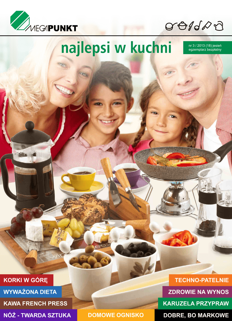 nr 3 / 2013 (18) jesień egzemplarz bezpłatny KORKI w GÓRĘ TECHNO-PATELNIE WYWAŻONA DIETA ZDROWIE NA WYNOS Kawa FRENCH PRESS NÓŻ - TWARDA SZTUKA KARUZELA PRZYPRAW DOMOWE OGNISKO DOBRE, BO MARKOWE KAWA FRENCH PRESS DOMOWE OGNISKO Zapraszam do jesienno-zimowego wydania naszego magazynu. Zanim dowiecie się, co w kuchni piszczy, koniecznie sięgnijcie po małą czarną. Dodatkowo uprzyjemni Wam lekturę! Czy wiedzieliście, że nie tylko Włosi mają swój sposób na kawę? Francuzi używają zaparzaczy typu French press, takich jak VERONA znanej na całym świecie holenderskiej marki RANDWYCK, teraz do kupienia w promocji. Zaparzacz VERONA To określenie odwołuje się do czasów, gdy ludzie gromadzili się wokół ognia, aby się rozgrzać lub przygotować ciepły posiłek. Ogień budził w nich też poczucie bezpieczeństwa. Dziś w odmienionej, nowoczesnej formie powrócić możemy do korzeni i nadać spotkaniom uroku, zastępując ognisko naszych przodków podgrzewaczem GEJZER. 3 2 • żaroodporne szkło • słabo przewodząca ciepło obudowa • wygodny uchwyt 1 RA-X*VE-081400 Pojemność 1l PROMOCJA RA-X*VE-031400 Pojemność 350 ml 5 99 69 6 4 75 49 PLN PLN NIEMIECKA PORCELANA kubki, filiżanki, talerze i dodatki -20% 1.Kawę przechowuj w szczelnym pojemniku i dozuj precyzyjną miarką. 2.Wsyp średnio lub grubo zmieloną kawę do zaparzacza i zalej wrzątkiem. 3.Zamknij pokrywę. Tłok pozostaw w pozycji uniesionej do góry i poczekaj. 4.Gdy kawa opadnie, POWOLI dociśnij tłok, by fusy nie przemknęły bokiem. 5.Kawa jest już gotowa do spożycia. Teraz wystarczy przelać ją do filiżanki. 6. Producenci kaw zalecają podgrzane filiżanki z grubej porcelany. Polecamy porcelanowe filiżanki serii PROFI i TRIC niemieckiej firmy ARZBERG. Spis treści: SŁUPSK GDAŃSK OLSZTYN BYDGOSZCZ POZNAŃ WŁOCŁAWEK PŁOCK WARSZAWA ZIELONA GÓRA ŁÓDŹ WROCŁAW BIELSKO-BIAŁA KRAKÓW Zapraszamy też na: www.megapunkt.pl Kawa french press 02 domowe ognisko 03 techno-patelnie 04-05 karuzela przypraw 06-07 dobre, bo markowe 08 produkty spod dobrego znaku 09 nóż - twarda sztuka! 10-11 korki w górę 12-13 zdrowie na wynos 14 wyważona dieta 15 Bielsko-Biała: Gemini Park 33 484-08-01; Bydgoszcz: Drukarnia 664-310-055; Gdańsk: Galeria Bałtycka 58 520-24-04; Kraków: Bonarka City Center 12 298-63-47, Galeria Krakowska 12 628-78-54; Łódź: Galeria Łódzka 42 634-67-86, Manufaktura 42 632-42-55; Olsztyn: Manhattan 664-310-054; Płock: Mazovia 24 367-85-65; Poznań: Plaza 61 656-33-38; Słupsk: Jantar 59 845-56-02; Warszawa: Hala Mirowska 22 654-20-30 w.11, M1 Marki 22 781-24-86; Sadyba Best Mall 22 370-39-50, Wola Park 22 533-41-49, Maximus (Nadarzyn) 22 345-31-00; Wrocław: Galeria Dominikańska 71 344-85-90; Zielona Góra: Focus Mall 68 410-71-23. Zapach ciepłego posiłku roznosi się wokół stołu, kusząc domowników i gości. Płomień tworzy nastrojową atmosferę, wnosząc ciepło w jesienno-zimowe wieczory. Wyjątkowy klimat to zasługa podgrzewacza GEJZER - małego palnika gazowego ze statywem, na którym umieszczamy dowolne naczynie do podgrzewania lub gotowania (w przypadku ceramiki i żaroodpornego szkła, pamiętajmy o płytce dyfuzyjnej!). Palnik ma regulację płomienia. W czasie posiłku mała nastawa utrzyma temperaturę potraw: mięs, sosów, bigosu, warzyw lub deseru. Ciepłe lepiej RM B315-ST Podgrzewacz gazowy GEJZER ze statywem smakują i wybornie pachną. To rozwiązanie wygodne i efektowne: na dużym przyjęciu, spotkaniu rodzinnym i Wykorzystuj palnik efektywnie – używaj: romantycznej kolacji we dwoje. Podgrzewacz jest przy tym bezpieczny • małych garnków, by nie wytwarzać zbędnego ciepła; nie odparzy stołu, a gumowana podstawa zapobiega jego przesuwaniu • garnków z cienkim dnem, które szybciej się nagrzewają; się na blacie. Przy średnim płomieniu palnik działa ponad 1,5 godziny. • pokrywy, by szybciej podgrzać zawartość Większy płomień może być użyty do prac kuchennych. Zrobiliśmy test. • po zagotowaniu zmniejsz nastawę palnika! Do rondelka o szerokości statywu wlaliśmy wodę (1l). Po zagotowaniu (20 min) zmniejszyliśmy nastawę o połowę. Gazu starczyło na 45 min. gotowania. Na palniku możemy nie tylko podgrzać mleko, zagotować wodę, zaparzyć kawę, czy ugotować jajka, ale nawet – przyrządzić szybką zupę. Warto go mieć na wyjazdach, przystanku w trasie, ale i w domu gdy mamy kuchnię elektryczną i akurat zabraknie prądu. Sprawdzi się też w popularnym wspólnym gotowaniu z przyjaciółmi. Palniki GEJZER mogą mieć też inne zastosowania np. w laboratorium do podgrzania probówki lub do sterylizacji. Uruchamia się je, przekręcając regulator płomienia przeciwnie do ruchu wskazówek zegara aż usłyszymy syczenie i zapalając zapałką lub zapalarką. Następnie ustawiamy wielkość płomienia. Dzięki długiemu wysięgnikowi (SZKŁO) NIE PĘKAJ! jest to łatwe, nawet, gdy palnik znajduje się pod statywem. Żaroodporne szkło nierównomiernie Gasząc płomień przekręcamy regulator zgodnie z ruchem się rozgrzewa i umieszczone nad wskazówek zegara do całkowitego zamknięcia wypływu gazu. ogniem może pękać. Zapobiega temu Pusty zbiornik możemy napełnić sami używając pojemnika z płytka dyfuzyjna SIMAX (SX 6151), oddzielając płomień od naczynia. Ogień gazem do zapalniczek (kieruj się instrukcją podgrzewacza). nie może wychodzić poza płytkę. KRÓLEWSKIE NACZYNIA Z PODGRZEWACZEM Do podtrzymania temperatury dań służą też podgrzewacze świeczkowe REGENT. Wkłady typu tea light wstawia się w metalowe podstawki zapobiegające wyciekaniu wosku i umieszcza na statywie ze stali nierdzewnej 18/10. Nad nimi ustawiamy ciepłe danie w żaroodpornym naczyniu odpornym na temp. do 240 st. C. Podgrzewacze REGENT to kilka linii, a w ramach każdej szeroki wybór modeli różniących się rozmiarem, kształtem, pojemnością i budową (jedno- lub dwukomorowe). Możemy wybrać je kierując się