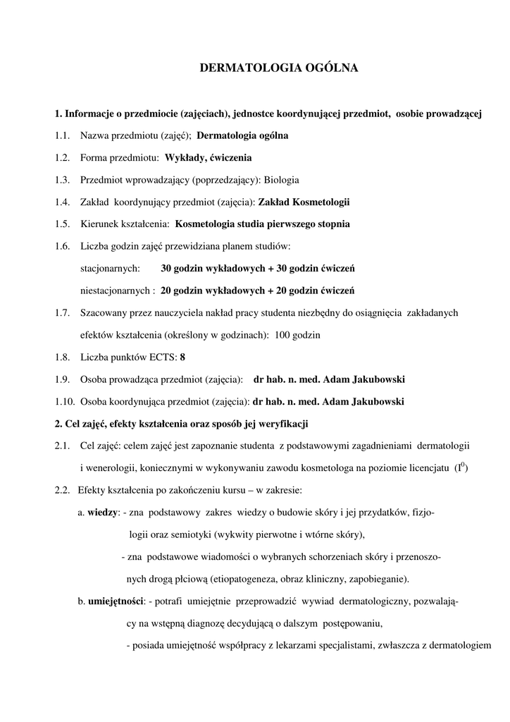 DERMATOLOGIA OGÓLNA 1. Informacje o przedmiocie (zajęciach), jednostce koordynującej przedmiot, osobie prowadzącej 1.1. Nazwa przedmiotu (zajęć); Dermatologia ogólna 1.2. Forma przedmiotu: Wykłady, ćwiczenia 1.3. Przedmiot wprowadzający (poprzedzający): Biologia 1.4. Zakład koordynujący przedmiot (zajęcia): Zakład Kosmetologii 1.5. Kierunek kształcenia: Kosmetologia studia pierwszego stopnia 1.6. Liczba godzin zajęć przewidziana planem studiów: stacjonarnych: 30 godzin wykładowych + 30 godzin ćwiczeń niestacjonarnych : 20 godzin wykładowych + 20 godzin ćwiczeń 1.7. Szacowany przez nauczyciela nakład pracy studenta niezbędny do osiągnięcia zakładanych efektów kształcenia (określony w godzinach): 100 godzin 1.8. Liczba punktów ECTS: 8 1.9. Osoba prowadząca przedmiot (zajęcia): dr hab. n. med. Adam Jakubowski 1.10. Osoba koordynująca przedmiot (zajęcia): dr hab. n. med. Adam Jakubowski 2. Cel zajęć, efekty kształcenia oraz sposób jej weryfikacji 2.1. Cel zajęć: celem zajęć jest zapoznanie studenta z podstawowymi zagadnieniami dermatologii i wenerologii, koniecznymi w wykonywaniu zawodu kosmetologa na poziomie licencjatu (I0) 2.2. Efekty kształcenia po zakończeniu kursu – w zakresie: a. wiedzy: - zna podstawowy zakres wiedzy o budowie skóry i jej przydatków, fizjologii oraz semiotyki (wykwity pierwotne i wtórne skóry), - zna podstawowe wiadomości o wybranych schorzeniach skóry i przenoszonych drogą płciową (etiopatogeneza, obraz kliniczny, zapobieganie). b. umiejętności: - potrafi umiejętnie przeprowadzić wywiad dermatologiczny, pozwalający na wstępną diagnozę decydującą o dalszym postępowaniu, - posiada umiejętność współpracy z lekarzami specjalistami, zwłaszcza z dermatologiem i wenerologiem, - ma świadomość korzystania z piśmiennictwa dermatologicznego, c. kompetencji społecznych - zna przepisy bezpieczeństwa i higieny pracy pozwalające na zapobieganie przenoszenia się chorób o etiologii zakaźnej na personel gabinetu kosmetycznego i korzystających z jego usług klientów, - umie wykorzystać posiadaną wiedzę do propagowania zdrowego, higienicznego trybu życia. 2.3. Sposób weryfikacji (oceny) efektów kształcenia: - systematyczne (15 minutowe) sprawdzanie zdobytej wiedzy poprzez zaliczenie ostatniej partii przerobionego na ćwiczeniach materiału w formie testu lub „kartkówki”, - egzamin w formie pisemnej testowej, poprawne udzielenie odpowiedzi na 60% zadanych pytań. 3. Treści kształcenia – tematyka poszczególnych zajęć oraz liczba godzin zajęć dotyczących danego tematu: A. Studia stacjonarne Wykłady: 1. Budowa, fizjologia, melanogeneza i immunologia skóry . Semiotyka skóry – 3 godziny 2. Podstawy diagnostyki chorób skóry i przenoszonych drogą płciową (wywiad dermatologiczny i badanie dermatologiczne), podstawy lecznictwa dermatologicznego – 3 godziny 3. Rodzaje skóry, przyczyny zewnętrzne i wewnętrzne jej starzenia się – 2 godziny 4. Podział kliniczny chorób skóry – 1 godzina 5. Choroby autoimmunologiczne skóry (pęcherzyce i kolagenozy) – 3 godziny 5. Choroby alergiczne skóry – 3 godziny 7. Znamiona, nowotwory łagodne, stany przedrakowe i raki skóry – 3 godziny 8. Zmiany rumieniowe i grudkowe skóry – 3 godziny 9. Choroby układu naczyniowego i barwnikowego skóry – 2 godziny 10. Choroby przenoszone drogą płciową – kiła, rzeżączka, NGU, HIV/AIDS – 7 godzin Ćwiczenia: 1. Choroby ropne skóry, choroby skóry wywoływane przez inne drobnoustroje – 3 godziny 2. Gruźlica, choroby pasożytnicze skóry – 3 godziny 3. Grzybice i drożdżyce skóry – 3 godziny 4. Choroby wirusowe skóry- 3 godziny 5. Łuszczyca i inne zaburzenia rogowacenia skóry – 3 godziny 6. Choroby gruczołów potowych i łojowych (łojotokowe zapalenie skóry, trądzik zwykły i różowaty) – 3 godziny 7. Objawy niepożądanego działania leków i kosmetyków – 3 godziny 8. Wybrane choroby włosów i paznokci – 3 godziny 9. Wpływ czynników zewnętrznych i niektórych chorób wewnętrznych na skórę – 3 godziny 10. Seminarium z wybranych przez studentów problemów skóry i chorób przenoszonych drogą płciową. Zaliczenie ćwiczeń – 3 godziny B. Studia niestacjonarne Wykłady: 1. Budowa, fizjologia, melanogeneza i immunologia skóry. Semiotyka skóry – 3 godziny 2. Rodzaje skóry i jej starzenie się. Podstawy diagnostyki chorób skóry i przenoszonych drogą płciową (wywiad i badanie dermatologiczne), podstawy lecznictwa dermatololicznego – 2 godziny 3. Choroby autoimmunologiczne (pęcherzowe i kolagenozy) i alergiczne skóry – 3 godziny 4. Znamiona, nowotwory łagodne, stany przedrakowe i raki skóry – 3 godziny 5. Zmiany rumieniowe i grudkowe skóry – 3 godziny 6. Choroby układu naczyniowego skóry – 2 godziny 7, Choroby przenoszone drogą płciową (kiła, rzeżączka, NGU, HIV/AIDS) – 4 godziny Ćwiczenia: 1. Choroby ropne skóry i wywoływane przez inne drobnoustroje. Gruźlica skóry – 3 godziny 2. Grzybice, drożdżyce i choroby pasożytnicze skóry – 2 godziny 3. Choroby wirusowe skóry – 2 godziny 4. Łuszczyca i inne choroby z zaburzeniami rogowacenia – 2 godziny 5. Choroby gruczołów łojowych i potowych – 3 godziny 6. Wybrane choroby włosów i paznokci – 3 godziny 7. Wpływ czynników zewnętrznych i niektórych chorób wewnętrznych oraz leków i kosmetyków na skórę – 3 godziny 8. Wybrane choroby układu barwnikowego skóry. Zaliczenie ćwiczeń – 2 godziny 4. Literatura a. podstawowa: 1. Adamski Z., Kaszuba A (red.).: Dermatologia dla kosmetologów, Elsevier Urban & Partner, Wrocław, 2010. 2. Nowicka D.: Dermatologia – podręcznik dla studentów kosmetologii, Wydawnictwo Medyczne W. Górnicki, Wrocław, 2007. 3. Jabłońska S., Majewski S.: Choroby skóry i choroby przenoszone drogą płciową, PZWL, Warszawa, 2005. b. uzupełniająca: 1. Sterry W.S. Paus R., Burgdorf W.: Dermatologia, Czele
