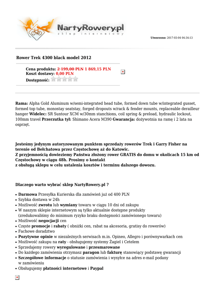Utworzono: 2017-03-04 04:34:13 Rower Trek 4300 black model 2012 Cena produktu: 2 199,00 PLN 1 869,15 PLN Koszt dostawy: 0,00 PLN Dostępność: Rama: Alpha Gold Aluminum w/semi-integrated head tube, formed down tube w/integrated gusset, formed top tube, monostay seatstay, forged dropouts w/rack & fender mounts, replaceable derailleur hanger Widelec: SR Suntour XCM w/30mm stanchions, coil spring & preload, hydraulic lockout, 100mm travel Przerzutka tył: Shimano Acera M390 Gwarancja: dożywotnia na ramę i 2 lata na osprzęt. Jesteśmy jedynym autoryzowanym punktem sprzedaży rowerów Trek i Garry Fisher na terenie od Bełchatowa przez Częstochowę aż do Katowic. Z przyjemnością dowieziemy Państwa złożony rower GRATIS do domu w okolicach 15 km od Częstochowy w ciągu 48h. Prosimy o kontakt z obsługą sklepu w celu ustalenia kosztów i terminu dalszego dowozu. Dlaczego warto wybrać sklep NartyRowery.pl ? ● ● ● ● ● ● ● ● ● ● ● ● ● Darmowa Przesyłka Kurierska dla zamówień już od 400 PLN Szybka dostawa w 24h Możliwość zwrotu lub wymiany towaru w ciągu 10 dni od zakupu W naszym sklepie internetowym są tylko aktualnie dostępne produkty (zredukowaliśmy do minimum ryzyko braku dostępności zamówionego towaru) Możliwość negocjacji cen Częste promocje i rabaty ( obniżki cen, rabat na akcesoria, gratisy do rowerów) Fachowe doradztwo Pozytywne opinie w niezależnych serwisach m.in. Opineo, Allegro i porównywarkach cen Możliwość zakupu na raty - obsługujemy systemy Żagiel i Cetelem Sprzedajemy rowery wyregulowane i przesmarowane Do każdego zamówienia otrzymasz paragon lub fakturę stanowiący podstawę gwarancji Szczegółowe informacje o statusie zamówienia i wysyłce na adres e-mail podany w zamówieniu Obsługujemy płatności internetowe i Paypal Dołożono wszelkich starań, aby opisy i zdjęcia produktów były dokładne i aktualne. Specyfikacje i ceny mogą ulec zmianie bez uprzedzenia Płeć Przeznaczenie Widelec/ amortyzator Manetki Przerzutka przód Przerzutka tył Męski Górski / MTB SR Suntour XCM w/30mm stanchions, coil spring & preload, hydraulic lockout, 100mm travel Shimano Acera M390, 9 speed Shimano Acera Shimano Acera M390 Kaseta/ wolnobieg Shimano HG20-9 11-34, 9 speed Korbowód Pedały Hamulce Shimano Acera M391, 44/32/22 brak Tektro linear-pull brakes w/Tektro levers Piasta przód Formula FM21 alloy Piasta tył Shimano RM30 alloy Obręcze Bontrager Camino 32-hole Szprychy b.d. Kolekcja 2012 Opony Bontrager LT3, 26x2.0" Stery Bontrager LT3, 26x2.0" Mostek Kierownica Bontrager Race Lite, 31.8mm Bontrager Low Riser OS, 31.8mm, 15mm rise, 9 degree sweep Chwyty b.d. Siodło Bontrager Evoke 1 Sztyca Bontrager SSR, 31.6mm, 20mm offset Waga - Rama Alpha Gold Aluminum w/semi-integrated head tube, formed down tube w/integrated gusset, formed top tube, monostay seatstay, forged dropouts w/rack & fender mounts, replaceable derailleur hanger Hamulce V-Brake Damper brak Pegi brak Łańcuch Gwarancja Ilość biegów brak danych dożywotnia na ramę i 2 lata na osprzęt 27 Adres: http://nartyrowery.pl/ Telefon: 34 365 66 09, 793 61 04 29 Email: [email protected] Gadu-Gadu: Skype: