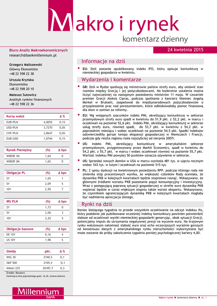 24 kwietnia 2015 Biuro Analiz Makroekonomicznych [email protected] Informacje na dziś Grzegorz Maliszewski Główny Ekonomista +48 22 598 22 38 EU: Dziś zostanie opublikowany indeks IFO, który opisuje koniunkturę w niemieckiej gospodarce w kwietniu. Wydarzenia i komentarze Urszula Kryńska Ekonomistka +48 22 598 20 10 GR: Dziś w Rydze spotkają się ministrowie państw strefy euro, aby omówić stan rozmów między Grecją i jej pożyczkodawcami. Na konkretne ustalenia można liczyć najwcześniej na następnym posiedzeniu ministrów 11 maja. W czwartek premier Grecji Aleksis Cipras, podczas spotkania z kanclerz Niemiec Angelą Merkel w Brukseli, zaapelował do międzynarodowych pożyczkodawców o przyspieszenie prac nad porozumieniem, które odblokowałoby pomoc finansową dla Aten w zamian za reformy. EU: Wg wstępnych szacunków indeks PMI, określający koniunkturę w sektorze przemysłowym strefy euro spadł w kwietniu do 51,9 pkt. z 52,2 pkt. w marcu i oczekiwań na poziomie 52,6 pkt. Indeks PMI, określający koniunkturę w sektorze usług strefy euro, również spadł, do 53,7 pkt. w kwietniu z 54,2 pkt. w poprzednim miesiącu i wobec oczekiwań na poziomie 54,5 pkt. Spadki indeksów odzwierciedliły gorsze tempo ekspansji gospodarczej w Niemczech i Francji, podczas gdy reszta regionu rosła najszybciej od sierpnia 2007r. US: Indeks PMI, określający koniunkturę w amerykańskim sektorze przemysłowym, przygotowywany przez Markit Economics, spadł w kwietniu do 54,2 pkt. z 55,7 pkt. w marcu i wobec oczekiwań również na poziomie 55,7 pkt. Wartość indeksu PMI powyżej 50 punktów oznacza ożywienie w sektorze. US: Sprzedaż nowych domów w USA w marcu wyniosła 481 tys. w ujęciu rocznym wobec 543 tys. w lutym i oczekiwań na poziomie 515 tys. PL: Z opisu dyskusji na kwietniowym posiedzeniu RPP, podczas którego rada nie zmieniła stóp procentowych wynika, że większość członków Rady oceniała, że dynamika PKB w kolejnych kwartałach będzie stopniowo rosnąć. Wskazywano, że głównymi źródłami wzrostu PKB pozostanie popyt konsumpcyjny i inwestycyjny. Wraz z postępującą poprawą sytuacji gospodarczej w strefie euro dynamikę PKB wspierać będzie w coraz większym stopniu także wzrost eksportu. Wskazywano, że czynnikiem ograniczającym dynamikę PKB w kolejnych kwartałach mogłaby być nadmierna aprecjacja złotego. Mateusz Sutowicz Analityk rynków finansowych +48 22 598 22 36 Kursy walut Δ% EUR/PLN 4,0055 0,1% USD/PLN 3,7270 0,0% CHF/PLN 3,8647 0,0% EUR/USD 1,0744 0,1% Rynek Pieniężny (%) Δ bps WIBOR 1M 1,64 0 WIBOR 3M 1,65 0 Obligacje PL (%) Δ bps 2Y 1,65 1 5Y 2,09 5 10Y 2,50 7 IRS PLN (%) Δ bps 2Y 1,73 0 5Y 2,00 3 10Y 2,25 5 Obligacje bazowe (%) Δ bps DE 10Y 0,16 4 US 10Y 1,98 5 Giełdy pkt. Δ% WIG 30 2740,5 0,1 S&P 500 2105,4 -0,1 Nikkei 225 20187,7 0,3 Rynki na dziś Koniec bieżącego tygodnia to przede wszystkim oczekiwanie na odczyt indeksu Ifo, który podobnie jak publikowane wcześniej indeksy koniunktury powinien potwierdzić słabsze od oczekiwań wyniki niemieckiej gospodarki generując, obok sytuacji Grecji, potencjalny impuls do utrzymania negatywnej presji na wycenie euro. Na krajowym rynku walutowym natomiast słabość euro oraz echo wczorajszych wyraźnie gorszych od konsensusu danych z amerykańskiego rynku nieruchomości wykorzystana być może zostanie do próby zakończenia tygodnia poniżej psychologicznej bariery 4,00. Źródło: Reuters Zamknięcia dnia poprzedniego godz. 16.30, zmiana dzienna `Makro i rynek komentarz dzienny str. 1 Rynek krajowy Kursy walutowe EUR/PLN i EUR/USD 4,40 1,18 4,35 1,16 4,30 1,14 4,25 1,12 4,20 1,10 4,15 1,08 4,10 4,05 1,06 4,00 1,04 3,95 1,02 EURPLN EURUSD /prawa skala/ Źródło: Reuters Rentowności polskich obligacji [%] 3,0 2,6 2,2 1,8 1,4 Tak jak wskazywaliśmy we wczorajszym wpisie poziom 3,98 pozostaje skuteczną barierą ograniczająca spadek notowań EUR/PLN. W czwartek to właśnie ten opór okazał się być dziennym minimum w notowaniach wspomnianej wcześniej pary. Miniona sesja to jednak najsilniejsza od sześciu tygodni przecena złotego względem euro. Przejściowo kurs EUR/PLN zwyżkował bowiem do poziomu 4,0189. Złoty osłabiał się także względem innych walut. Wczoraj o cztery grosze do 3,74 wzrosły notowania pary USD/PLN. Z najniższego poziomu od 15 stycznia, tj. dnia rezygnacji SNB z bronienia minimalnego kursu wymiany EUR/CHF, zawróciły natomiast notowania pary CHF/PLN. Złoty tracił wczoraj względem szwajcarskiego franka ponad 5 groszy w stosunku do poziomu otwarcia 3,82. Słabszy sentyment inwestycyjny towarzyszył także pozostałych walutom regionu CEE. Węgierski forint trzeci dzień z rzędu tracił na wartości względem euro. Z kolei kurs EUR/TRY zwyżkował do tegorocznego maksimum. Wydarzeniem dnia na krajowym rynku długu niewątpliwie była aukcja sprzedaży obligacji, na której Ministerstwo Finansów sprzedało obligacje OK0717 za 1,19 mld PLN przy popycie nieznacznie przekraczającym 2 mld PLN i rentowności 1,645%, obligacje serii PS0420 za 4,91 mld PLN przy popycie 6,37 mld PLN i rentowności 2,083% oraz papiery WZ0120 za 0,85 mld PLN, popycie 1,39 mld PLN. Planowana łączna podaż obligacji, obniżona o 2 mld w stosunku do maksymalnej oferty wynikającej z pierwotnego planu podaży, wynosiła 5,0 - 7,0 mld PLN. Dodatkowo resort na przetargu uzupełniającym zaoferował obligacje OK0717 za 0,2 mld PLN oraz PS0420 za 0,5 mld PLN. Na krajowym rynku długu dochodowość obligacji kontynuowała zwyżkę rentowności w ślad za rynkami bazowymi oraz kolejnymi, mniej gołębimi od oczekiwań sygnałami z RPP. Wczoraj, poza SPW, zwyżka notowań towarzyszyła także notowaniom stawek IRS oraz FRA. Rynki zagraniczne Spread PL 10Y vs. DE 10Y 2Y 5Y 10Y Mimo, iż wstępne odczyty indeksów PMI ze strefy euro były najważniejszymi punktami czwartkowego kalendarium, to ich wpływ na rynki finansowe pozostał stosunkowo niewiele. Kurs EUR/USD wyznaczy
