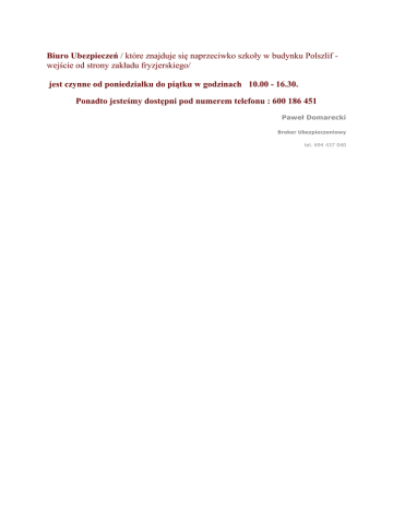Biuro Ubezpieczeń / które znajduje się naprzeciwko szkoły w budynku Polszlif wejście od strony zakładu fryzjerskiego/ jest czynne od poniedziałku do piątku w godzinach 10.00 - 16.30. Ponadto jesteśmy dostępni pod numerem telefonu : 600 186 451 Paweł Domarecki Broker Ubezpieczeniowy tel. 694 437 040
