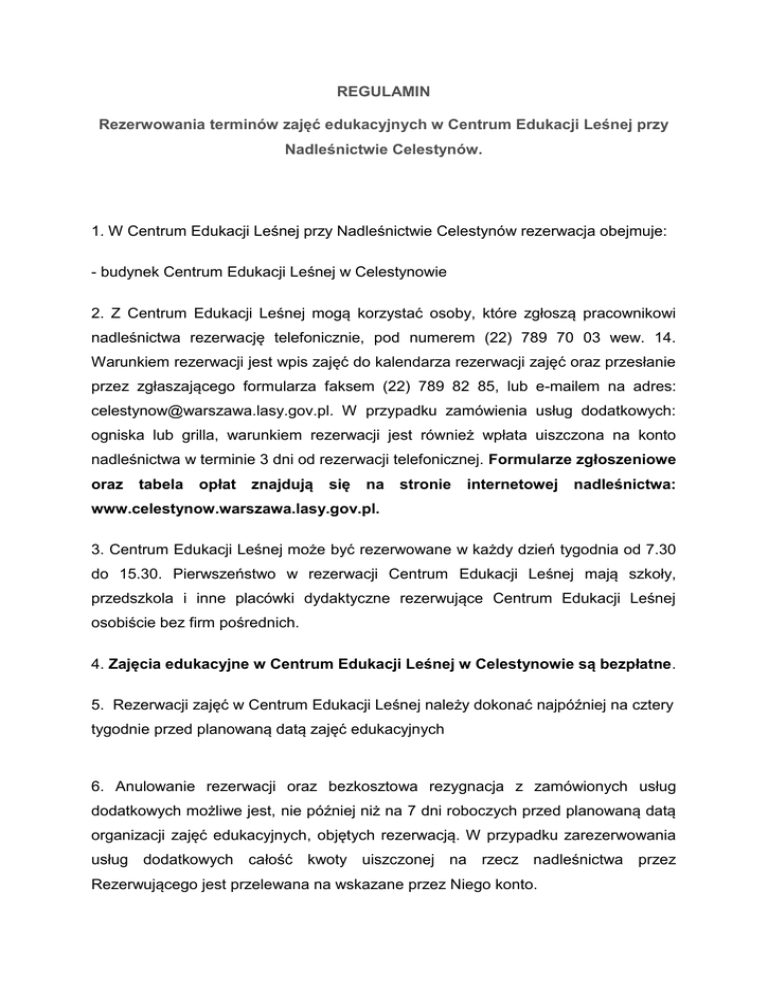 REGULAMIN Rezerwowania terminów zajęć edukacyjnych w Centrum Edukacji Leśnej przy Nadleśnictwie Celestynów. 1. W Centrum Edukacji Leśnej przy Nadleśnictwie Celestynów rezerwacja obejmuje: - budynek Centrum Edukacji Leśnej w Celestynowie 2. Z Centrum Edukacji Leśnej mogą korzystać osoby, które zgłoszą pracownikowi nadleśnictwa rezerwację telefonicznie, pod numerem (22) 789 70 03 wew. 14. Warunkiem rezerwacji jest wpis zajęć do kalendarza rezerwacji zajęć oraz przesłanie przez zgłaszającego formularza faksem (22) 789 82 85, lub e-mailem na adres: [email protected]. W przypadku zamówienia usług dodatkowych: ogniska lub grilla, warunkiem rezerwacji jest również wpłata uiszczona na konto nadleśnictwa w terminie 3 dni od rezerwacji telefonicznej. Formularze zgłoszeniowe oraz tabela opłat znajdują się na stronie internetowej nadleśnictwa: www.celestynow.warszawa.lasy.gov.pl. 3. Centrum Edukacji Leśnej może być rezerwowane w każdy dzień tygodnia od 7.30 do 15.30. Pierwszeństwo w rezerwacji Centrum Edukacji Leśnej mają szkoły, przedszkola i inne placówki dydaktyczne rezerwujące Centrum Edukacji Leśnej osobiście bez firm pośrednich. 4. Zajęcia edukacyjne w Centrum Edukacji Leśnej w Celestynowie są bezpłatne. 5. Rezerwacji zajęć w Centrum Edukacji Leśnej należy dokonać najpóźniej na cztery tygodnie przed planowaną datą zajęć edukacyjnych 6. Anulowanie rezerwacji oraz bezkosztowa rezygnacja z zamówionych usług dodatkowych możliwe jest, nie później niż na 7 dni roboczych przed planowaną datą organizacji zajęć edukacyjnych, objętych rezerwacją. W przypadku zarezerwowania usług dodatkowych całość kwoty uiszczonej na rzecz nadleśnictwa przez Rezerwującego jest przelewana na wskazane przez Niego konto. 7. Rezygnacja z zajęć edukacyjnych musi zostać zgłoszona pracownikowi Nadleśnictwa Celestynów drogą mailową lub faksem. Od daty wpływu pisemnej rezygnacji uzależniony jest ewentualny zwrot opłaty za usługi dodatkowe. 8. W przypadku rezygnacji w terminie późniejszym niż wskazany w pkt 6, Nadleśnictwo Celestynów ma prawo obciążyć Rezerwującego kosztem zamówionych usług dodatkowych. 9. Na zajęcia edukacyjne w Centrum Edukacji Leśnej przyjmowane są grupy do 60 osób. 10. Za bezpieczeństwo uczestników zajęć edukacyjnych organizowanych w Centrum Edukacji Leśnej odpowiedzialność prawną ponoszą opiekunowie grup. 11. Za zniszczenia powstałe podczas trwania zajęć edukacyjnych odpowiadają i ponoszą odpowiedzialność (również materialną) opiekunowie grup, którzy są zobowiązani do ciągłej obecności podczas trwania w / w zajęć. 12. Obowiązkiem uczestników zajęć edukacyjnych jest odpowiednie zabezpieczenie pozostawionych rzeczy osobistych. Nadleśnictwo Celestynów nie ponosi za nie odpowiedzialności. 13. W zakresie spraw nienormowanych niniejszym regulaminem decyzję podejmuje pracownik nadleśnictwa w uzgodnieniu z nadleśniczym Nadleśnictwa Celestynów.
