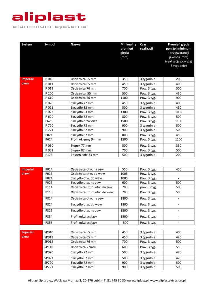 System Symbol Nazwa Minimalny promień gięcia (mm) Czas realizacji Imperial okna IP 010 IP 011 IP 012 IP 200 IP 610 IP 020 IP 021 IP 023 IP 620 IP623 IP 720 IP 721 IP821 IP624 Ościeżnica 55 mm Ościeżnica 65 mm Ościeżnica 76 mm Ościeżnica 55 mm Ościeżnica 76 mm Skrzydło 72 mm Skrzydło 82 mm Skrzydło 93 mm Skrzydło 72 mm Skrzydło drzwiowe Skrzydło 72 mm Skrzydło 82 mm Skrzydło 82 mm Profil okienny 94 mm 350 450 700 500 1100 450 500 1300 800 1500 900 900 800 1500 3 tygodnie 3 tygodnie Pow. 3 tyg. Pow. 3 tyg. Pow. 3 tyg. 3 tygodnie 3 tygodnie Pow. 3 tyg. Pow. 3 tyg. Pow. 3 tyg. 3 tygodnie 3 tygodnie Pow. 3 tyg. Pow. 3 tyg. 200 400 500 450 900 400 450 1005 500 1100 500 500 450 1100 IP 030 IP 031 IP173 Słupek 77 mm Słupek 87 mm Poszerzenie 33 mm 500 700 500 Pow. 3 tyg. Pow. 3 tyg. 3 tygodnie 350 500 200 IP014 IP015 IP024 IP025 IP114 IP115 Ościeżnica otw. na zew Ościeżnica otw. do wew Skrzydło otw. do wew Skrzydło otw. na zew Ościeżnica uzup. otw. na zew. Ościeżnica uzup. otw. do wew 550 1005 1005 600 700 700 Pow. 3 tyg. Pow. 3 tyg. Pow. 3 tyg. Pow. 3 tyg. pow . 3 tyg. Pow. 3 tyg. 450 500 500 500 IP814 Ościeżnica otw. na zew 1800 Pow. 3 tyg. - IP824 Skrzydło otw. do wew 1800 Pow. 3 tyg. - IP825 Skrzydło otw. na zew 1500 Pow. 3 tyg. - IP854 Profil odwracający 1500 Pow. 3 tyg. - IP855 Profil odwracający 500 Pow. 3 tyg. - SP010 SP011 SP012 Ościeżnica 55 mm Ościeżnica 65 mm Ościeżnica 76 mm 450 450 700 3 tygodnie 3 tygodnie Pow. 3 tyg. 400 420 500 SP110 SP020 Ościeżnica 77mm Skrzydło 72 mm 600 500 Pow. 3 tyg. 3 tygodnie 550 470 SP021 SP720 SP721 Skrzydło 82 mm Skrzydło 72 mm Skrzydło 82 mm 500 900 900 3 tygodnie 3 tygodnie 3 tygodnie 470 500 500 Imperial drzwi Superial okna Promień gięcia poniżej minimum (bez gwarancji jakości) (mm) (realizacja powyżej 3 tygodnie) Aliplast Sp. z o.o., Wacława Moritza 3, 20-276 Lublin T: 81 745 50 30 www.aliplast.pl, www.aliplastextrusion.pl SP175 SP030 SP014 Poszerzenie 54 mm Słupek 77 mm Ościeżnica otw. na zew 500 600 1400 Pow. 3 tyg. Pow. 3 tyg. Pow. 3 tyg. 460 550 1300 SP015 Ościeżnica otw. do wew 2500 Pow. 3 tyg. 1600 SP024 SP025 SP815 SP824 Skrzydło otw. do wew. Skrzydło otw. na zew Ościeżnica otw. do wew Skrzydło otw. do wew. 2500 1400 2500 2500 Pow. 3 tyg. Pow. 3 tyg. Pow. 3 tyg. Pow. 3 tyg. 1700 1300 1600 1700 GT010 Ościeżnica 55 mm 550 Pow. 3 tyg. 450 GT011 Ościeżnica 65 mm 700 Pow. 3 tyg. 500 GT020 Skrzydło 77,5 mm 800 Pow. 3 tyg. 520 TL010 TL011 TL012 TL020 TL021 TL022 TL030 TL031 TL032 Ościeżnica 50 mm Ościeżnica 65 mm Ościeżnica 76 mm Skrzydło 67 mm Skrzydło 82 mm Skrzydło 93 mm Słupek 72 mm Słupek 87 mm Słupek 98 mm 350 500 700 500 500 1300 500 700 1000 3 tygodnie 3 tygodnie pow 3 tyg 3 tygodnie 3 tygodnie Pow. 3 tyg. Pow. 3 tyg. Pow. 3 tyg. Pow. 3 tyg. 200 400 500 450 450 1005 450 500 800 TL111 TL720 Ościeżnica ok. 87 mm Skrzydło 72 mm 700 900 Pow. 3 tyg. Pow. 3 tyg. 500 500 TL721 Skrzydło 82 mm 900 Pow. 3 tyg. 500 EL010 EL011 EL215 Ościeżnica 50 mm Ościeżnica 65 mm Ościeżnica drzwi 500 600 1900 3 tygodnie Pow. 3 tyg Pow. 3 tyg 450 480 950 EL224 Skrzydło drzwi 1850 Pow. 3 tyg 900 VL820 Skrzydło 67 mm 1400 Pow. 3 tyg 1300 Ecofutural EF010 Ościeżnica 55 mm 450 Pow. 3 tyg 300 Mc Wall MC010 MC011 MC410 MC413 MC530 MC531 MC532 MC533 Słup 40 mm Słup 69 mm Słup 17 mm Słup 79 mm Rygiel 35 mm Rygiel 78 mm Rygiel 49 mm Rygiel 88 mm 500 550 500 650 500 1600 650 1500 Pow. Pow. Pow. Pow. Pow. Pow. Pow. Pow. 3 tyg. 3 tyg. 3 tyg. 3 tyg. 3 tyg. 3 tyg. 3 tyg. 3 tyg. 450 500 450 600 450 1100 600 1450 MC535 Rygiel 49 mm 600 Pow. 3 tyg. 550 VR2030 Rygiel połaciowy 500 Pow. 3 tyg. 400 DK052N Listwa maskująca 16 mm jak gł. profil Superial drzwi Star okna Triline Econoline - - Aliplast Sp. z o.o., Wacława Moritza 3, 20-276 Lublin T: 81 745 50 30 www.aliplast.pl, www.aliplastextrusion.pl Listwy szklące Szprosy Steel Look DK053 Listwa maskująca 21 mm jak gł. profil - - MC055 Listwa dociskowa jak gł. profil - - MC056 Listwa dociskowa - - MC150 Listwa dociskowa - - MC151 Listwa dociskowa Jak gł. profil jak gł. profil jak gł. profil - - MC156 Listwa maskująca jak gł. profil - - VL61 Listwa szkląca 4 mm 500 - - Vl610 Listwa szkląca 8 mm 500 - - VL611 VL612 VL62 Listwa szkląca 12 mm Listwa szkląca 14 mm Listwa szkląca 16 mm - - VL162 Listwa szkląca 17 mm 500 500 jak gł. profil jak gł. profil - - VL63 Listwa szkląca 20 mm - - VL630 Listwa szkląca 23 mm - - VL64 Listwa szkląca 26 mm - - VL640 Listwa szkląca 30 mm - - VL65 Listwa szkląca 34 mm - - IP564 - - SP065 SP066 SP067 Listwa szkląca 26 mm zamknięta Listwa szkląca 37 mm Listwa szkląca 41 mm Listwa szkląca 45 mm jak gł. profil jak gł. profil jak gł. profil jak gł. profil jak gł. profil 800 400 400 400 - - GL732 Listwa szkląca 32 mm jak gł. profil - - VL68 Szpros 38 mm 450 3 tygodnie 400 VL69 Szpros 30 mm 450 3 tygodnie 400 ST110 Ościeżnica 35 mm 700 Pow. 3 tyg. 670 ST111 ST020 Ościeżnica 35 mm Skrzyło 55 mm 400 700 Pow. 3 tyg. Pow. 3 tyg. 300 670 ST062 Listwa szkląca 16 mm 1500 - - ST162 Listwa szkląca 16 mm - - ST164 Listwa szkląca 12 mm Jak gł.profil 500 - - Aliplast Sp. z o.o., Wacława Moritza 3, 20-276 Lublin T: 81 745 50 30 www.aliplast.pl, www.aliplastextrusion.pl ST165 Listwa szkląca 8 mm 500 - - ST060 Profil uzupełniający Jak gł. profil - - Visofold DV18 Ościeżnica drzwi harmonijkowych 1100 Pow. 3 tyg. 1000 Slide Plus SL010 Rama drzwi , okna 50 mm 1800 Pow. 3 tyg. 1600 SL110 Ościeżnica drzwi przesuwne 1800 Pow. 3 tyg. 1600 SL020 Skrzydło okienne 67 mm 1800 Pow. 3 tyg. 1600 SL1020 Skrzydło drzwi przesuwne 1800 Pow. 3 tyg. 1600 VG10 Ościeżnica drzwi przesuwne 99 mm 4900 Pow. 3 tyg. 4500 VG12 Listwa do progu Pow. 3 tyg. - VG20 Skrzydło drzwi przesuwne jak gł. profil 4400 Pow. 3 tyg. 4000 AF70P01 Ościeżnica okienna 1200 pow. 3 tyg. 800 GL08 Listwa szkląca 4 mm 500 - - K50x3 Kątownik aluminiowy 50x50x3 700 Pow. 3 tyg. 600 KN 20x 30x2 Kątownik aluminiowy 20x30x2