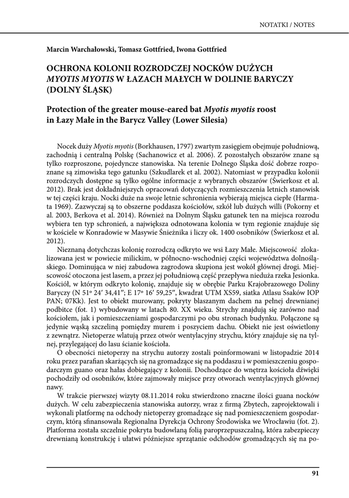 NOTATKI / NOTES Marcin Warchałowski, Tomasz Gottfried, Iwona Gottfried OCHRONA KOLONII ROZRODCZEJ NOCKÓW DUŻYCH MYOTIS MYOTIS W ŁAZACH MAŁYCH W DOLINIE BARYCZY (DOLNY ŚLĄSK) Protection of the greater mouse-eared bat Myotis myotis roost in Łazy Małe in the Barycz Valley (Lower Silesia) Nocek duży Myotis myotis (Borkhausen, 1797) zwartym zasięgiem obejmuje południową, zachodnią i centralną Polskę (Sachanowicz et al. 2006). Z pozostałych obszarów znane są tylko rozproszone, pojedyncze stanowiska. Na terenie Dolnego Śląska dość dobrze rozpoznane są zimowiska tego gatunku (Szkudlarek et al. 2002). Natomiast w przypadku kolonii rozrodczych dostępne są tylko ogólne informacje z wybranych obszarów (Świerkosz et al. 2012). Brak jest dokładniejszych opracowań dotyczących rozmieszczenia letnich stanowisk w tej części kraju. Nocki duże na swoje letnie schronienia wybierają miejsca ciepłe (Harmata 1969). Zazwyczaj są to obszerne poddasza kościołów, szkół lub dużych willi (Pokorny et al. 2003, Berkova et al. 2014). Również na Dolnym Śląsku gatunek ten na miejsca rozrodu wybiera ten typ schronień, a największa odnotowana kolonia w tym regionie znajduje się w kościele w Konradowie w Masywie Śnieżnika i liczy ok. 1400 osobników (Świerkosz et al. 2012). Nieznaną dotychczas kolonię rozrodczą odkryto we wsi Łazy Małe. Miejscowość zlokalizowana jest w powiecie milickim, w północno-wschodniej części województwa dolnośląskiego. Dominująca w niej zabudowa zagrodowa skupiona jest wokół głównej drogi. Miejscowość otoczona jest lasem, a przez jej południową część przepływa nieduża rzeka Jesionka. Kościół, w którym odkryto kolonię, znajduje się w obrębie Parku Krajobrazowego Doliny Baryczy (N 51º 24′ 34,41″; E 17º 16′ 59,25″, kwadrat UTM XS59, siatka Atlasu Ssaków IOP PAN; 07Kk). Jest to obiekt murowany, pokryty blaszanym dachem na pełnej drewnianej podbitce (fot. 1) wybudowany w latach 80. XX wieku. Strychy znajdują się zarówno nad kościołem, jak i pomieszczeniami gospodarczymi po obu stronach budynku. Połączone są jedynie wąską szczeliną pomiędzy murem i poszyciem dachu. Obiekt nie jest oświetlony z zewnątrz. Nietoperze wlatują przez otwór wentylacyjny strychu, który znajduje się na tylnej, przylegającej do lasu ścianie kościoła. O obecności nietoperzy na strychu autorzy zostali poinformowani w listopadzie 2014 roku przez parafian skarżących się na gromadzące się na poddaszu i w pomieszczeniu gospodarczym guano oraz hałas dobiegający z kolonii. Dochodzące do wnętrza kościoła dźwięki pochodziły od osobników, które zajmowały miejsce przy otworach wentylacyjnych głównej nawy. W trakcie pierwszej wizyty 08.11.2014 roku stwierdzono znaczne ilości guana nocków dużych. W celu zabezpieczenia stanowiska autorzy, wraz z firmą Zbytech, zaprojektowali i wykonali platformę na odchody nietoperzy gromadzące się nad pomieszczeniem gospodarczym, którą sfinansowała Regionalna Dyrekcja Ochrony Środowiska we Wrocławiu (fot. 2). Platforma została szczelnie pokryta budowlaną folią paroprzepuszczalną, która zabezpieczy drewnianą konstrukcję i ułatwi późniejsze sprzątanie odchodów gromadzących się na po- 91 Przegląd Przyrodniczy XXVI, 3 (2015) Fot. 1. Kościół w Łazach Małych – widok z zewnątrz (fot. M. Warchałowski). Photo. 1. The church in Łazy Małe – a view from outside (photo by M. Warchałowski). Fot. 2. Platforma gromadząca guano nietoperzy. Wejście na strych widoczne po lewej (fot. M. Warchałowski). Photo 2. The platform collecting bat guano. An attic exit is visible on the left (photo by M. Warchałowski). 92 NOTATKI / NOTES Fot. 3. Nocki duże Myotis myotis w kolonii rozrodczej w kościele w Łazach Małych (fot. T. Gottfried). Photo 3. The greater mouse-eared bats Myotis myotis in the maternity colony in the church in Łazy Małe (photo by T. Gottfried). wierzchni platformy. Zamontowano również specjalne ekrany na kanałach wentylacyjnych, wychodzących z wnętrza kościoła na strych, które tłumią dźwięki dobiegające z kolonii. Stanowisko skontrolowano ponownie w okresie rozrodu. W dniu kontroli (25.06.2015r.) na strychu odnotowano 76 osobników nocka dużego (samic z młodymi). Większość z nich zajmowała główny strych – nad kościołem (fot. 3), a tylko kilkanaście osobników odnotowano nad bocznym wejściem (strona wschodnia). Nietoperze zajmowały te same miejsca, co w ubiegłym sezonie, tak więc wykonane prace nie wpłynęły na sposób wykorzystania stanowiska. Zlokalizowanie nowego stanowiska kolonii rozrodczej nocka dużego w kościele w Łazach Małych poszerza wiedzę o rozmieszczeniu tego gatunku na Dolnym Śląsku, co może się przyczynić do lepszego i kompleksowego planowania działań ochronnych. Które maja na celu poprawę stanu populacji tego, wymienionego w załączniku II dyrektywy siedliskowej, ssaka. Najbliższe stanowiska kolonii rozrodczych nocka dużego w Dolinie Baryczy, znane są z Tomaszkowa i Sułowa (Gottfried i Iwaniuk npbl.). Grupy godowe nocków dużych były również regularnie odnajdowane w budkach dla nietoperzy w pobliskich lasach koło Ostrzeszowa (Wojtaszyn 2008). Gatunek ten był tam trzecim, zaraz po nocku Natterera Myotis nattereri oraz gacku brunatnym Plecotus auritus, najczęściej odnajdowanym gatunkiem. Najbliższymi znanymi schronieniami zimowymi, które mogą być wykorzystywane przez nocki duże, są chłodnia w Cieszkowie (Gottfried i Szkudlarek 2007) i piwnice zamku w Żmigrodzie (Szkudlarek et al. 2002). Należy jednak mieć na uwadze, że gatunek ten potrafi odbywać dalekie 93 Przegląd Przyrodniczy XXVI, 3 (2015) wędrówki na zimowiska, pokonując 200-250 km (Kowalski et al. 1957, Gaisler i Hanak 1969) a w pojedynczych przypadkach nawet 355 km (Gaisler et al. 2003). Odnotowano również przeloty nocków dużych z doliny Baryczy do zimowiska w Czechach na odległość 1
