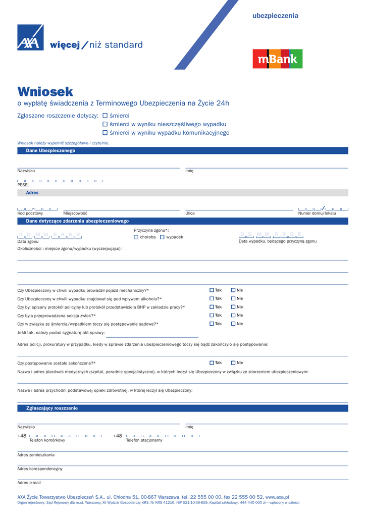 ubezpieczenia Wniosek o wypłatę świadczenia z Terminowego Ubezpieczenia na Życie 24h Zgłaszane roszczenie dotyczy: śmierci śmierci w wyniku nieszczęśliwego wypadku śmierci w wyniku wypadku komunikacyjnego Wniosek należy wypełnić szczegółowo i czytelnie. Dane Ubezpieczonego Nazwisko Imię PESEL Adres - Kod pocztowy Ulica Miejscowość Numer domu/lokalu Dane dotyczące zdarzenia ubezpieczeniowego Przyczyna zgonu*: D D M M R R R R choroba Data zgonu D D M M R R R R wypadek Data wypadku, będącego przyczyną zgonu Okoliczności i miejsce zgonu/wypadku (wyczerpująco): Czy Ubezpieczony w chwili wypadku prowadził pojazd mechaniczny?* Tak Nie Czy Ubezpieczony w chwili wypadku znajdował się pod wpływem alkoholu?* Tak Nie Czy był spisany protokół policyjny lub protokół przedstawiciela BHP w zakładzie pracy?* Tak Nie Czy była przeprowadzona sekcja zwłok?* Tak Nie Czy w związku ze śmiercią/wypadkiem toczy się postępowanie sądowe?* Tak Nie Jeśli tak, należy podać sygnaturę akt sprawy: Adres policji, prokuratury w przypadku, kiedy w sprawie zdarzenia ubezpieczeniowego toczy się bądź zakończyło się postępowanie: Tak Czy postępowanie zostało zakończone?* Nie Nazwa i adres placówek medycznych (szpital, poradnie specjalistyczne), w których leczył się Ubezpieczony w związku ze zdarzeniem ubezpieczeniowym: Nazwa i adres przychodni podstawowej opieki zdrowotnej, w której leczył się Ubezpieczony: Zgłaszający roszczenie Nazwisko +48 Telefon komórkowy Imię +48 Telefon stacjonarny Adres zamieszkania Adres korespondencyjny Adres e-mail AXA Życie Towarzystwo Ubezpieczeń S.A., ul. Chłodna 51, 00-867 Warszawa, tel. 22 555 00 00, fax 22 555 00 52, www.axa.pl Organ rejestrowy: Sąd Rejonowy dla m.st. Warszawy, XII Wydział Gospodarczy KRS, Nr KRS 41216, NIP 521-10-36-859, Kapitał zakładowy: 444 440 000 zł – wpłacony w całości Forma wypłaty świadczenia* Przelew bankowy Właściciel rachunku bankowego Numer rachunku bankowego Adres właściciela rachunku bankowego: - Kod pocztowy Miejscowość Ulica Numer domu/lokalu Miejscowość Ulica Numer domu/lokalu Przekaz pocztowy Adres: - Kod pocztowy Dokumenty wymagane do zgłoszenia roszczenia Prosimy przekazać do Towarzystwa wymienione poniżej dokumenty w postaci oryginałów lub kopii poświadczonych za zgodność z oryginałem przez notariusza lub przedstawiciela AXA, lub przedstawiciela mBanku S.A. bądź – w przypadku dokumentacji medycznej – pracownika przychodni, szpitala lub innej placówki medycznej, w której Ubezpieczony był zarejestrowany i leczony w związku z zaistniałym zdarzeniem ubezpieczeniowym. Prosimy zaznaczyć krzyżykiem załączane do wniosku kopie dokumentów. ŚMIERĆ W WYNIKU NIESZCZĘŚLIWEGO WYPADKU, ŚMIERĆ W WYNIKU WYPADKU KOMUNIKACYJNEGO ŚMIERĆ Do zgłoszenia dołączono: Do zgłoszenia dołączono: kopię odpisu skróconego aktu zgonu Ubezpieczonego kopię karty statystycznej do karty zgonu lub dokumentacji medycznej potwierdzającej przyczynę śmierci kopię dokumentacji medycznej z przychodni, szpitala lub adresy placówek medycznych, w których Ubezpieczony był zarejestrowany i leczony w związku z zaistniałym zdarzeniem ubezpieczeniowym, będącym przedmiotem zgłoszonego roszczenia kopię dowodu osobistego lub innego dokumentu tożsamości każdego z Uprawnionych do otrzymania świadczenia kopię odpisu prawomocnego postanowienia sądu o stwierdzeniu nabycia spadku lub kopię zarejestrowanego notarialnego poświadczenia dziedziczenia – w przypadku gdy Uprawniony jest spadkobiercą Ubezpieczonego opis okoliczności zdarzenia kopię odpisu skróconego aktu zgonu Ubezpieczonego kopię karty statystycznej do karty zgonu lub dokumentacji medycznej potwierdzającej przyczynę śmierci kopię opisu świadczenia pierwszej pomocy lub pomocy doraźnej (pogotowie ratunkowe, szpital itp.) kopię protokołu opisującego okoliczności zdarzenia (protokołu powypadkowego sporządzonego przez Komisję BHP, notatki urzędowej z policji, protokołu oględzin miejsca zdarzenia w przypadku wypadku komunikacyjnego, informacji o sposobie zakończenia postępowania przygotowawczego, w przypadku gdy zostało wszczęte postępowanie przygotowawcze, lub kopii postanowienia o umorzeniu postępowania) kopię dowodu osobistego lub innego dokumentu tożsamości każdego z Uprawnionych do otrzymania świadczenia kopię odpisu prawomocnego postanowienia sądu o stwierdzeniu nabycia spadku lub kopię zarejestrowanego notarialnego poświadczenia dziedziczenia – w przypadku gdy Uprawniony jest spadkobiercą Ubezpieczonego AXA może prosić zgłaszającego roszczenie o przedstawienie innych dokumentów, niewymienionych powyżej, jeżeli te dokumenty będą niezbędne do ustalenia odpowiedzialności AXA lub wysokości świadczenia ubezpieczeniowego. Oświadczenie Ja niżej podpisany(a) zgadzam się, aby pisemne oświadczenia lekarzy, którzy leczyli i opiekowali się mną, oraz wszystkie inne wymagane dokumenty stanowiły i tworzyły część niniejszej dokumentacji ubezpieczeniowej. Niniejszym upoważniam każdego lekarza, szpital, placówkę medyczną, właściwy ZUS, towarzystwo ubezpieczeniowe lub osobę, która posiada dane o moim stanie zdrowia, do udzielenia informacji i udostępnienia kopii dokumentacji związanych z przebytymi przeze mnie chorobami, pobytami w szpitalu, wynikami badań, poradami lub diagnozą medyczną oraz leczeniem. Wyrażam zgodę na przekazywanie AXA Życie TU S.A. przez Narodowy Fundusz Zdrowia danych o nazwach i adresach świadczeniodawców, którzy udzielili mi świadczeń opieki zdrowotnej w związku z wypadkiem lub zdarzeniem losowym, będącym podstawą ustalenia odpowiedzialności AXA Życie TU S.A. oraz wysokości odszkodowania lub świadczenia. Wyrażam zgodę na przetwarzanie uzyskanych w ten sposób moich danych, w tym danych o stanie zdrowia. Tak Nie Podpis Ubezpieczonego Oświadczenie osoby zgłaszającej roszczenie Wyrażam zgodę na przetwar