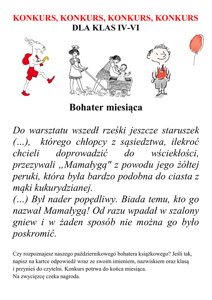 KONKURS, KONKURS, KONKURS, KONKURS DLA KLAS IV-VI Bohater miesiąca Do warsztatu wszedł rześki jeszcze staruszek (…), którego chłopcy z sąsiedztwa, ilekroć chcieli doprowadzić do wściekłości, przezywali „Mamałygą" z powodu jego żółtej peruki, która była bardzo podobna do ciasta z mąki kukurydzianej. (…) Był nader popędliwy. Biada temu, kto go nazwał Mamałygą! Od razu wpadał w szalony gniew i w żaden sposób nie można go było poskromić. Czy rozpoznajesz naszego październikowego bohatera książkowego? Jeśli tak, napisz na kartce odpowiedź wraz ze swoim imieniem, nazwiskiem oraz klasą i przynieś do czytelni. Konkurs potrwa do końca miesiąca. Na zwycięzcę czeka nagroda.