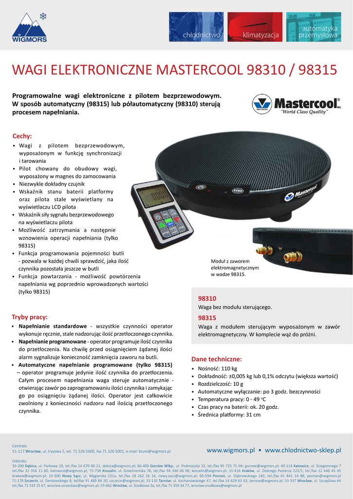 chłodnictwo klimatyzacja automatyka przemysłowa WAGI ELEKTRONICZNE MASTERCOOL 98310 / 98315 Programowalne wagi elektroniczne z pilotem bezprzewodowym. W sposób automatyczny (98315) lub półautomatyczny (98310) sterują procesem napełniania. Cechy: • Wagi • • • • • • • z pilotem bezprzewodowym, wyposażonym w funkcję synchronizacji i tarowania Pilot chowany do obudowy wagi, wyposażony w magnes do zamocowania Niezwykle dokładny czujnik Wskaźnik stanu baterii platformy oraz pilota stale wyświetlany na wyświetlaczu LCD pilota Wskaźnik siły sygnału bezprzewodowego na wyświetlaczu pilota Możliwość zatrzymania a następnie wznowienia operacji napełniania (tylko 98315) Funkcja programowania pojemności butli - pozwala w każdej chwili sprawdzić, jaka ilość czynnika pozostała jeszcze w butli Funkcja powtarzania - możliwość powtórzenia napełniania wg poprzednio wprowadzonych wartości (tylko 98315) Moduł z zaworem elektromagnetycznym w wadze 98315. 98310 Waga bez modułu sterującego. Tryby pracy: 98315 • Napełnianie standardowe - wszystkie czynności operator wykonuje ręcznie, stale nadzorując ilość przetłoczonego czynnika. • Napełnianie programowane - operator programuje ilość czynnika do przetłoczenia. Na chwilę przed osiągnięciem żądanej ilości alarm sygnalizuje konieczność zamknięcia zaworu na butli. • Automatyczne napełnianie programowane (tylko 98315) – operator programuje jedynie ilość czynnika do przetłoczenia. Całym procesem napełniania waga steruje automatycznie otwierając zawór po zaprogramowaniu ilości czynnika i zamykając go po osiągnięciu żądanej ilości. Operator jest całkowicie zwolniony z konieczności nadzoru nad ilością przetłoczonego czynnika. Centrala: 51-117 Wrocław, ul. Irysowa 5, tel. 71 326 5000, fax 71 326 5001, e-mail: [email protected] Waga z modułem sterującym wyposażonym w zawór elektromagnetyczny. W komplecie wąż do próżni. Dane techniczne: • • • • • • • Nośność: 110 kg Dokładność: ±0,005 kg lub 0,1% odczytu (większa wartość) Rozdzielczość: 10 g Automatyczne wyłączanie: po 3 godz. bezczynności Temperatura pracy: 0 - 49 oC Czas pracy na baterii: ok. 20 godz. Średnica platformy: 31 cm www.wigmors.pl • www.chlodnictwo-sklep.pl Oddziały: 39-200 Dębica, ul. Parkowa 10, tel./fax 14 670 00 21, [email protected]; 66-400 Gorzów Wlkp., ul. Podmiejska 32, tel./fax 95 725 75 04; [email protected]; 40-114 Katowice, ul. Ściegiennego 7 tel./fax 32 356 11 60, [email protected]; 75-736 Koszalin, ul. Gnieźnieńska 76, tel./fax 94 346 06 06, [email protected]; 31-416 Kraków, ul. Dobrego Pasterza 122/1, tel./fax 12 446 45 45 [email protected]; 33-300 Nowy Sącz, ul. Węgierska 231a, tel./fax 18 262 16 16, [email protected]; 60-594 Poznań, ul. Dąbrowskiego 183, tel./fax 61 841 14 88, [email protected] 71-178 Szczecin, ul. Derdowskiego 8, tel/fax 91 489 84 20; [email protected]; 33-110 Tarnów; ul. Kochanowskiego 47, tel./fax 14 629 63 63, [email protected]; 53-337 Wrocław, ul. Szczęśliwa 44 tel./fax 71 333 25 67, [email protected]; 53-662 Wrocław, ul. Środkowa 3a, tel./fax 71 359 34 77, [email protected]