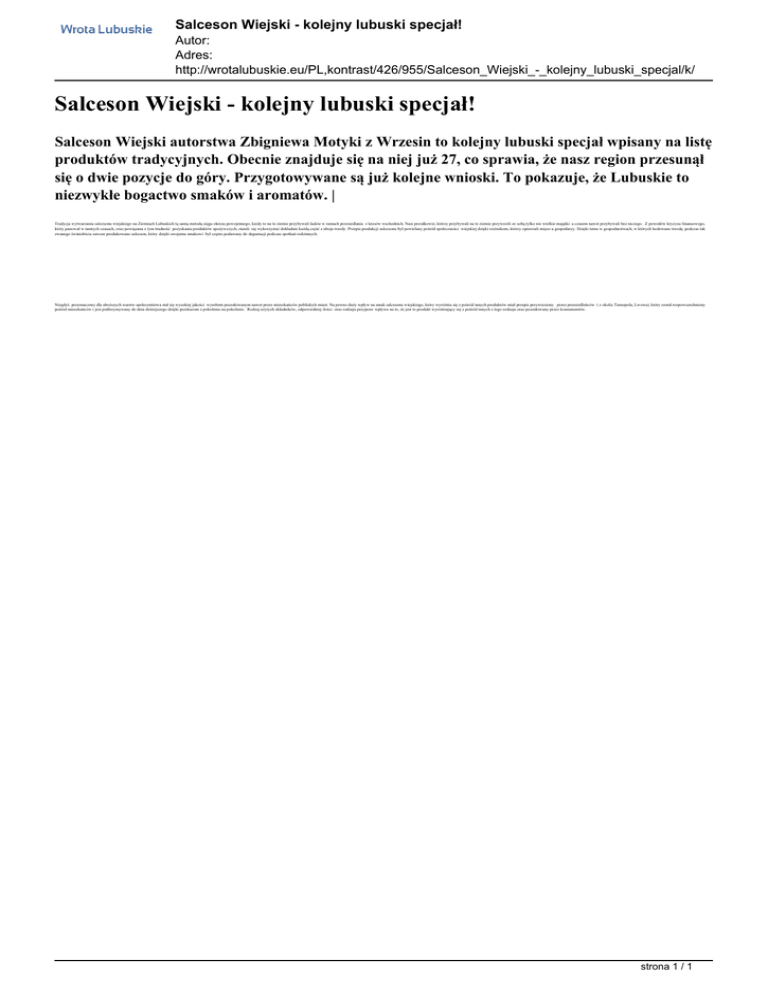 Salceson Wiejski - kolejny lubuski specjał! Autor: Adres: http://wrotalubuskie.eu/PL,kontrast/426/955/Salceson_Wiejski_-_kolejny_lubuski_specjal/k/ Salceson Wiejski - kolejny lubuski specjał! Salceson Wiejski autorstwa Zbigniewa Motyki z Wrzesin to kolejny lubuski specjał wpisany na listę produktów tradycyjnych. Obecnie znajduje się na niej już 27, co sprawia, że nasz region przesunął się o dwie pozycje do góry. Przygotowywane są już kolejne wnioski. To pokazuje, że Lubuskie to niezwykłe bogactwo smaków i aromatów. | Tradycja wytwarzania salcesonu wiejskiego na Ziemiach Lubuskich tą samą metodą sięga okresu powojennego, kiedy to na te ziemie przybywali ludzie w ramach przesiedlania z kresów wschodnich. Nasi przodkowie, którzy przybywali na te ziemie przywozili ze sobą tylko nie wielkie majątki a czasem nawet przybywali bez niczego. Z powodów kryzysu finansowego, który panował w tamtych czasach, oraz powiązana z tym trudność pozyskania produktów spożywczych, starali się wykorzystać dokładnie każdą część z uboju trzody. Przepis produkcji salcesonu był powielany pośród społeczności wiejskiej dzięki rzeźnikom, którzy oprawiali mięso u gospodarzy. Dzięki temu w gospodarstwach, w których hodowano trzodę, podczas tak zwanego świniobicia zawsze produkowano salceson, który dzięki swojemu smakowi był często podawany do degustacji podczas spotkań rodzinnych. Niegdyś przeznaczony dla uboższych warstw społeczeństwa stał się wysokiej jakości wyrobem poszukiwanym nawet przez mieszkańców pobliskich miast. Na pewno duży wpływ na smak salcesonu wiejskiego, który wyróżnia się z pośród innych produktów miał przepis przywieziony przez przesiedleńców ( z okolic Tarnopola, Lwowa), który został rozpowszechniony pośród mieszkańców i jest podtrzymywany do dnia dzisiejszego dzięki przekazom z pokolenia na pokolenie. Rodzaj użytych składników, odpowiedniej ilości oraz rodzaju przypraw wpływa na to, że jest to produkt wyróżniający się z pośród innych z tego rodzaju oraz poszukiwany przez konsumentów. strona 1 / 1 Powered by TCPDF (www.tcpdf.org)