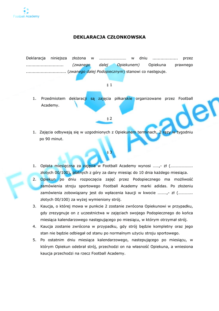 DEKLARACJA CZŁONKOWSKA Deklaracja niniejsza ............................ złożona (zwanego w ……………………… dalej w dniu Opiekunem) ................... Opiekuna przez prawnego .............................. (zwanego dalej Podopiecznym) stanowi co następuje. §1 1. Przedmiotem deklaracji są zajęcia piłkarskie organizowane przez Football Academy. §2 1. Zajęcia odbywają się w uzgodnionych z Opiekunem terminach, 2 razy w tygodniu po 90 minut. §3 1. Opłata miesięczna za zajęcia w Football Academy wynosi ……,- zł (…………………. złotych 00/100), płatnych z góry za dany miesiąc do 10 dnia każdego miesiąca. 2. Opiekun po dniu rozpoczęcia zajęć przez Podopiecznego ma możliwość zamówienia stroju sportowego Football Academy marki adidas. Po złożeniu zamówienia zobowiązany jest do wpłacenia kaucji w kwocie ………,- zł (………….. złotych 00/100) za wyżej wymieniony strój. 3. Kaucja, o której mowa w punkcie 2 zostanie zwrócona Opiekunowi w przypadku, gdy zrezygnuje on z uczestnictwa w zajęciach swojego Podopiecznego do końca miesiąca kalendarzowego następującego po miesiącu, w którym otrzymał strój. 4. Kaucja zostanie zwrócona w przypadku, gdy strój będzie kompletny oraz jego stan nie będzie odbiegał od stanu po normalnym użyciu stroju sportowego. 5. Po ostatnim dniu miesiąca kalendarzowego, nastepującego po miesiącu, w którym Opiekun odebrał strój, przechodzi on na własność Opiekuna, a wniesiona kaucja przechodzi na rzecz Football Academy. §4 1. Opiekun potwierdza, że zapoznał się z regulaminem Football Academy, który stanowi integralną część niniejszej deklaracji, akceptując go bez zastrzeżeń. 2. Football Academy zobowiązuje się powiadomić Opiekuna o wszelkich zmianach regulaminu. §5 Opiekun oświadcza, iż Podopieczny został poddany stosownym badaniom oraz, że stan zdrowia Podopiecznego jest dobry i umożliwia mu udział w treningach, a nadto oświadcza, iż nie są mu znane jakiekolwiek przeciwwskazania do udziału Podopiecznego w treningach Football Academy. §6 1. Opiekun wyraża zgodę na przetwarzanie danych osobowych swoich oraz swojego Podopiecznego jedynie do celów statystycznych Football Academy, a także wizerunku (w tym zdjęcia, nagrania video) Podopiecznego do celów marketingowych Football Academy. §7 1. W sprawach nieuregulowanych niniejszą deklaracją zastosowanie mają przepisy Kodeksu Cywilnego. §8 1. Niniejsza deklaracja została sporządzona w dwóch jednobrzmiących egzemplarzach po jednym dla Opiekuna i Football Academy. ................................... Data i podpis Opiekuna