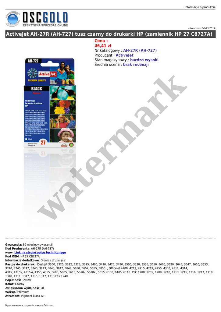 Informacje o produkcie Utworzono 04-03-2017 ActiveJet AH-27R (AH-727) tusz czarny do drukarki HP (zamiennik HP 27 C8727A) Cena : 46,41 zł w at er m ar k Nr katalogowy : AH-27R (AH-727) Producent : ActiveJet Stan magazynowy : bardzo wysoki Średnia ocena : brak recenzji Gwarancja: 60 miesięcy gwarancji Kod Producenta: AH-27R (AH-727) www: Link na stronę opisu technicznego Kod OEM: HP 27 C8727A Informacje dodatkowe: Głowica drukująca Pasuje do drukarek:: Deskjet 3300, 3320, 3322, 3323, 3325, 3400, 3420, 3425, 3450, 3500, 3520, 3535, 3550, 3600, 3620, 3645, 3647, 3650, 3653, 3740, 3745, 3747, 3840, 3843, 3845, 3847, 3848, 5650, 5652, 5655, 5850. , Officejet 4200, 4212, 4215, 4219, 4255, 4300, 4311, 4314, 4315, 4315v, 4315xi, 4350, 4355, 5600, 5605, 5610, 5610v, 5610xi, 5615, 6100, 6105, 6110. PSC 1200, 1205, 1209, 1210, 1213, 1215, 1216, 1217, 1219, 1310, 1311, 1312, 1315, 1317, 1318.Fax 1240. Pojemność: 20 ml Kolor: Czarny Zwiększona wydajność: XL Wersja: Premium Atrament: Pigment klasa A+ Wygenerowano w programie www.oscGold.com w at er m ar k Grupa: Gold Zastosowanie: Wydruki profesjonalne - zdjęcia, katalogi, prezentacje, oferty, dyplomy, zaproszenia, ulotki Opakowanie: Karton z wieszakiem, foliowane, odporne na UV
