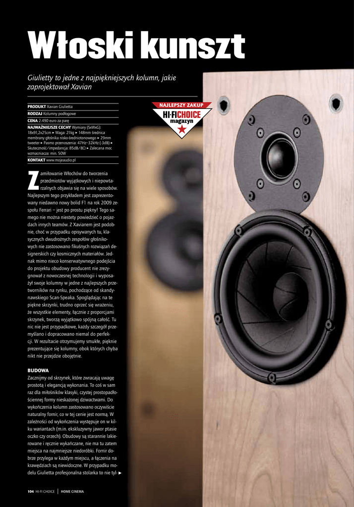 Włoski kunszt Giulietty to jedne z najpiękniejszych kolumn, jakie zaprojektował Xavian PRODUKT Xavian Giulietta NAJLEPSZY ZAKUP RODZAJ Kolumny podłogowe CENA 2.490 euro za parę NAJWAŻNIEJSZE CECHY Wymiary (SxWxG): 18x91,2x25cm > Waga: 21kg > 148mm średnica membrany głośnika nisko-średniotonowego > 29mm tweeter > Pasmo przenoszenia: 47Hz–32kHz (-3dB) > Skuteczność/impedancja: 85dB/8Ω > Zalecana moc wzmacniacza: min. 50W KONTAKT www.mojeaudio.pl Z amiłowanie Włochów do tworzenia przedmiotów wyjątkowych i niepowtarzalnych objawia się na wiele sposobów. Najlepszym tego przykładem jest zaprezentowany niedawno nowy bolid F1 na rok 2009 zespołu Ferrari – jest po prostu piękny! Tego samego nie można niestety powiedzieć o pojazdach innych teamów. Z Xavianem jest podobnie, choć w przypadku opisywanych tu, klasycznych dwudrożnych zespołów głośnikowych nie zastosowano fikuśnych rozwiązań designerskich czy kosmicznych materiałów. Jednak mimo nieco konserwatywnego podejścia do projektu obudowy producent nie zrezygnował z nowoczesnej technologii i wyposażył swoje kolumny w jedne z najlepszych przetworników na rynku, pochodzące od skandynawskiego Scan-Speaka. Spoglądając na te piękne skrzynki, trudno oprzeć się wrażeniu, że wszystkie elementy, łącznie z proporcjami skrzynek, tworzą wyjątkowo spójną całość. Tu nic nie jest przypadkowe, każdy szczegół przemyślano i dopracowano niemal do perfekcji. W rezultacie otrzymujemy smukłe, pięknie prezentujące się kolumny, obok których chyba nikt nie przejdzie obojętnie. BUDOWA Zacznijmy od skrzynek, które zwracają uwagę prostotą i elegancją wykonania. To coś w sam raz dla miłośników klasyki, czystej prostopadłościennej formy nieskażonej dziwactwami. Do wykończenia kolumn zastosowano oczywiście naturalny fornir, co w tej cenie jest normą. W zależności od wykończenia występuje on w kilku wariantach (m.in. ekskluzywny jawor ptasie oczko czy orzech). Obudowy są starannie lakierowane i ręcznie wykańczane, nie ma tu zatem miejsca na najmniejsze niedoróbki. Fornir dobrze przylega w każdym miejscu, a łączenia na krawędziach są niewidoczne. W przypadku modelu Giulietta profesjonalna stolarka to nie tyl- 104 HI-FI CHOICE | HOME CINEMA magazyn [ Recenzja ] Kolumny podłogowe Xavian Giulietta ko dobre materiały, ale także ich odpowiedni dobór – poszczególne listki forniru ułożono w taki sposób, aby zachować ciągłość wzoru słojów (zwłaszcza jeśli się przyjrzeć łączeniu części frontowej z górną). Obudowa spoczywa na takim samym cokole, jakim dysponowały testowane miesiąc temu Duetto. Zbudowany z płyt MDF poprzedzielanych cienkimi warstwami aluminium, będzie sobie dobrze radził z tłumieniem drgań. W komplecie są również piękne, toczone, pokryte chromem kolce z podkładkami i nakrętkami dystansowymi, służącymi do regulacji wysokości. Z tyłu znajdziemy topowe pojedyncze terminale głośnikowe WBT pokryte platyną, nadające kolumnom wyjątkowego charakteru – ładnie się prezentują, ale są też doskonale spasowane i idealnie trzymają standardowe wymiary zarówno dla wtyków, jak i widełek. Zwrotnicę z filtrami pierwszego rzędu przykręcono do tylnej, wewnętrznej ścianki tuż nad wspomnianymi gniazdami. Zawiera ona wyselekcjonowane, wysokiej jakości komponenty. Podział pasma między głośnikami ustalono mniej więcej na 2200Hz. Wewnątrz skrzynia jest przedzielona na trzy komory. Ta, w której pracuje głośnik nisko-średniotonowy, jest nieduża (około 8 litrów) – wytłumiono ją gąbką oraz obciążono masywnym aluminiowym, toczonym tunelem bas-refleksu. Kolejna, mniej więcej pośrodku, jest zamknięta, ale tworzące ją ścianki dodatkowo usztywniają całą konstrukcję. Do trzeciej komory otrzymujemy dostęp poprzez nieduży otwór, przez który można wrzucić do jej wnętrza ołowiu lub wyprażonego piasku – dociążona powinna pozytywnie wpłynąć na prezentację basu. Odtwarzaniem wysokich tonów i wyższej średnicy zajmuje się impregnowana, jedwabna kopułka marki Scan-Speak. Przetwornik ten charakteryzuje się bardzo niską wartością rezonansu mechanicznego, co pozwoliło konstruktorowi na aplikację z filtrem pierwszego rzędu z równoległym obwodem korygującym przebieg impedancji. Odtworzenie średnicy oraz basu to zadanie dla znanego stożkowego przetwornika tej samej marki. Lekka papierowa membrana ponacinana jest antyrezonansowymi rowkami, nasączonymi substancją tłumiącą. Układ magnetyczny jest olbrzymi, a sztywny ażurowy kosz odlano z metali lekkich. 106 HI-FI CHOICE | HOME CINEMA JAKOŚĆ DŹWIĘKU Giulietty to kolumny wykwintne i z charakterem. Słucha się ich z takim smakiem, jakby się próbowało znakomitego markowego wina. A jest na czym „ucho zawiesić”, nie wspominając o walorach estetycznych. Ta konstrukcja to zdecydowany krok naprzód względem tańszych Duetto. Konstruktor zawarł w nich najlepsze cechy konstrukcji podłogowych i monitorów. Owszem, słychać pewne kompromisy, bo dynamiką nie porażają, ale połączenie wielu cech charakterystycznych dla wcześniej wymienionych kolumn pozwala delektować się dźwiękiem wyjątkowo wciągającym i angażującym. Zacznijmy od przestrzeni – zarówno jej rozmiary, jak i rozmach, z jakim kreślone są poszczególne źródła pozorne, jednoznacznie kojarzą się z dużo większymi, nawet trójdrożnymi zestawami. Jednak, aby uraczyć tak prezentowanej stereofonii, powinniśmy Giuliettom stworzyć odpowiednie warunki. Kolumny te najlepiej czują się w średniej wielkości pomieszczeniach. Z kolei dla uzyskania lepszej spójności fazowej polecamy odchylić je nieco do tyłu – wystarczy wyregulować kolce w taki sposób, aby uzyskać wartość zaledwie kilku stopni. Dzięki temu zabiegowi przełom średnicy i wysokich tonów zyskuje na homogeniczności, a dodatkowo poszczególne źródła pozorne są ostrzej odwzorowane i 