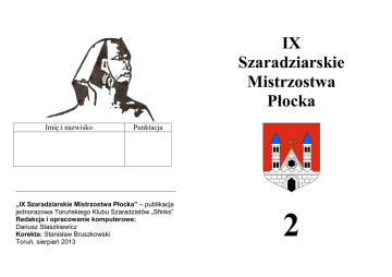 IX Szaradziarskie Mistrzostwa Płocka Imię i nazwisko Punktacja ___________________________________________ „IX Szaradziarskie Mistrzostwa Płocka” – publikacja jednorazowa Toruńskiego Klubu Szaradzistów „Sfinks” Redakcja i opracowanie komputerowe: Dariusz Staszkiewicz Korekta: Stanisław Bruszkowski Toruń, sierpień 2013 2 Krzyżówka Krzyżówka 1 Litery w zaznaczonych polach, czytane wężykiem, utworzą rozwiązanie. Poziomo: 1 2 4) potocznie okazja do najedzenia się. 8) rzymski bóg rolnictwa. 4 5 6 7 9) oznaka przynależności do organizacji. 8 10) ptak żyjący wokół mórz arktycznych. 11) w średniowieczu dokument wymienia9 jący ofiarowane dobra. 12) pochodzi z tych samych okolic. 10 Pionowo: 1) sprzedaż alkoholi wypijanych na miej11 scu. 2) imituje wybuch granatu. 12 3) w przenośni człowiek bezwolny. 5) najsłynniejsza rola Louisa de Finès. 6) potok. 7) bardzo mała ilość. 3 2 Miszmasz 1 Litery w zaznaczonych polach, czytane rzędami, utworzą rozwiązanie. Poziomo: 1) jednostka systematyki roślin i zwierząt. 4) górna część grzbietu poniżej karku. 5) zielona gałąź obnoszona jako oznaka wiosny. 7) sanitarka. 9) naczynie do mierzenia objętości. 11) unika jedzenia mięsa. 13) z winą w tytule powieści Dostojewskiego. 15) patron muzyków i spiewaków. 16) miasto nad jeziorem Roś. 18) rozkładany fotel do spania. Pionowo: 1) ma kilku mężów. 2) strojna suknia z XVIII wieku. 3) pisak do zaznaczania tekstu. 6) syn Detala. 8) odprzodowa broń palna z początków XIX wieku. 10) imię Paschalskiej, aktorki i piosenkarki. Rebus 1 Metagramowy, 2-wyrazowy, o początkowych literach: B. D. Dariusz Staszkiewicz 1 1 2 3 4 5 6 9 7 13 8 10 11 14 16 1 1 2 3 4 5 Dariusz Staszkiewicz Dariusz Staszkiewicz Krzyżówka dwuliterowa 2 Litery w zaznaczonych polach, czytane rzędami, utworzą rozwiązanie. Poziomo: 1) jedna z faz księżyca. 4) Jacques, prezydent Francji w latach 1995-2007. 5) Auguste, francuski impresjonista („Sąd Parysa”). Pionowo: 1) samiec żbika. 2) atom o ujemnym ładunku. 3) tło historyczne w dziele literackim. 12 15 17 18 12) postacie odtwarzane przez aktorów. 14) broń biała używana w XVI i XVII wieku. 17) układ wyrazów w zdaniu. 5 4 3 2 1 Należy odgadnąć, czy do diagramu wpisuje się podane słowo, czy też jego synonim, anagram bądź metagram (wyraz różniący się jedną literą). Litery w zaznaczonych polach, czytane rzędami, utworzą rozwiązanie. Poziomo: Pionowo: 1 2 3 4 5 6 1) monterka. 2) agnat. 7) lawa. 3) Evita. 7 8) ankier. 4) tartan. 8 9) portki. 5) strona. 10) ubytek. 6) szalik. 9 13) euforia. 10) seraj. 17) rower. 11) rogal. 10 11 12 18) posag. 12) enter. 19) kabinka. 14) upały. 13 14 15 16 23) warkot. 15) fagas. 26) ubiory. 16) agora. 17 27) szakal. 20) epakta. 28) stok. 21) koniak. 18 29) pyskówka. 22) stawek. 24) balot. 19 20 21 22 25) korek. Dariusz Staszkiewicz 23 24 25 Kalambur 1 26 Rzekę ofiarowały 27 buty na upały. Dariusz Staszkiewicz 28 Dariusz Staszkiewicz 29 Rebus 1 wspakowy, kołowy, 1-wyrazowy, o początkowej literze P. Skrótka 1 Znudzony małżonek Pomysł mu __ __ __ __ __ szalony, Dariusz Staszkiewicz by spędzić __ __ __ __ __ __ bez żony. Dariusz Staszkiewicz Anagram 2 rysunkowy, 9-literowy, o literze początkowej W. Dariusz Staszkiewicz 6 Jolka ze szkotką 5 4 3 2 1 Psotka Poziomo (w kolejności Zamiast określeń wyrazów pionowych podano zaprzypadkowej): warte w nich krótsze słowa. Litery w zaznaczonych - ubytek, szkoda polach, czytane rzędami, utworzą rozwiązanie. - wysypywany w parkowych 1 2 3 4 5 alejkach - koń czystej krwi - rożen na prąd lub węgiel drzewny - rzemieślnik pracujący z gliną przy kole - rzeka, przez którą Charon przewoził dusze zmarłych - strzelba rozszerzona przy 6 wylocie - żołądź w kartach 7 8 - urządzenie do napędu sieczkarni, maneż - ofiara na zbożny cel - drobna roślina zarodnikowa 9 10 - zapakowane rzeczy podróżnego - druczek propagandowy - substancja lana w andrzejki Pionowo: 1) kos. 2) kret. 3) tor. 4) rów. 5) los. 6) ren. 7) tul. 8) tan. 9) wór. Dariusz Cugier 10) gra. Szyfrogram 2 1 Rozwiązaniem jest tytuł amerykańskiej komedii sensacyjnej. 18 26 2 12 15 6 1 2 3 4 5 6 Poziomo: 18) roślina doniczkowa 21 3 17 19 25 16 7 8 9 10 11 12 o kwiatach zebranych w baldachy. 29 14 1 24 4 20 13 14 15 16 17 18 21) między latem a zimą. 5 9 13 23 10 28 19 20 21 22 23 24 29) małe cząsteczki czasu, momenty. 30 27 7 11 25 26 27 28 29 30 5) dziennikarskie plotki. 22 8 22) dorożka w miejskiej gwarze. Anagram 1 Pionowo: To, że globalnie klimat się __ __ __ __ __ __ __ , 26) Ferenc, kompozytor węgierski („Kraina uśmiechu”). jest w dużej mierze „zasługą” __ __ __ __ __ __ __ . 5 Stanisław Bruszkowski Jerzy Kukowicz 4 3 2 1 W każdym wyrazie należy zmienić jedna literę, tak aby powstało określenie słowa (rzeczownika pospolitego) wpisywanego do diagramu. 1 2 3 4 5 Poziomo: Pionowo: 1) sima. 1) trzaski. 6 6) kolka. 2) toń. 7) legary. 3) bufor. 7 8) właz. 4) mewka. 9) medresa. 5) kecz. 8 13) strata. 8) flanca. 14) lis. 10) kutwienie. 9 15) wylanie. 11) turysta. 16) zajęcie. 12) krycie. 10 11 17) cywilka. 13) notka. Stanisław Bruszkowski 12 13 14 F I 15 16 K S 17 Wirokreskówka 1 Odgadnięte słowa 6-literowe należy wpisać do diagramu prawo- lub lewoskrętnie, rozpoczynając od pola z kreseczką, tak aby wraz ze znajdującymi się już literami utworzyły nowe 7-literowe rzeczowniki pospolite. F) sz __ __ fro __ __ __ __ . K) b __ __ ź __ __ __ cze __ . I) __ __ ym __ sze __ __ __ . S) __ __ __ em __ __ czk __ . Stanisław Bruszkowski Metamorfoza 2 W wyrazie KRZYK należy zmienić literę z zaznaczonego pola na inną, a następnie przenieść litery do kolejnego rzędu, tak aby wraz z ujawnionymi literami utworzyły nowe słowo. Postępując analogicznie z kolejnymi wyrazami, należy dojść do słowa PAWIA. Wszystkie wyrazy są rzeczowniki pospolitymi. Stanisław Bruszkowski K Z Y K G A W N K Y N A P Anagram R A W 