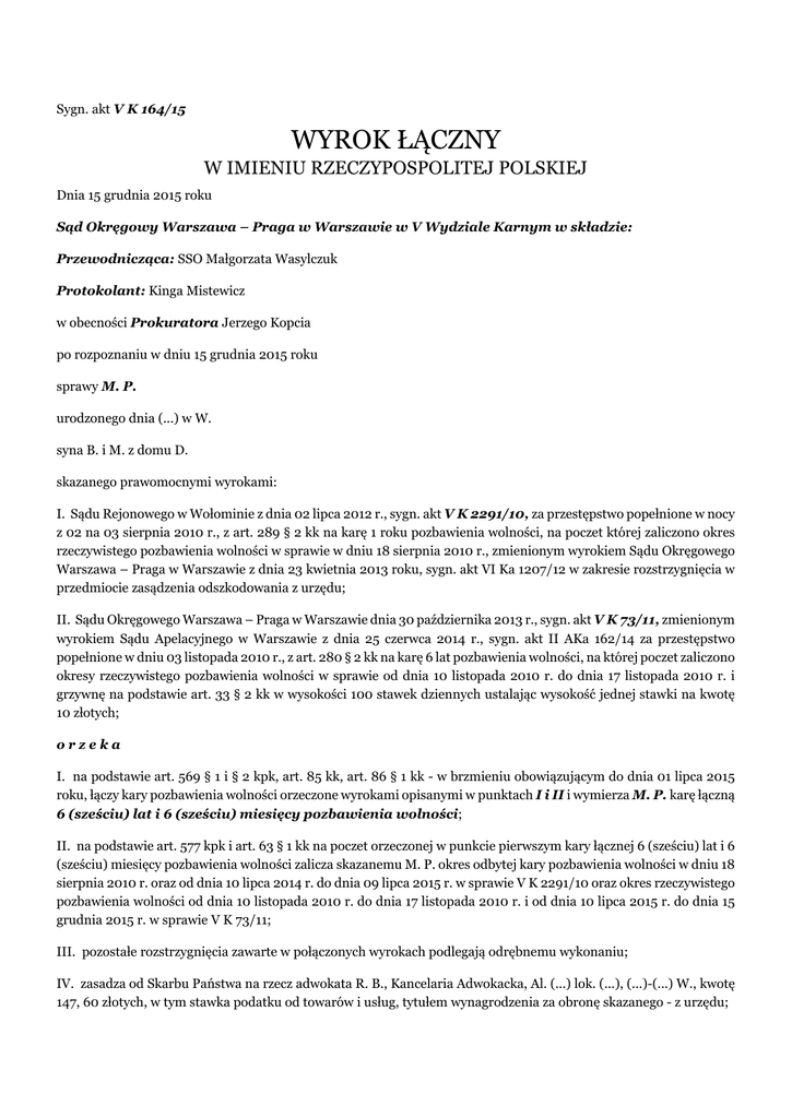 Sygn. akt V K 164/15 WYROK ŁĄCZNY W IMIENIU RZECZYPOSPOLITEJ POLSKIEJ Dnia 15 grudnia 2015 roku Sąd Okręgowy Warszawa – Praga w Warszawie w V Wydziale Karnym w składzie: Przewodnicząca: SSO Małgorzata Wasylczuk Protokolant: Kinga Mistewicz w obecności Prokuratora Jerzego Kopcia po rozpoznaniu w dniu 15 grudnia 2015 roku sprawy M. P. urodzonego dnia (...) w W. syna B. i M. z domu D. skazanego prawomocnymi wyrokami: I. Sądu Rejonowego w Wołominie z dnia 02 lipca 2012 r., sygn. akt V K 2291/10, za przestępstwo popełnione w nocy z 02 na 03 sierpnia 2010 r., z art. 289 § 2 kk na karę 1 roku pozbawienia wolności, na poczet której zaliczono okres rzeczywistego pozbawienia wolności w sprawie w dniu 18 sierpnia 2010 r., zmienionym wyrokiem Sądu Okręgowego Warszawa – Praga w Warszawie z dnia 23 kwietnia 2013 roku, sygn. akt VI Ka 1207/12 w zakresie rozstrzygnięcia w przedmiocie zasądzenia odszkodowania z urzędu; II. Sądu Okręgowego Warszawa – Praga w Warszawie dnia 30 października 2013 r., sygn. akt V K 73/11, zmienionym wyrokiem Sądu Apelacyjnego w Warszawie z dnia 25 czerwca 2014 r., sygn. akt II AKa 162/14 za przestępstwo popełnione w dniu 03 listopada 2010 r., z art. 280 § 2 kk na karę 6 lat pozbawienia wolności, na której poczet zaliczono okresy rzeczywistego pozbawienia wolności w sprawie od dnia 10 listopada 2010 r. do dnia 17 listopada 2010 r. i grzywnę na podstawie art. 33 § 2 kk w wysokości 100 stawek dziennych ustalając wysokość jednej stawki na kwotę 10 złotych; orzeka I. na podstawie art. 569 § 1 i § 2 kpk, art. 85 kk, art. 86 § 1 kk - w brzmieniu obowiązującym do dnia 01 lipca 2015 roku, łączy kary pozbawienia wolności orzeczone wyrokami opisanymi w punktach I i II i wymierza M. P. karę łączną 6 (sześciu) lat i 6 (sześciu) miesięcy pozbawienia wolności; II. na podstawie art. 577 kpk i art. 63 § 1 kk na poczet orzeczonej w punkcie pierwszym kary łącznej 6 (sześciu) lat i 6 (sześciu) miesięcy pozbawienia wolności zalicza skazanemu M. P. okres odbytej kary pozbawienia wolności w dniu 18 sierpnia 2010 r. oraz od dnia 10 lipca 2014 r. do dnia 09 lipca 2015 r. w sprawie V K 2291/10 oraz okres rzeczywistego pozbawienia wolności od dnia 10 listopada 2010 r. do dnia 17 listopada 2010 r. i od dnia 10 lipca 2015 r. do dnia 15 grudnia 2015 r. w sprawie V K 73/11; III. pozostałe rozstrzygnięcia zawarte w połączonych wyrokach podlegają odrębnemu wykonaniu; IV. zasadza od Skarbu Państwa na rzecz adwokata R. B., Kancelaria Adwokacka, Al. (...) lok. (...), (...)-(...) W., kwotę 147, 60 złotych, w tym stawka podatku od towarów i usług, tytułem wynagrodzenia za obronę skazanego - z urzędu; V. wydatkami związanymi z wydaniem wyroku łącznego obciąża Skarb Państwa. V K 164/15 UZASADNIENIE M. P. złożył wniosek o wydanie wyroku łącznego, który dotyczyłby kar wymierzonych mu wyrokami wydanymi w sprawie V K 2291/10 oraz w sprawie V K 73/11. Sąd ustalił co następuje: M. P. został skazany wyrokiem Sądu Rejonowego w Wołominie z dnia 02 lipca 2012 r., sygn. akt V K 2291/10, za przestępstwo popełnione w nocy z 02 na 03 sierpnia 2010 r., z art. 289 § 2 kk na karę 1 roku pozbawienia wolności, na poczet której zaliczono okres rzeczywistego pozbawienia wolności w sprawie w dniu 18 sierpnia 2010 r. Powyższy wyrok został zmieniony wyrokiem Sądu Okręgowego Warszawa – Praga w Warszawie z dnia 23 kwietnia 2013 roku, sygn. akt VI Ka 1207/12 w zakresie rozstrzygnięcia w przedmiocie zasądzenia odszkodowania z urzędu. Następnie M. P. został skazany wyrokiem Sądu Okręgowego Warszawa – Praga w Warszawie dnia 30 października 2013 r., sygn. akt V K 73/11, zmienionym wyrokiem Sądu Apelacyjnego w Warszawie z dnia 25 czerwca 2014 r., sygn. akt II AKa 162/14 za przestępstwo popełnione w dniu 03 listopada 2010 r., z art. 280 § 2 kk na karę 6 lat pozbawienia wolności, na której poczet zaliczono okresy rzeczywistego pozbawienia wolności w sprawie od dnia 10 listopada 2010 r. do dnia 17 listopada 2010 r. i grzywnę na podstawie art. 33 § 2 kk w wysokości 100 stawek dziennych ustalając wysokość jednej stawki na kwotę 10 złotych. Powyższe zostało ustalone na podstawie następujących dokumentów: dane o karalności (k. 11), odpisy orzeczeń (k. 15, 16-17, 18, 19, 20-21, 22, 23, 24-25, 26-27, 28, 29-31, 32-33, 42), kopia obliczenia kary (k. 34), opinia o skazanym (k. 35), informacja o pobytach i orzeczeniach (k. 36-38) oraz akta spraw V K 73/11, V K 2621/10, V K 2085/10, V K 1763/06, V K 333/10, V K 869/09, V K 2291/10, V K 691/11, V K 284/07. Sąd zważył co następuje: Zgodnie z dyspozycją art. 569 § 1 i § 2 k.p.k., wyrok łączny wydaje się jeżeli zachodzą warunki do orzeczenia kary łącznej w stosunku do osoby, którą prawomocnie skazano lub wobec której orzeczono karę łączną, przy czym w przypadku osoby skazanej wyrokami różnych sądów, właściwy do wydania wyroku łącznego jest sąd, który wydał ostatni wyrok skazujący lub łączny w pierwszej instancji, orzekający kary podlegające łączeniu. Jeżeli zaś w pierwszej instancji orzekały sądy różnego rzędu, wyrok łączny wydaje sąd wyższego rzędu. Warunki orzeczenia kary łącznej wobec skazanego M. P. określają przepisy rozdziału IX Kodeksu karnego, w brzmieniu obowiązującym do dnia 01 lipca 2015 r. W myśl art. 19 ustawy z dnia 20 lutego 2015 r. o zmianie ustawy - Kodeks karny oraz niektórych innych ustaw, przepisów rozdziału IX ustawy, w brzmieniu nadanym tą ustawą, nie stosuje się do kar prawomocnie orzeczonych przed dniem wejścia w życie niniejszej ustawy, chyba że zachodzi potrzeba orzeczenia kary łącznej w związku z prawomocnym skazaniem po dniu wejścia w życie tej ustawy. Wszystkie kary zostały orzeczone wobec M. P. przed dniem 01 lipca 2015 r. Przechodząc zatem do reguł wymiaru kary łącznej wskazać należy, że w myśl art. 85 k.k. połączeniu podlegają kary tego samego rodzaj