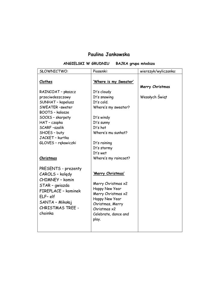 Paulina Jankowska ANGIELSKI W GRUDNIU BAJKA grupa młodsza SŁOWNICTWO: Piosenki: Clothes ‘Where is my Sweater’ RAINCOAT – płaszcz przeciwdeszczowy SUNHAT – kapelusz SWEATER –sweter BOOTS – kalosze SOCKS – skarpety HAT – czapka SCARF –szalik SHOES – buty JACKET – kurtka GLOVES – rękawiczki It’s cloudy It’s snowing It’s cold. Where’s my sweater? wierszyk/wyliczanka: Merry Christmas Christmas PRESENTS - prezenty CAROLS – kolędy CHIMNEY – komin STAR – gwiazda FIREPLACE – kominek ELF– elf SANTA – Mikołaj CHRISTMAS TREE choinka It’s windy It’s sunny It’s hot Where’s mu sunhat? It’s raining It’s stormy It’s wet Where’s my raincoat? ‘Merry Christmas’ Merry Christmas x2 Happy New Year Merry Christmas x2 Happy New Year Christmas, Merry Christmas x2 Celebrate, dance and play. Wesołych Świąt