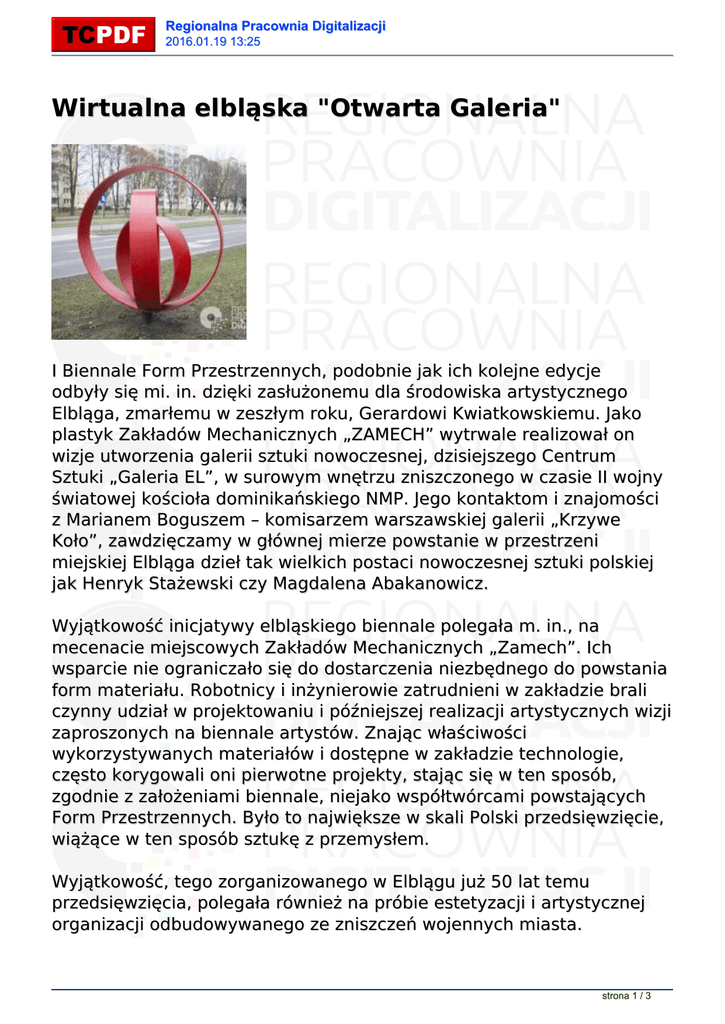 Regionalna Pracownia Digitalizacji 2016.01.19 13:25 Wirtualna elbląska "Otwarta Galeria" I Biennale Form Przestrzennych, podobnie jak ich kolejne edycje odbyły się mi. in. dzięki zasłużonemu dla środowiska artystycznego Elbląga, zmarłemu w zeszłym roku, Gerardowi Kwiatkowskiemu. Jako plastyk Zakładów Mechanicznych „ZAMECH” wytrwale realizował on wizje utworzenia galerii sztuki nowoczesnej, dzisiejszego Centrum Sztuki „Galeria EL”, w surowym wnętrzu zniszczonego w czasie II wojny światowej kościoła dominikańskiego NMP. Jego kontaktom i znajomości z Marianem Boguszem – komisarzem warszawskiej galerii „Krzywe Koło”, zawdzięczamy w głównej mierze powstanie w przestrzeni miejskiej Elbląga dzieł tak wielkich postaci nowoczesnej sztuki polskiej jak Henryk Stażewski czy Magdalena Abakanowicz. Wyjątkowość inicjatywy elbląskiego biennale polegała m. in., na mecenacie miejscowych Zakładów Mechanicznych „Zamech”. Ich wsparcie nie ograniczało się do dostarczenia niezbędnego do powstania form materiału. Robotnicy i inżynierowie zatrudnieni w zakładzie brali czynny udział w projektowaniu i późniejszej realizacji artystycznych wizji zaproszonych na biennale artystów. Znając właściwości wykorzystywanych materiałów i dostępne w zakładzie technologie, często korygowali oni pierwotne projekty, stając się w ten sposób, zgodnie z założeniami biennale, niejako współtwórcami powstających Form Przestrzennych. Było to największe w skali Polski przedsięwzięcie, wiążące w ten sposób sztukę z przemysłem. Wyjątkowość, tego zorganizowanego w Elblągu już 50 lat temu przedsięwzięcia, polegała również na próbie estetyzacji i artystycznej organizacji odbudowywanego ze zniszczeń wojennych miasta. strona 1 / 3 Regionalna Pracownia Digitalizacji 2016.01.19 13:25 Ustawienie w miejskiej przestrzeni struktur rzeźbiarskich, tworzyło z jego przestrzeni pewnego rodzaju otwartą galerię. Przestrzeń i lokalizacja, w której powstawały formy miała także ogromne znacznie dla samego ich ostatecznego kształtu. Artyści projektując swoje prace próbowali zatrzeć granicę pomiędzy otoczeniem rzeźby, a nią samą, traktując przestrzeń jako jej nieodłączny element. Założenie to oprócz porównania pracy artysty i robotnika było wyrazem kolejnej realizowanej przez elbląskie biennale idei awangardy. W oficjalnie otwartym 23 lipca 1965 r. I Biennale Form Przestrzennych ostatecznie wzięło udział 50 zaproszonych artystów, w tym m.in.: związany z Galerią „Krzywe Koło” Zbigniew Gostomski, związany z Grupą 55 Zbigniew Dłubak, a także nawiązujący jeszcze do awangardy przedwojennej Henryk Stażewski oraz Magdalena Abakanowicz. Obok artystów z Polski w biennale wzięli również udział artyści z Czechosłowacji, Węgier, Włoch i USA. Do dnia oficjalnego zakończenia Biennale 22 sierpnia, do zaproszonych artystów dołączali kolejni, a inni z kolei opuszczali Elbląg jeszcze przed jego zakończeniem. Posuwającym się bardzo powoli pracom nad formami towarzyszyły liczne dyskusje o sztuce w piwnicach Galerii przy symbolicznej „lampce” wina. Ostatecznie zdecydowaną większość rzeźb we współpracy z pracownikami „ZAMECHU” na podstawie autorskich szkiców, ustawił na terenie miasta już po zakończeniu Biennale we wrześniu 1965 r., Gerard Kwiatkowski. W latach 1965 – 1986 powstało w Elblągu ostatecznie 51 form przestrzennych. Rozsiane po całym mieście, obecnie często znajdują się już w zupełnie innych lokalizacjach niż te, w których ustawili je jej twórcy. Często nawet jeśli nie zostały one przemieszczone, ich lokalizacje w ogóle nie przypominają tych, w które były wkomponowywane przez swoich autorów. Jednak mimo upływu tak dlugiego czasu i licznych zmian, którym uległ krajobraz Elbląga, nadal są one nieodłącznym elementem miejskiego pejzażu, który dla większości mieszkańców oswojonych z ich obecnością w przestrzeni publicznej od dziecka, jest czymś tak oczywistym, że niestety prawie niezauważalnym. Dla odświeżenia spojrzenia elblążan na Formy Przestrzenne, ale i dla prezentacji ich dla wszystkich tych, którzy nie mieli okazji zobaczyć ich w rzeczywistości, zapraszamy na wirtualne podziwanie małej ich próbki na naszym portalu! strona 2 / 3 Regionalna Pracownia Digitalizacji 2016.01.19 13:25 A jak na Biennale po tylu latach patrzą, jego uczestnicy? Niech opowiedzą Wam sami! Posłuchajcie wywiadów przeprowadzonych przez portal eŚwiatowid.pl w czasie konferencji towarzyszącej Jubileuszowi Form Przestrzennych zorganizowanej przez Centrum Sztuki Galeria EL tutaj. Fot. Forma Przestrzenna Juliusza Woźniaka Literatura: J. Denisiuk, "Otwarta Galeria. Formy Przestrzenne w Elblągu. Przewodnik", Elbląg 2006 strona 3 / 3 Powered by TCPDF (www.tcpdf.org) Powered by TCPDF (www.tcpdf.org)