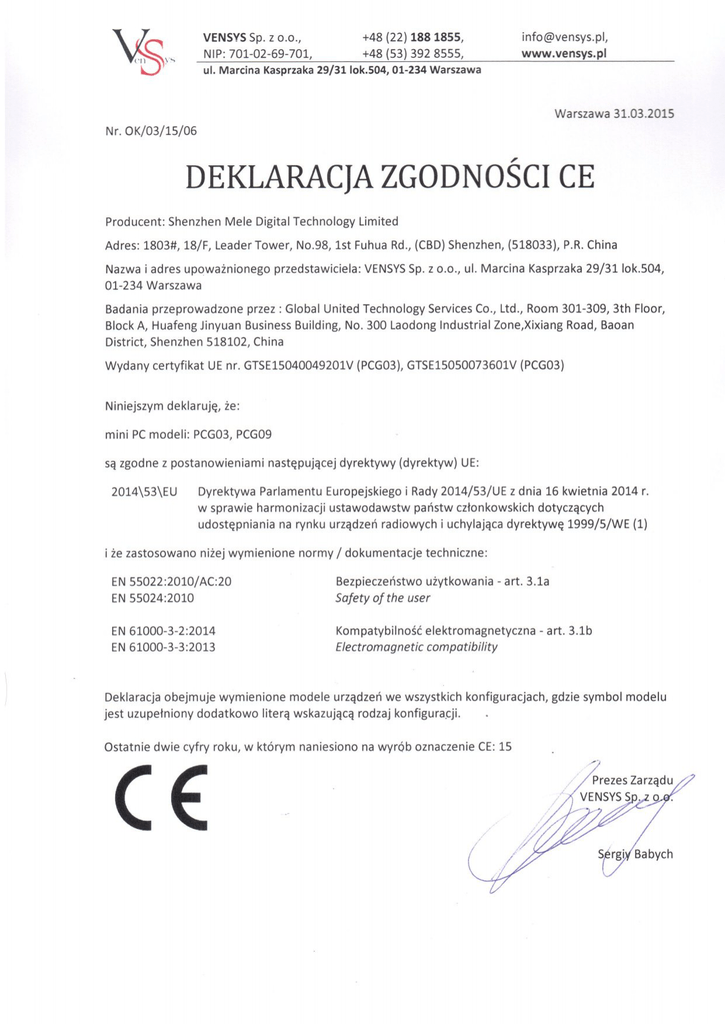 \& +48 (22) 188 1855, VENSYS Sp. z o.o., +48 (53) 392 8555, NIP: 701-02-69-701, ul. Marcina Kasprzaka 29/31 lok.504, 01-234 Warszawa \ "• [email protected], www.vensys.pl Warszawa 31.03.2015 Nr. OK/03/15/06 DEKLARACJA ZGODNOŚCI CE Producent: Shenzhen Mele Digital Technology Limited Adres: 1803#, 18/F, Leader Tower, No.98, 1st Fuhua Rd., (CBD) Shenzhen, (518033), P.R. China Nazwa i adres upoważnionego przedstawiciela: VENSYS Sp. z o.o., ul. Marcina Kasprzaka 29/31 lok.504, 01-234 Warszawa Badania przeprowadzone przez : Global United Technology Services Co., Ltd., Room 301-309, 3th Floor, Block A, Huafeng Jinyuan Business Building, No. 300 Laodong Industrial Zone,Xixiang Road, Baoan District, Shenzhen 518102, China Wydany certyfikat UE nr. GTSE15040049201V (PCG03), GTSE15050073601V (PCG03) Niniejszym deklaruję, że: mini PC modeli: PCG03, PCG09 są zgodne z postanowieniami następującej dyrektywy (dyrektyw) UE: 2014\53\EU Dyrektywa Parlamentu Europejskiego i Rady 2014/53/UE z dnia 16 kwietnia 2014 r. w sprawie harmonizacji ustawodawstw państw członkowskich dotyczących udostępniania na rynku urządzeń radiowych i uchylająca dyrektywę 1999/5/WE (1) i że zastosowano niżej wymienione normy / dokumentacje techniczne: EN 55022:2010/AC:20 EN 55024:2010 Bezpieczeństwo użytkowania - art. 3.la Safety of the user EN 61000-3-2:2014 EN 61000-3-3:2013 Kompatybilność elektromagnetyczna - art. 3.1b Electromagnetic compatibility Deklaracja obejmuje wymienione modele urządzeń we wszystkich konfiguracjach, gdzie symbol modelu jest uzupełniony dodatkowo literą wskazującą rodzaj konfiguracji. Ostatnie dwie cyfry roku, w którym naniesiono na wyrób oznaczenie CE: 15 C€ / Prezes Zarządu VENSYS Sp˙ ' OJ/. ?rgiy Babych