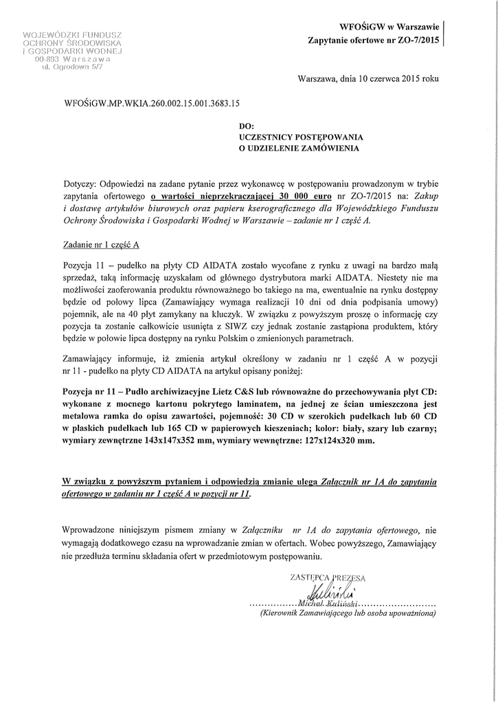 WFOSiGW w Warszawie WOJEWÓDZKI FLINDIJZ OC H • \IY ŚRODOWISKA Zapytanie ofertowe nr ZO-7/2015 i GL , )DAI:(KI WODNEJ ()O- •Vai(?wa ul. Ogrodom] 5,7 Warszawa, dnia 10 czerwca 2015 roku WFOSiGW.MP.WKIA.260.002.15.001.3683.15 DO: UCZESTNICY POSTĘPOWANIA O UDZIELENIE ZAMÓWIENIA Dotyczy: Odpowiedzi na zadane pytanie przez wykonawcę w postępowaniu prowadzonym w trybie zapytania ofertowego o wartości nieprzekraczającej 30 000 euro nr ZO-7/2015 na: Zakup i dostawę artykułów biurowych oraz papieru kserograficznego dla Wojewódzkiego Funduszu Ochrony Środowiska i Gospodarki Wodnej w Warszawie — zadanie nr] część A. Zadanie nr 1 część A Pozycja 11 — pudełko na płyty CD AlDATA zostało wycofane z rynku z uwagi na bardzo małą sprzedaż, taką informację uzyskałam od głównego dystrybutora marki A1DATA. Niestety nie ma możliwości zaoferowania produktu równoważnego bo takiego na ma, ewentualnie na rynku dostępny będzie od połowy lipca (Zamawiający wymaga realizacji 10 dni od dnia podpisania umowy) pojemnik, ale na 40 płyt zamykany na kluczyk. W związku z powyższym proszę o informację czy pozycja ta zostanie całkowicie usunięta z SIWZ czy jednak zostanie zastąpiona produktem, który będzie w połowie lipca dostępny na rynku Polskim o zmienionych parametrach. Zamawiający informuje, iż zmienia artykuł określony w zadaniu nr 1 część A w pozycji nr 11 - pudełko na płyty CD AIDATA na artykuł opisany poniżej: Pozycja nr 11 — Pudlo archiwizacyjne Lietz C&S lub równoważne do przechowywania płyt CD: wykonane z mocnego kartonu pokrytego laminatem, na jednej ze ścian umieszczona jest metalowa ramka do opisu zawartości, pojemność: 30 CD w szerokich pudełkach lub 60 CD w płaskich pudelkach lub 165 CD w papierowych kieszeniach; kolor: biały, szary lub czarny; wymiary zewnętrzne 143x147x352 mm, wymiary wewnętrzne: 127x124x320 mm. W związku z powyższym pytaniem i odpowiedzią zmianie u1e2a Załącznik nr JA do zapytania ofertowQro w zadaniu nr 1 cześć A w pozycji nr 11. Wprowadzone niniejszym pismem zmiany w Załqczniku nr IA do zapytania ofertowego, nie wymagają dodatkowego czasu na wprowadzanie zmian w ofertach. Wobec powyższego, Zamawiający nie przedłuża terminu składania ofert w przedmiotowym postępowaniu. ZASTĘPCA 'RE7 -SA a r .144 .c.it(14:. (Kierownik Zamawiającego lub osoba upoważniona)