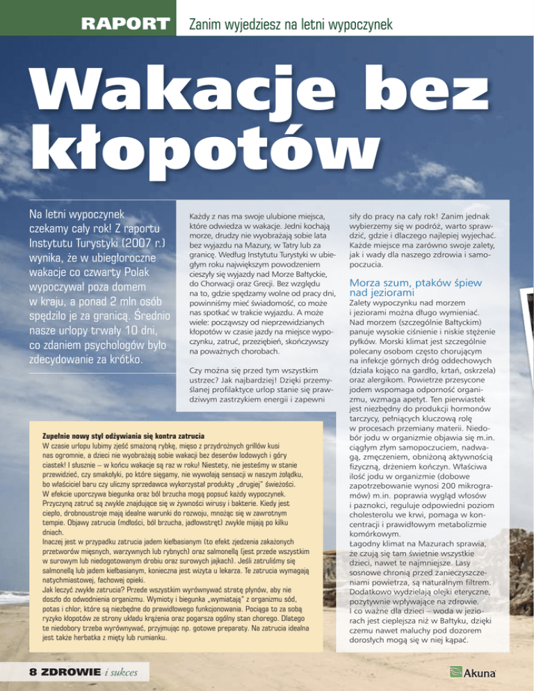 RAPORT Zanim wyjedziesz na letni wypoczynek Wakacje bez kłopotów Na letni wypoczynek czekamy cały rok! Z raportu Instytutu Turystyki (2007 r.) wynika, że w ubiegłoroczne wakacje co czwarty Polak wypoczywał poza domem w kraju, a ponad 2 mln osób spędziło je za granicą. Średnio nasze urlopy trwały 10 dni, co zdaniem psychologów było zdecydowanie za krótko. Każdy z nas ma swoje ulubione miejsca, które odwiedza w wakacje. Jedni kochają morze, drudzy nie wyobrażają sobie lata bez wyjazdu na Mazury, w Tatry lub za granicę. Według Instytutu Turystyki w ubiegłym roku największym powodzeniem cieszyły się wyjazdy nad Morze Bałtyckie, do Chorwacji oraz Grecji. Bez względu na to, gdzie spędzamy wolne od pracy dni, powinniśmy mieć świadomość, co może nas spotkać w trakcie wyjazdu. A może wiele: począwszy od nieprzewidzianych kłopotów w czasie jazdy na miejsce wypoczynku, zatruć, przeziębień, skończywszy na poważnych chorobach. Czy można się przed tym wszystkim ustrzec? Jak najbardziej! Dzięki przemyślanej profilaktyce urlop stanie się prawdziwym zastrzykiem energii i zapewni Zupełnie nowy styl odżywiania się kontra zatrucia W czasie urlopu lubimy zjeść smażoną rybkę, mięso z przydrożnych grillów kusi nas ogromnie, a dzieci nie wyobrażają sobie wakacji bez deserów lodowych i góry ciastek! I słusznie – w końcu wakacje są raz w roku! Niestety, nie jesteśmy w stanie przewidzieć, czy smakołyki, po które sięgamy, nie wywołają sensacji w naszym żołądku, bo właściciel baru czy uliczny sprzedawca wykorzystał produkty „drugiej” świeżości. W efekcie uporczywa biegunka oraz ból brzucha mogą popsuć każdy wypoczynek. Przyczyną zatruć są zwykle znajdujące się w żywności wirusy i bakterie. Kiedy jest ciepło, drobnoustroje mają idealne warunki do rozwoju, mnożąc się w zawrotnym tempie. Objawy zatrucia (mdłości, ból brzucha, jadłowstręt) zwykle mijają po kilku dniach. Inaczej jest w przypadku zatrucia jadem kiełbasianym (to efekt zjedzenia zakażonych przetworów mięsnych, warzywnych lub rybnych) oraz salmonellą (jest przede wszystkim w surowym lub niedogotowanym drobiu oraz surowych jajkach). Jeśli zatruliśmy się salmonellą lub jadem kiełbasianym, konieczna jest wizyta u lekarza. Te zatrucia wymagają natychmiastowej, fachowej opieki. Jak leczyć zwykłe zatrucia? Przede wszystkim wyrównywać stratę płynów, aby nie doszło do odwodnienia organizmu. Wymioty i biegunka „wymiatają” z organizmu sód, potas i chlor, które są niezbędne do prawidłowego funkcjonowania. Pociąga to za sobą ryzyko kłopotów ze strony układu krążenia oraz pogarsza ogólny stan chorego. Dlatego te niedobory trzeba wyrównywać, przyjmując np. gotowe preparaty. Na zatrucia idealna jest także herbatka z mięty lub rumianku. 8 ZDROWIE i sukces siły do pracy na cały rok! Zanim jednak wybierzemy się w podróż, warto sprawdzić, gdzie i dlaczego najlepiej wyjechać. Każde miejsce ma zarówno swoje zalety, jak i wady dla naszego zdrowia i samopoczucia. Morza szum, ptaków śpiew nad jeziorami Zalety wypoczynku nad morzem i jeziorami można długo wymieniać. Nad morzem (szczególnie Bałtyckim) panuje wysokie ciśnienie i niskie stężenie pyłków. Morski klimat jest szczególnie polecany osobom często chorującym na infekcje górnych dróg oddechowych (działa kojąco na gardło, krtań, oskrzela) oraz alergikom. Powietrze przesycone jodem wspomaga odporność organizmu, wzmaga apetyt. Ten pierwiastek jest niezbędny do produkcji hormonów tarczycy, pełniących kluczową rolę w procesach przemiany materii. Niedobór jodu w organizmie objawia się m.in. ciągłym złym samopoczuciem, nadwagą, zmęczeniem, obniżoną aktywnością fizyczną, drżeniem kończyn. Właściwa ilość jodu w organizmie (dobowe zapotrzebowanie wynosi 200 mikrogramów) m.in. poprawia wygląd włosów i paznokci, reguluje odpowiedni poziom cholesterolu we krwi, pomaga w koncentracji i prawidłowym metabolizmie komórkowym. Łagodny klimat na Mazurach sprawia, że czują się tam świetnie wszystkie dzieci, nawet te najmniejsze. Lasy sosnowe chronią przed zanieczyszczeniami powietrza, są naturalnym filtrem. Dodatkowo wydzielają olejki eteryczne, pozytywnie wpływające na zdrowie. I co ważne dla dzieci – woda w jeziorach jest cieplejsza niż w Bałtyku, dzięki czemu nawet maluchy pod dozorem dorosłych mogą się w niej kąpać. Zbilansowana dieta W czasie urlopu warto zadbać o właściwie zbilansowaną dietę. Polacy zdecydowanie za mało jedzą ryb (w przeciwieństwie do znanych z długowieczności Włochów czy Hiszpanów). Ryby to samo zdrowie. Zawierają witaminy z grupy B, A i E, łatwo przyswajalne białko oraz wielonienasycone kwasy tłuszczowe. Dzięki kwasom tłuszczowym omega-3 we krwi powstaje mniej skrzepów, hamowane są procesy zapalne i zbytnie kurczenie naczyń krwionośnych, zmniejsza się także ryzyko zawału serca. Ryby są źródłem fosforu, potasu i magnezu. Zawierają drogocenny jod! W dodatku w zasadzie nie tuczą, ponieważ mają niewiele kalorii. Wyjazd nad morze lub jezioro jest idealnym pretekstem, aby nauczyć swoje dziecko jeść smaczne ryby. Uwaga! Brytyjscy naukowcy w opublikowanych w angielskim dzienniku „Daily Mail” badaniach podkreślają, że zła dieta (opierająca się na przetworzonej żywności) powoduje u dzieci kłopoty z zapamiętywaniem oraz nauką. Jedzeniu w uwielbianych przez dzieci fast foodach brakuje witamin oraz podstawowych kwasów tłuszczowych, wspomagających pracę mózgu. Co więcej, z danych brytyjskiej Fundacji Zdrowia Psychicznego wynika, że brak w pożywieniu podstawowych witamin i minerałów oraz tłuszczów ma związek z rozwojem u dorosłych depresji oraz choroby Alzheimera. W jednym z angielskich miast – South Yorkshire – wprowadzono pionierski program leczenia chorób psychicznych poprzez zdrowe odżywianie. Co się okazało? Kiedy wyeliminowano 