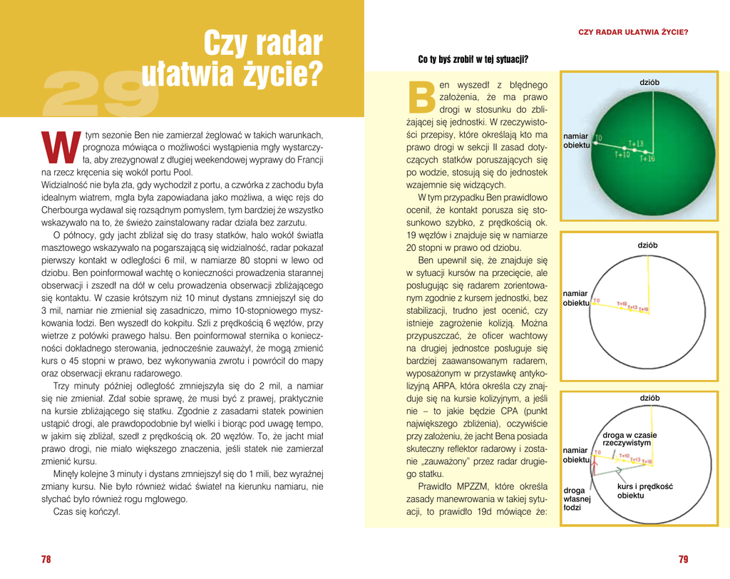 Czy radar ułatwia życie? 29 W tym sezonie Ben nie zamierzał żeglować w takich warunkach, prognoza mówiąca o możliwości wystąpienia mgły wystarczyła, aby zrezygnował z długiej weekendowej wyprawy do Francji na rzecz kręcenia się wokół portu Pool. Widzialność nie była zła, gdy wychodził z portu, a czwórka z zachodu była idealnym wiatrem, mgła była zapowiadana jako możliwa, a więc rejs do Cherbourga wydawał się rozsądnym pomysłem, tym bardziej że wszystko wskazywało na to, że świeżo zainstalowany radar działa bez zarzutu. O północy, gdy jacht zbliżał się do trasy statków, halo wokół światła masztowego wskazywało na pogarszającą się widzialność, radar pokazał pierwszy kontakt w odległości 6 mil, w namiarze 80 stopni w lewo od dziobu. Ben poinformował wachtę o konieczności prowadzenia starannej obserwacji i zszedł na dół w celu prowadzenia obserwacji zbliżającego się kontaktu. W czasie krótszym niż 10 minut dystans zmniejszył się do 3 mil, namiar nie zmieniał się zasadniczo, mimo 10-stopniowego myszkowania łodzi. Ben wyszedł do kokpitu. Szli z prędkością 6 węzłów, przy wietrze z połówki prawego halsu. Ben poinformował sternika o konieczności dokładnego sterowania, jednocześnie zauważył, że mogą zmienić kurs o 45 stopni w prawo, bez wykonywania zwrotu i powrócił do mapy oraz obserwacji ekranu radarowego. Trzy minuty później odległość zmniejszyła się do 2 mil, a namiar się nie zmieniał. Zdał sobie sprawę, że musi być z prawej, praktycznie na kursie zbliżającego się statku. Zgodnie z zasadami statek powinien ustąpić drogi, ale prawdopodobnie był wielki i biorąc pod uwagę tempo, w jakim się zbliżał, szedł z prędkością ok. 20 węzłów. To, że jacht miał prawo drogi, nie miało większego znaczenia, jeśli statek nie zamierzał zmienić kursu. Minęły kolejne 3 minuty i dystans zmniejszył się do 1 mili, bez wyraźnej zmiany kursu. Nie było również widać świateł na kierunku namiaru, nie słychać było również rogu mgłowego. Czas się kończył. 78 CZY RADAR UŁATWIA ŻYCIE? Co ty byś zrobił w tej sytuacji? B en wyszedł z błędnego założenia, że ma prawo drogi w stosunku do zbliżającej się jednostki. W rzeczywistości przepisy, które określają kto ma prawo drogi w sekcji II zasad dotyczących statków poruszających się po wodzie, stosują się do jednostek wzajemnie się widzących. W tym przypadku Ben prawidłowo ocenił, że kontakt porusza się stosunkowo szybko, z prędkością ok. 19 węzłów i znajduje się w namiarze 20 stopni w prawo od dziobu. Ben upewnił się, że znajduje się w sytuacji kursów na przecięcie, ale posługując się radarem zorientowanym zgodnie z kursem jednostki, bez stabilizacji, trudno jest ocenić, czy istnieje zagrożenie kolizją. Można przypuszczać, że oficer wachtowy na drugiej jednostce posługuje się bardziej zaawansowanym radarem, wyposażonym w przystawkę antykolizyjną ARPA, która określa czy znajduje się na kursie kolizyjnym, a jeśli nie – to jakie będzie CPA (punkt największego zbliżenia), oczywiście przy założeniu, że jacht Bena posiada skuteczny reflektor radarowy i zostanie „zauważony” przez radar drugiego statku. Prawidło MPZZM, które określa zasady manewrowania w takiej sytuacji, to prawidło 19d mówiące że: dziób namiar obiektu dziób namiar obiektu dziób namiar obiektu droga własnej łodzi droga w czasie rzeczywistym kurs i prędkość obiektu 79