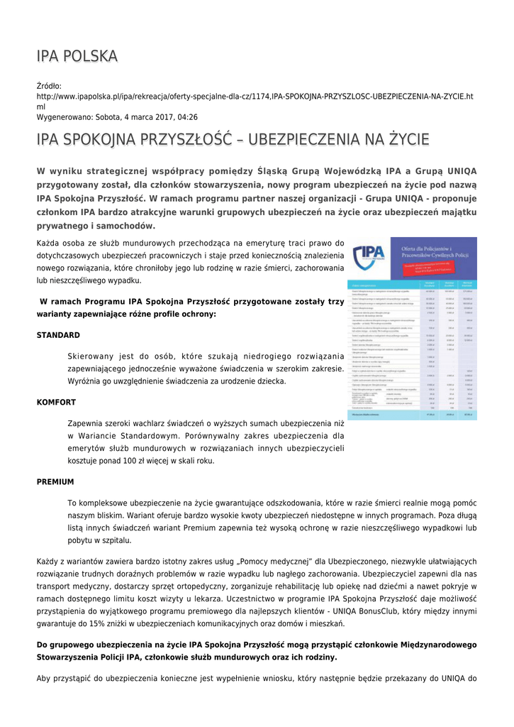 IPA POLSKA Źródło: http://www.ipapolska.pl/ipa/rekreacja/oferty-specjalne-dla-cz/1174,IPA-SPOKOJNA-PRZYSZLOSC-UBEZPIECZENIA-NA-ZYCIE.ht ml Wygenerowano: Sobota, 4 marca 2017, 04:26 IPA SPOKOJNA PRZYSZŁOŚĆ – UBEZPIECZENIA NA ŻYCIE W wyniku strategicznej współpracy pomiędzy Śląską Grupą Wojewódzką IPA a Grupą UNIQA przygotowany został, dla członków stowarzyszenia, nowy program ubezpieczeń na życie pod nazwą IPA Spokojna Przyszłość. W ramach programu partner naszej organizacji - Grupa UNIQA - proponuje członkom IPA bardzo atrakcyjne warunki grupowych ubezpieczeń na życie oraz ubezpieczeń majątku prywatnego i samochodów. Każda osoba ze służb mundurowych przechodząca na emeryturę traci prawo do dotychczasowych ubezpieczeń pracowniczych i staje przed koniecznością znalezienia nowego rozwiązania, które chroniłoby jego lub rodzinę w razie śmierci, zachorowania lub nieszczęśliwego wypadku. W ramach Programu IPA Spokojna Przyszłość przygotowane zostały trzy warianty zapewniające różne profile ochrony: STANDARD Skierowany jest do osób, które szukają niedrogiego rozwiązania zapewniającego jednocześnie wyważone świadczenia w szerokim zakresie. Wyróżnia go uwzględnienie świadczenia za urodzenie dziecka. KOMFORT Zapewnia szeroki wachlarz świadczeń o wyższych sumach ubezpieczenia niż w Wariancie Standardowym. Porównywalny zakres ubezpieczenia dla emerytów służb mundurowych w rozwiązaniach innych ubezpieczycieli kosztuje ponad 100 zł więcej w skali roku. PREMIUM To kompleksowe ubezpieczenie na życie gwarantujące odszkodowania, które w razie śmierci realnie mogą pomóc naszym bliskim. Wariant oferuje bardzo wysokie kwoty ubezpieczeń niedostępne w innych programach. Poza długą listą innych świadczeń wariant Premium zapewnia też wysoką ochronę w razie nieszczęśliwego wypadkowi lub pobytu w szpitalu. Każdy z wariantów zawiera bardzo istotny zakres usług „Pomocy medycznej” dla Ubezpieczonego, niezwykle ułatwiających rozwiązanie trudnych doraźnych problemów w razie wypadku lub nagłego zachorowania. Ubezpieczyciel zapewni dla nas transport medyczny, dostarczy sprzęt ortopedyczny, zorganizuje rehabilitację lub opiekę nad dziećmi a nawet pokryje w ramach dostępnego limitu koszt wizyty u lekarza. Uczestnictwo w programie IPA Spokojna Przyszłość daje możliwość przystąpienia do wyjątkowego programu premiowego dla najlepszych klientów - UNIQA BonusClub, który między innymi gwarantuje do 15% zniżki w ubezpieczeniach komunikacyjnych oraz domów i mieszkań. Do grupowego ubezpieczenia na życie IPA Spokojna Przyszłość mogą przystąpić członkowie Międzynarodowego Stowarzyszenia Policji IPA, członkowie służb mundurowych oraz ich rodziny. Aby przystąpić do ubezpieczenia konieczne jest wypełnienie wniosku, który następnie będzie przekazany do UNIQA do akceptacji. W celu złożenia wniosku można skorzystać z następujących kanałów: 1. napisać na adres [email protected] 2. zadzwonić do naszego call center pod numer 32 442 0 112 wew. 3 3. za pośrednictwem formularza na stronie IPA Śląsk pod linkiem: https://ipa-katowice.org/index.php?option=com_content&view=article&id=348&Itemid=1008 Ochrona rozpoczyna się po pozytywnej akceptacji naszego partnera. Ocena: 5/5 (2) Tweetnij