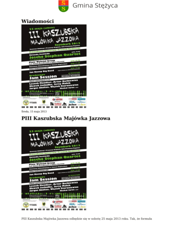 Wiadomości Środa, 15 maja 2013 PIII Kaszubska Majówka Jazzowa PIII Kaszubska Majówka Jazzowa odbędzie się w sobotę 25 maja 2013 roku. Tak, że formuła rodzinnego słuchania muzyki z poprzedniego roku zostanie podtrzymana. O godzinie 16.00 Festiwal koncert rozpocznie Jan Konop Big Band. Usłyszymy standardy muzyki jazzowej. 20 muzyków zagra z balkonu hotelowego bez nagłośnienia ale słychać ich będzie na kilka kilometrów. Orkiestra, choć młoda stażem zdobyła już mistrzowskie szlify na wielu koncertach w Polsce oraz zdobyła najwyższe nagrody na konkursach, m.in. I Miejsce na IV Konkursie " Big Band Festiwal" w Bydgoszczy w 2010 roku oraz Grad Prix na XVI „Big Band Festiwal" czerwiec 2011 w Nowym Tomyślu. Następnie publiczność przeniesie się do Sali Koncertowej, gdzie koncert solowy zagra Oskar Stabno, młody dobrze zapowiadający się 20-letni pianista znany i ceniony szczególnie w środowiskach muzycznych Poznania skąd pochodzi. Wzorem dla jego techniki i stylistyki jest Oskar Peterson , którego twórczością zafascynowany jest od lat. Posiada niesamowitą zdolność i umiejętność improwizacji niemalże na każdy dowolny temat. Wśród znajomych i przyjaciół nazywany jest także „ADHD fortepianu". Do tej pory uczestniczył w takich przedsięwzięciach jak Festiwal Muzyki Zakazanej w Międzyrzeczu, koncert na największym fortepianie świata w Szymbarku wykonanany wespół z Leszkim Możdżerem i innymi zaproszonymi pianistami, koncert pamięci Wojciecha Skowrońskiego na dziedzińcu poznańskiej Masztalarni i wiele innych. Obecnie koncertuje solo oraz w ramach Oskar Stabno Trio. O godz. 17.30 na scenie zaprezentuje się pianista Konstanty Wileński w repertuarze solowym oraz w duecie z kontrabasistą Tomaszem Kupcem. Konstantego Wileńskiego nie trzeba przedstawiać bowiem zna go cała Europa. Atrakcyjność dorobku muzycznego Konstantego Wileńskiego polega na symbiozie muzyki klasycznej i jazzowej ... Dziś ambicją tego muzyka jest budowanie pomostów pomiędzy jazzem a muzyką poważną. To zresztą wyróżnia go na tle większości "bardzo poważnych" kompozytorów i decyduje o jego oryginalności... (Ruch Muzyczny z 19 marca 2000 r.) O godzinie 18.30 scenę opanuje Piotr Wyleżoł Group w składzie Piotr Wyleżoł - fortepian, Michał Barański - kontrabas, Łukasz Zyta - perkusja a towarzyszyć im będą gościnnie Nelson Veras - brazylijski gitarzysta oraz Robert Majewski - jeden z najlepszych polskich trębaczy. Muzycy zaprezentują oprócz znanych standardów jazzowych również własne kompozycje. Piotr Wyleżol, lider zespołu jest jednym z najlepszych polskich pianistów. Grał z wielkimi jazzmanami tego świata m. in ze światowej sławy skrzypkiem Nigelem Kennedy. O godz. 20.00 na szymbarskiej scenie pojawi się Międzynarodowa Gwiazda Joscho Stephan Quartet. Zespół tworzą: Joscho Stephan - gitara solowa, na gitarze rytmicznej - Günter Stephan, na skrzypcach - Sebastian Reimann oraz na kontrabasie - Max Schaaf. Joscho Stephan swoją gitarową edukację rozpoczynał od nauki gry na gitarze klasycznej i, jak sam podkreśla w licznych wywiadach, to klasyczna technika jest głównym fundamentem jego dzisiejszych umiejętności. charakteryzujących się wyjątkową biegłością i precyzją gry. Obecnie Joscho Stephan reprezentuje styl określany mianem „gypsy jazz" lub „gypsy swinging guitar", którego został okrzyknięty niezrównanym mistrzem, przez co często nazywany bywa również następcą legendarnego Django Reinhardta. JOSCHO STEPHAN to niezwykły wirtuoz gitary z Niemiec. Krytycy na łamach prestiżowych pism muzycznych prześcigają się w zachwytach nad jego zniewalającą biegłością techniczną i precyzją gry. Często zwany jest także „NAJSZYBSZYM GITARZYSTĄ ŚWIATA"! Swoją gitarową edukację rozpoczynał od nauki gry na gitarze klasycznej i, jak sam podkreśla w licznych wywiadach, to klasyczna technika jest głównym fundamentem jego dzisiejszych umiejętności. JOSCHO STEPHAN koncertuje i nagrywa: Swinging Strings, Swing News, Acoustic Live, Django Forever, Gipsy meets Jazz - to płyty, które w muzycznej biblioteczce każdego miłośnika gitary znaleźć się muszą i z pewnością na ich okładkach nie zagości kurz. Na zakończenie koncertów festiwalowych ponownie usłyszymy Big Band, który poprowadzi Jan Konop, tym razem w sali koncertowej. W czasie półgodzinnej przerwy potrzebnej do przearanżowania sceny oraz widowni na potrzeby Jam Session publiczność będzie mogła rozkoszować się pobytem w hotelowym browarze wraz z degustacją znakomitego Kaszebsczego Piwa. Kiedy rozpocznie się urodzinowe Jam Session Mirka Mastalerza, publiczność poczuje się jak w prawdziwym klubie jazzowym. Swą obecność na jam sesion zapowiedzieli tacy muzycy jak: Leszek Możdżer, Artur Dutkiewicz, Sławek Jaskułke, Jerzy Małek, Jorgos Skolias, Wojtek Staroniewicz, Michał Jaros i inni. W miejscu odbywania się wszystkich koncertów tj. CEPR w Szymbarku można smacznie zjeść oraz przenocować w eleganckich pokojach hotelowych, w hostelu oraz pobliskich pensjonatach. Wszelkie informacje pod numerem telefonu 58 684 69 33 Bilety w cenach: 45 PLN ( ulgowy) 90 PLN (normalny) do nabycia w kasach CEPR, na portalu www.eBilet.pl oraz w salonach EMPiK