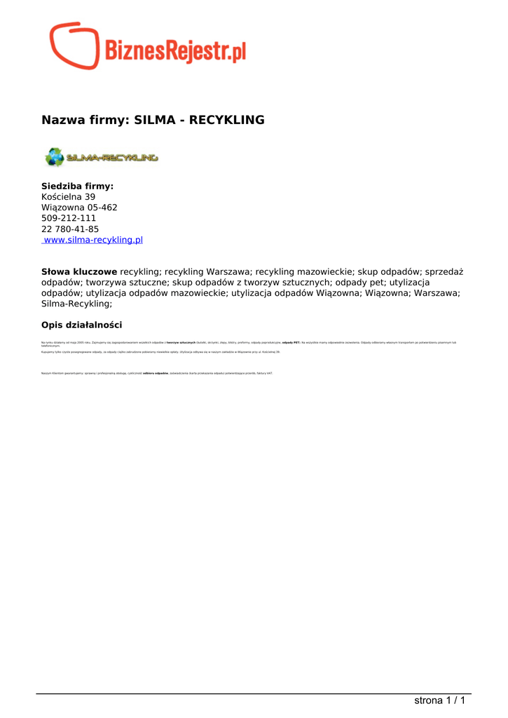 Nazwa firmy: SILMA - RECYKLING Siedziba firmy: Kościelna 39 Wiązowna 05-462 509-212-111 22 780-41-85 www.silma-recykling.pl Słowa kluczowe recykling; recykling Warszawa; recykling mazowieckie; skup odpadów; sprzedaż odpadów; tworzywa sztuczne; skup odpadów z tworzyw sztucznych; odpady pet; utylizacja odpadów; utylizacja odpadów mazowieckie; utylizacja odpadów Wiązowna; Wiązowna; Warszawa; Silma-Recykling; Opis działalności Na rynku działamy od maja 2005 roku. Zajmujemy się zagospodarowaniem wszelkich odpadów z tworzyw sztucznych (butelki, skrzynki, zlepy, blistry, preformy, odpady poprodukcyjne, odpady PET). Na wszystkie mamy odpowiednie zezwolenia. Odpady odbieramy własnym transportem po potwierdzeniu pisemnym lub telefonicznym. Kupujemy tylko czyste posegregowane odpady, za odpady ciężko zabrudzone pobieramy niewielkie opłaty. Utylizacja odbywa się w naszym zakładzie w Wiązownie przy ul. Kościelnej 39. Naszym Klientom gwarantujemy: sprawną i profesjonalną obsługę, cykliczność odbioru odpadów, zaświadczenia (karta przekazania odpadu) potwierdzające przerób, faktury VAT. strona 1 / 1 Powered by TCPDF (www.tcpdf.org)