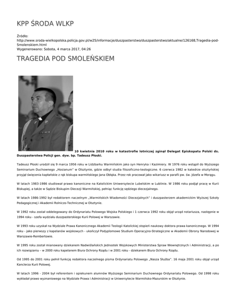KPP ŚRODA WLKP Źródło: http://www.sroda-wielkopolska.policja.gov.pl/w25/informacje/duszpasterstwo/duszpasterstwo/aktualne/126168,Tragedia-podSmolenskiem.html Wygenerowano: Sobota, 4 marca 2017, 04:26 TRAGEDIA POD SMOLEŃSKIEM 10 kwietnia 2010 roku w katastrofie lotniczej zginął Delegat Episkopatu Polski ds. Duszpasterstwa Policji gen. dyw. bp. Tadeusz Płoski. Tadeusz Płoski urodził się 9 marca 1956 roku w Lidzbarku Warmińskim jako syn Henryka i Kazimiery. W 1976 roku wstąpił do Wyższego Seminarium Duchownego „Hosianum” w Olsztynie, gdzie odbył studia filozoficzno-teologiczne. 6 czerwca 1982 w katedrze olsztyńskiej przyjął święcenia kapłańskie z rąk biskupa warmińskiego Jana Obłąka. Przez rok pracował jako wikariusz w parafii pw. św. Józefa w Morągu. W latach 1983-1986 studiował prawo kanoniczne na Katolickim Uniwersytecie Lubelskim w Lublinie. W 1986 roku podjął pracę w Kurii Biskupiej, a także w Sądzie Biskupim Diecezji Warmińskiej, pełniąc funkcję sędziego diecezjalnego. W latach 1986-1992 był redaktorem naczelnym „Warmińskich Wiadomości Diecezjalnych” i duszpasterzem akademickim Wyższej Szkoły Pedagogicznej i Akademii Rolniczo-Technicznej w Olsztynie. W 1992 roku został oddelegowany do Ordynariatu Polowego Wojska Polskiego i 1 czerwca 1992 roku objął urząd notariusza, następnie w 1994 roku - szefa wydziału duszpasterskiego Kurii Polowej w Warszawie. W 1993 roku uzyskał na Wydziale Prawa Kanonicznego Akademii Teologii Katolickiej stopień naukowy doktora prawa kanonicznego. W 1994 roku - jako pierwszy z kapelanów wojskowych - ukończył Podyplomowe Studium Operacyjno-Strategiczne w Akademii Obrony Narodowej w Warszawie-Rembertowie. W 1995 roku został mianowany dziekanem Nadwiślańskich Jednostek Wojskowych Ministerstwa Spraw Wewnętrznych i Administracji, a po ich rozwiązaniu – w 2000 roku kapelanem Biura Ochrony Rządu i w 2001 roku - dziekanem Biura Ochrony Rządu. Od 1995 do 2001 roku pełnił funkcję redaktora naczelnego pisma Ordynariatu Polowego „Nasza Służba”. 16 maja 2001 roku objął urząd Kanclerza Kurii Polowej. W latach 1996 - 2004 był referentem i opiekunem alumnów Wyższego Seminarium Duchownego Ordynariatu Polowego. Od 1998 roku wykładał prawo wyznaniowego na Wydziale Prawa i Administracji w Uniwersytecie Warmińsko-Mazurskim w Olsztynie. Z ramienia Ordynariatu Polowego Wojska Polskiego pełnił funkcję korespondenta Radia Watykańskiego i Katolickiej Agencji Informacyjnej. Nominowany na stopnie wojskowe kolejno: 1992 rok – kapitan; 1995 rok – major; 1998 rok – podpułkownik; 2000 rok – pułkownik; 2004 rok generał brygady; 2006 rok – generał dywizji. 10 marca 1999 roku otrzymał godność Prałata Jego Świątobliwości. 16 października 2004 roku został mianowany przez Ojca Świętego Jana Pawła drugim Biskupem Polowym Wojska Polskiego. 30 października 2004 roku przyjął święcenia biskupie i odbył uroczysty Ingres z ceremoniałem wojskowym do Katedry Polowej Wojska Polskiego w Warszawie. Uchwałą 330. Zebrania Plenarnego KEP w Częstochowie w dniu 26 listopada 2004 roku został mianowany Krajowym Duszpasterzem Kombatantów. W dniu 9 marca 2005 roku decyzją Konferencji Episkopatu Polski został Delegatem KEP ds. Duszpasterstwa Harcerzy. W dniu 23 czerwca 2005 roku Prezes Rady Ministrów RP powołał Biskupa Płoskiego w skład Rady Ochrony Pamięci Walk i Męczeństwa; był także członkiem Rady Powierniczej Muzeum Powstania Warszawskiego. Biskup Polowy otrzymał 8 maja 2006 roku, Order św. Stanisława W dniu 10 maja 2006 roku wykonał skok spadochronowy z wysokości 4000 m podczas ćwiczeń z żołnierzami Wojskowej Formacji Specjalnej GROM. 19 października 2006 roku, podczas 337. Zebrania Plenarnego Konferencji Episkopatu Polski, został wybrany członkiem Rady Prawnej Episkopatu Polski. Tego też dnia uchwałą Zgromadzenia Plenarnego Konferencji Episkopatu Polski do duszpasterstwa Ordynariatu Polowego w Polsce została włączona Służba Celna Rzeczpospolitej Polskiej. 23 listopada 2006 roku uchwałą 338. Zebrania Plenarnego Konferencji Episkopatu Polski Straż Ochrony Kolei została włączona do duszpasterstwa Ordynariatu Polowego. Konferencja Episkopatu Polski podczas 341. Zebrania Plenarnego Episkopatu Polski obradującego w dniach 2-3 października 2007 roku wybrała Biskupa Tadeusza Płoskiego – Delegatem Konferencji Episkopatu Polski ds. Duszpasterstwa Policji. 6 marca 2008 roku Biskup Polowy Wojska Polskiego gen. dyw. prof. dr hab. Tadeusz Płoski uchwałą 343 Zebrania Plenarnego Konferencji Episkopatu Polski został wybrany członkiem Rady ds. Duszpasterstwa Młodzieży. Będąc wykładowcą prawa wyznaniowego na Wydziale Prawa i Administracji w Uniwersytecie Warmińsko-Mazurskim opublikował ponad 150 artykułów naukowych i popularnonaukowych; uczestniczył w wielu konferencjach i sympozjach w kraju i za granicą poświęconych zagadnieniom prawa i duszpasterstwa wojskowego. 11 grudnia 2007 roku Rada Wydziału Prawa i Administracji Uniwersytetu Mikołaja Kopernika w Toruniu nadała Biskupowi Polowemu gen. dyw. dr. Tadeuszowi Płoskiemu stopień naukowy doktora habilitowanego nauk prawnych po odbytym kolokwium habilitacyjnym i na podstawie publikacji „Duszpasterstwo w Wojsku Polskim. Studium prawne z uwzględnieniem praw człowieka i prawa humanitarnego” (Olsztyn 2006, Wydawnictwo Uniwersytetu Warmińsko-Mazurskiego w Olsztynie). 29 lutego 2008 roku Senat Uniwersytetu Warmińsko Mazurskiego powołał Biskupa Tadeusza Płoskiego na stanowisko profesora tegoż Uniwersytetu a następnie na kierownika Katedry Prawa Administracyjnego i Nauki o Administracji UWM. Biskup polowy został odznaczony wieloma odznaczeniami państwowymi m.in. Krzyżem Kawalerskim Orderu Odrodzenia Polski, Srebrnym Medalem „Siły Zbrojne w Służbie Ojczyzny”, portugalskim odznaczenie "Bem Merecer" Złotym Krzyżem Zasługi oraz odznakami wielu instytucji wojskowych, komb