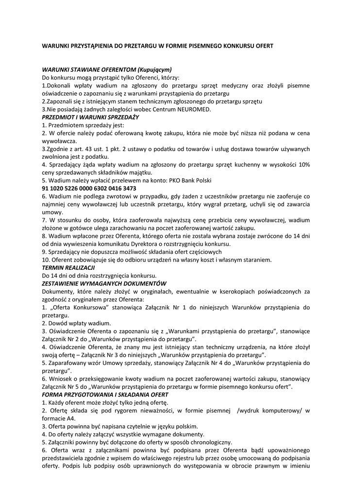 WARUNKI PRZYSTĄPIENIA DO PRZETARGU W FORMIE PISEMNEGO KONKURSU OFERT WARUNKI STAWIANE OFERENTOM (Kupującym) Do konkursu mogą przystąpić tylko Oferenci, którzy: 1.Dokonali wpłaty wadium na zgłoszony do przetargu sprzęt medyczny oraz złożyli pisemne oświadczenie o zapoznaniu się z warunkami przystąpienia do przetargu 2.Zapoznali się z istniejącym stanem technicznym zgłoszonego do przetargu sprzętu 3.Nie posiadają żadnych zaległości wobec Centrum NEUROMED. PRZEDMIOT I WARUNKI SPRZEDAŻY 1. Przedmiotem sprzedaży jest: 2. W ofercie należy podać oferowaną kwotę zakupu, która nie może być niższa niż podana w cena wywoławcza. 3.Zgodnie z art. 43 ust. 1 pkt. 2 ustawy o podatku od towarów i usług dostawa towarów używanych zwolniona jest z podatku. 4. Sprzedający żąda wpłaty wadium na zgłoszony do przetargu sprzęt kuchenny w wysokości 10% ceny sprzedawanych składników majątku. 5. Wadium należy wpłacić przelewem na konto: PKO Bank Polski 91 1020 5226 0000 6302 0416 3473 6. Wadium nie podlega zwrotowi w przypadku, gdy żaden z uczestników przetargu nie zaoferuje co najmniej ceny wywoławczej lub uczestnik przetargu, który wygrał przetarg, uchyli się od zawarcia umowy. 7. W stosunku do osoby, która zaoferowała najwyższą cenę przebicia ceny wywoławczej, wadium złożone w gotówce ulega zarachowaniu na poczet zaoferowanej wartość zakupu. 8. Wadium wpłacone przez Oferenta, którego oferta nie została wybrana zostaje zwrócone do 14 dni od dnia wywieszenia komunikatu Dyrektora o rozstrzygnięciu konkursu. 9. Sprzedający nie dopuszcza możliwość składania ofert częściowych 10. Oferent zobowiązuje się do odbioru urządzeń na własny koszt i własnym staraniem. TERMIN REALIZACJI Do 14 dni od dnia rozstrzygnięcia konkursu. ZESTAWIENIE WYMAGANYCH DOKUMENTÓW Dokumenty, które należy złożyć w oryginałach, ewentualnie w kserokopiach poświadczonych za zgodność z oryginałem przez Oferenta: 1. „Oferta Konkursowa” stanowiąca Załącznik Nr 1 do niniejszych Warunków przystąpienia do przetargu. 2. Dowód wpłaty wadium. 3. Oświadczenie Oferenta o zapoznaniu się z „Warunkami przystąpienia do przetargu”, stanowiące Załącznik Nr 2 do „Warunków przystąpienia do przetargu”. 4. Oświadczenie Oferenta, że znany mu jest istniejący stan techniczny urządzenia, na które złożył swoją ofertę – Załącznik Nr 3 do niniejszych „Warunków przystąpienia do przetargu”. 5. Zaparafowany wzór Umowy sprzedaży, stanowiący Załącznik Nr 4 do „Warunków przystąpienia do przetargu”. 6. Wniosek o przeksięgowanie kwoty wadium na poczet zaoferowanej wartości zakupu, stanowiący Załącznik Nr 5 do „Warunków przystąpienia do przetargu w formie pisemnego konkursu ofert”. FORMA PRZYGOTOWANIA I SKŁADANIA OFERT 1. Każdy oferent może złożyć tylko jedną ofertę. 2. Ofertę składa się pod rygorem nieważności, w formie pisemnej /wydruk komputerowy/ w formacie A4. 3. Oferta powinna być napisana czytelnie w języku polskim. 4. Do oferty należy załączyć wszystkie wymagane dokumenty. 5. Załączniki powinny być dołączone do oferty w sposób chronologiczny. 6. Oferta wraz z załącznikami powinna być podpisana przez Oferenta bądź upoważnionego przedstawiciela zgodnie z wpisem do właściwego rejestru lub przez osobę umocowaną do podpisania oferty. Podpis lub podpisy osób uprawnionych do występowania w obrocie prawnym w imieniu Wykonawcy muszą być czytelne, a w przypadku, gdy są nieczytelne powinny być opisane pieczątkami imiennymi. 7.Wszelkie poprawki lub zmiany w treści oferty i załącznikach powinny być czytelne, parafowane przez osobę uprawnioną do podpisywania oferty. 8. Oferent ponosi wszelkie koszty związane z przygotowaniem i złożeniem oferty. 9.Wszystkie strony oferty i załączniki powinny być kolejno ponumerowane i spięte lub zszyte w sposób trwały, 10. Oferta powinna zostać złożona w nieprzejrzystej i zamkniętej kopercie w sposób uniemożliwiający jej przypadkowe otwarcie. Kopertę należy opisać następująco: Centrum Neuropsychiatrii NEUROMED SP ZOZ ul. Białowieska 74a, 54-235 Wrocław Konkurs ofert na sprzedaż używanego sprzętu kuchennego Nie otwierać przed dniem 21.02.2013 r. przed godz.12³º Nazwa (Nazwisko) Oferenta Adres siedziby (zamieszkania) Oferenta SPOSÓB UDZIELANIA WYJAŚNIEŃ NA TEMAT WARUNKÓW KONKURSU 1. Oferenci mogą składać pisemne zapytania dotyczące warunków konkursu. Pismo należy dostarczyć: a) bezpośrednio do Centrum Nuropsychiatrii NEUROMED-z-ca dyr. da administracyjnoorganizacyjnych , wejście A I piętro (od poniedziałku do piątku w godzinach od 9:00 do 15:00), b) lub wysłać faksem na numer 71/ 350 170 80 w.42 , bądź e-mailem na adres: [email protected] z zaznaczeniem „zbycie sprzętu kuchennego” 2. Wszystkie wątpliwości zostaną wyjaśnione, jeśli zapytanie Centrum otrzyma nie później niż do dnia 19.02.2013 r.. Pisma, które wpłyną po terminie, pozostaną bez odpowiedzi. 3. W uzasadnionych przypadkach (przed terminem składania ofert) Centrum dopuszcza możliwość wprowadzenia zmian w treści warunków konkursu, jak również wyznaczania nowego terminu składania i otwarcia ofert. OSOBY UPRAWNIONE DO KONTAKTÓW Z OFERENTAMI Osobami upoważnionymi przez Sprzedającego do kontaktowania się z Oferentami są: Jadwiga Dul z-ca dyr. ds. administracyjno-organizacyjnych Tel. 71 350 17 80 w.42 Izabella Jaroszek – pracownik administracyjny 350 17 80 w.47 MIEJSCE, TERMIN I SPOSÓB SKŁADANIA OFERT 1.Ofertę należy złożyć w sekretariacie Centrum NEUROMED w nieprzekraczalnym terminie do dnia 21.02.2013 godz. 12 ºº 2. Oferta złożona po terminie zostanie zwrócona Oferentowi bez otwierania. MIEJSCE I TERMIN PUBLICZNEGO OTWARCIA OFERT Otwarcie ofert nastąpi w dniu 21.02.2013r. o godz. 12³º w gabinecie z-cy dyrektora pok. 32a wejście A INFORMACJE O TRYBIE PUBLICZNEGO OTWARCIA I OCENY OFERT 1. Oferenci mog
