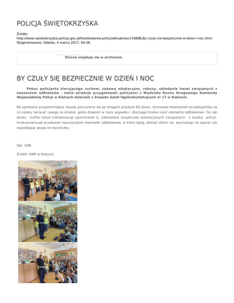POLICJA ŚWIĘTOKRZYSKA Źródło: http://www.swietokrzyska.policja.gov.pl/kie/dzialania-policji/aktualnosci/16688,By-czuly-sie-bezpiecznie-w-dzien-i-noc.html Wygenerowano: Sobota, 4 marca 2017, 04:26 Strona znajduje się w archiwum. BY CZUŁY SIĘ BEZPIECZNIE W DZIEŃ I NOC Pokaz policjanta kierującego ruchem, zabawy edukacyjne, rebusy, układanie haseł związanych z noszeniem odblasków - takie atrakcje przygotowali policjanci z Wydziału Ruchu Drogowego Komendy Wojewódzkiej Policji w Kielcach dzieciom z Zespołu Szkół Ogólnokształcących nr 17 w Kielcach. Na spotkanie przypominające zasady poruszania się po drogach przybyło 60 dzieci. Uczniowie dowiedzieli od policjantów na co należy zwracać uwagę na drodze, gdzie dzwonić w razie wypadku i dlaczego trzeba nosić elementy odblaskowe. Do rąk dzieci trafiło także kilkadziesiąt upominków tj. odblasków książeczek edukacyjnych związanych z służbą policji. Funkcjonariusze przekazali nauczycielom kamizelki odblaskowe, w które będą ubierać dzieci np. wychodząc na spacer lub wyjeżdżając grupą na wycieczkę. Opr. AZB Źródło: KWP w Kielcach Ocena: 5/5 (1) Tweetnij