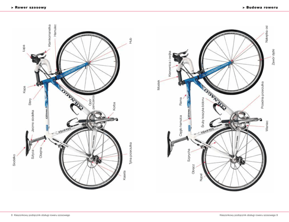 8 Kieszonkowy podręcznik obsługi roweru szosowego Nypel Szprycha Tylna przerzutka Obręcz Kaseta Obejma Sztyca Siodełko Rama Wieniec Mostek Przednia przerzutka Śruby koszyka bidonu Cięgło hamulca Opór panczerza Stery Korba Jarzmo siodełka Kapa Zawór dętki Kierownica i owijka Nakrętka osi Hub Hamulec Klamkomanetka Łapa > R o wer szosow y > B udo w a ro w e r u Kieszonkowy podręcznik obsługi roweru szosowego 9