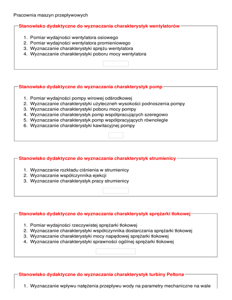 Pracownia maszyn przepływowych Stanowisko dydaktyczne do wyznaczania charakterystyk wentylatorów 1. 2. 3. 4. Pomiar wydajności wentylatora osiowego Pomiar wydajności wentylatora promieniowego Wyznaczanie charakterystyki sprężu wentylatora Wyznaczanie charakterystyki poboru mocy wentylatora Stanowisko dydaktyczne do wyznaczania charakterystyk pomp 1. 2. 3. 4. 5. 6. Pomiar wydajności pompy wirowej odśrodkowej Wyznaczanie charakterystyki użyteczneh wysokości podnoszenia pompy Wyznaczanie charakterystyki poboru mocy pompy Wyznaczanie charakterystyk pomp współpracujących szeregowo Wyznaczanie charakterystyk pomp współpracyjących równolegle Wyznaczanie charakterystyki kawitacyjnej pompy Stanowisko dydaktyczne do wyznaczania charakterystyk strumienicy 1. Wyznaczanie rozkładu ciśnienia w strumienicy 2. Wyznaczanie współczynnika ejekcji 3. Wyznaczanie charakterystyk pracy strumienicy Stanowisko dydaktyczne do wyznaczania charakterystyk sprężarki tłokowej 1. 2. 3. 4. Pomiar wydajności rzeczywistej sprężarki tłokowej Wyznaczanie charakterystyki współczynnika dostarczania sprężarki tłokowej Wyznaczanie charakterystyki mocy napędowej sprężarki tłokowej Wyznaczanie charakterystyki sprawności ogólnej sprężarki tłokowej Stanowisko dydaktyczne do wyznaczania charakterystyk turbiny Peltona 1. Wyznaczanie wpływu natężenia przepływu wody na parametry mechaniczne na wale turbiny Peltona 2. Wyznaczanie wpływu natężenia przepływu wody na moc elektryczną 3. Wyznaczanie sprawności ogólnej turbiny Peltona Stanowisko dydaktyczne do wyznaczania charakterystyk turbiny wiatrowej 1. Waznaczenie rozkładu prędkości i ciśnienia powietrza w kanale aerodynamicznym 2. Wyznaczenie granicznych (minimalnych) parametrów wiatru wymaganych do napędu turbiny wiatrowej 3. Wyznaczenie wpływu prędkości przepływu powietrza na parametry mechaniczne na wale turbiny wiatrowej 4. Wyznaczenie mocy elektrowni wiatrowej 5. Określenie sprawności elektrowni wiatrowej