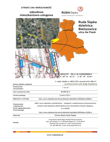 ATRAKCYJNA NIERUCHOMOŚĆ zabudowa mieszkaniowo-usługowa Ruda Śląska dzielnica Bielszowice ulica Na Piaski 4855/270 KW nr GL1S/00028006/2 N 50O 16’ 20.72’’ E 18O 49’ 35.84’’ Numery działek i położenie Powierzchnia nieruchomości Cena wywoławcza netto Termin przetargu Ogłoszenie o przetargu Przeznaczenie w Miejscowym Planie zagospodarowania Przestrzennego ½ część działki nr 4854/270 o powierzchni 408 m2, z przeznaczeniem pod drogę dojazdową 1 173 m2 88 000,00 zł 6 marca 2013 r. http://www.rudaslaska.bip.info.pl/dokument.php?iddok=34424&idmp=2028&r=r MNU1 teren zabudowy mieszkaniowo – usługowej z podstawowym przeznaczeniem gruntów pod zabudowę jednorodzinną oraz nieuciążliwą funkcję usługową. (§ 16 MPZP) http://www.rudaslaska.bip.info.pl/dokument.php?iddok=7697&idmp=1229&r=o Właściciel Kontakt Gmina Miasto Ruda Śląska Urząd Miasta Ruda Śląska Wydział Rozwoju Miasta, plac Jana Pawła II 6, 41-709 Ruda Śląska tel. 32 244 90 49 Krzysztof Żok, doradca ds. ofert inwestycyjnych tel. 607 899 955, e-mail: [email protected] www.rudaslaska.pl