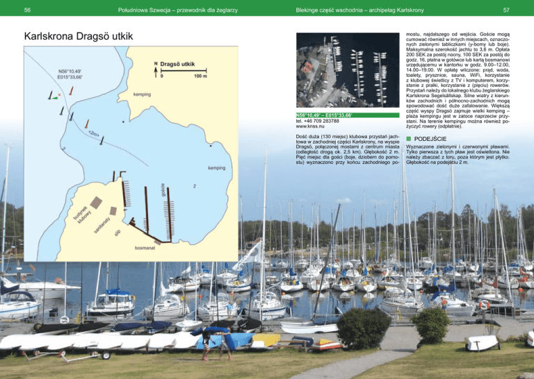 56 Południowa Szwecja – przewodnik dla żeglarzy Blekinge część wschodnia – archipelag Karlskrony Karlskrona Dragsö utkik N56°10,49’ – E015°33,66’ tel. +46 709 283788 www.knss.nu Dość duża (130 miejsc) klubowa przystań jachtowa w zachodniej części Karlskrony, na wyspie Dragsö, połączonej mostami z centrum miasta (odległość drogą ok. 2,5 km). Głębokość 2 m. Pięć miejsc dla gości (boje, dziobem do pomostu) wyznaczono przy końcu zachodniego po- 57 mostu, najdalszego od wejścia. Goście mogą cumować również w innych miejscach, oznaczonych zielonymi tabliczkami (y-bomy lub boje). Maksymalna szerokość jachtu to 3,6 m. Opłata 200 SEK za postój nocny, 100 SEK za postój do godz. 16, płatna w gotówce lub kartą bosmanowi urzędującemu w kantorku w godz. 9.00–12.00, 14.00–19.00. W opłatę wliczone: prąd, woda, toalety, prysznice, sauna, WiFi, korzystanie z klubowej świetlicy z TV i komputerem, korzystanie z pralki, korzystanie z (pięciu) rowerów. Przystań należy do lokalnego klubu żeglarskiego Karlskrona Segelsällskap. Silne wiatry z kierunków zachodnich i północno-zachodnich mogą spowodować dość duże zafalowanie. Większą część wyspy Dragsö zajmuje wielki kemping – plaża kempingu jest w zatoce naprzeciw przystani. Na terenie kempingu można również pożyczyć rowery (odpłatnie). n Podejście Wyznaczone zielonymi i czerwonymi pławami. Tylko pierwsza z tych pław jest oświetlona. Nie należy zbaczać z toru, poza którym jest płytko. Głębokość na podejściu 2 m.
