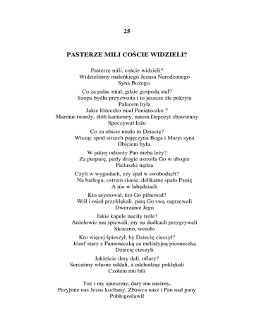 25 PASTERZE MILI COŚCIE WIDZIELI? Pasterze mili, coście widzieli? Widzieliśmy maleńkiego Jezusa Narodzonego Syna Bożego. Co za pałac miał, gdzie gospodą stał? Szopa bydłu przyzwoita i to jeszcze źle pokryta Pałacem była Jakie łóżeczko miał Paniąteczko ? Marmur twardy, żłób kamienny, natem Depozyt zbawienny Spoczywał łożu Co za obicie miało to Dziecię? Wisząc spod strzech pajęczyna Boga i Maryi syna Obiciem była. W jakiej odzieży Pan nieba leży? Za purpurę, perły drogie ustroiła Go w ubogie Pieluszki nędza Czyli w wygodach, czy spał w swobodach? Na barłogu, ostrem sianie, delikatne spało Panię A nie w łabędziach Kto asystował, kto Go pilnował? Wół i osioł przyklękali, parą Go swą zagrzewali Dworzanie Jego Jakie kapele nuciły trele? Aniołowie mu śpiewali, my na dudkach przygrywali Skoczno, wesoło Kto więcej śpieszył, by Dziecię cieszył? Józef stary z Panieneczką za melodyjną piosneczką Dziecię cieszyli Jakieście dary dali, ofiary? Sercaśmy własne oddali, a odchodząc poklękali Czołem mu bili Toż i my śpieszmy, dary mu nieśmy, Przyjmie nas Jezus kochany, Zbawca nasz i Pan nad pany Pobłogosławił