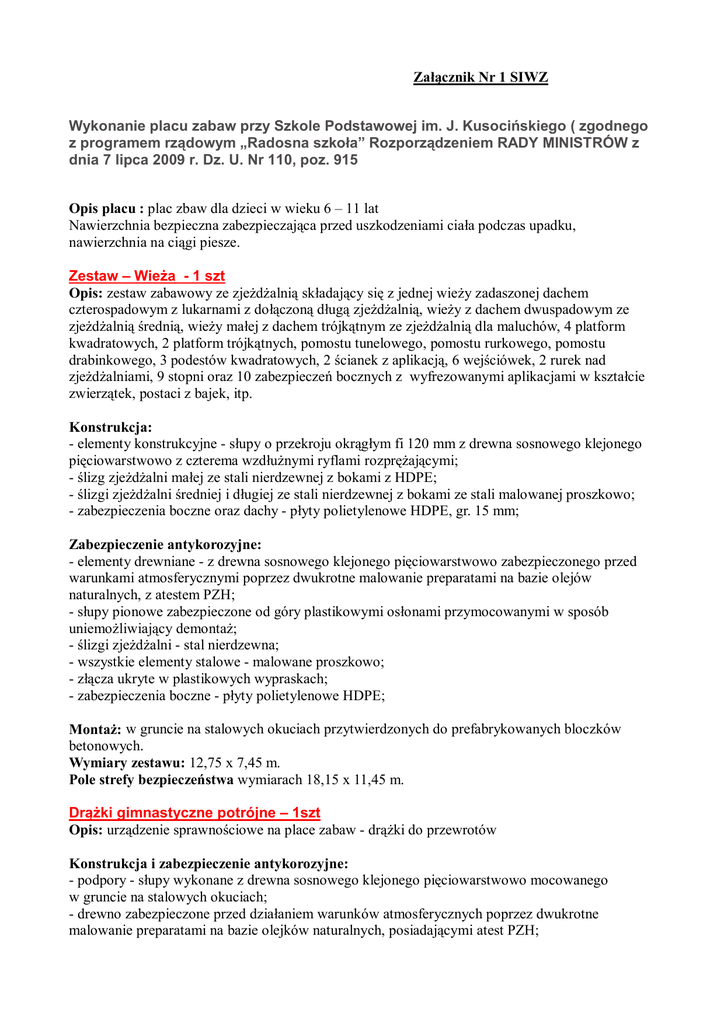 Załącznik Nr 1 SIWZ Wykonanie placu zabaw przy Szkole Podstawowej im. J. Kusocińskiego ( zgodnego z programem rządowym „Radosna szkoła” Rozporządzeniem RADY MINISTRÓW z dnia 7 lipca 2009 r. Dz. U. Nr 110, poz. 915 Opis placu : plac zbaw dla dzieci w wieku 6 – 11 lat Nawierzchnia bezpieczna zabezpieczająca przed uszkodzeniami ciała podczas upadku, nawierzchnia na ciągi piesze. Zestaw – Wieża - 1 szt Opis: zestaw zabawowy ze zjeżdżalnią składający się z jednej wieży zadaszonej dachem czterospadowym z lukarnami z dołączoną długą zjeżdżalnią, wieży z dachem dwuspadowym ze zjeżdżalnią średnią, wieży małej z dachem trójkątnym ze zjeżdżalnią dla maluchów, 4 platform kwadratowych, 2 platform trójkątnych, pomostu tunelowego, pomostu rurkowego, pomostu drabinkowego, 3 podestów kwadratowych, 2 ścianek z aplikacją, 6 wejściówek, 2 rurek nad zjeżdżalniami, 9 stopni oraz 10 zabezpieczeń bocznych z wyfrezowanymi aplikacjami w kształcie zwierzątek, postaci z bajek, itp. Konstrukcja: - elementy konstrukcyjne - słupy o przekroju okrągłym fi 120 mm z drewna sosnowego klejonego pięciowarstwowo z czterema wzdłużnymi ryflami rozprężającymi; - ślizg zjeżdżalni małej ze stali nierdzewnej z bokami z HDPE; - ślizgi zjeżdżalni średniej i długiej ze stali nierdzewnej z bokami ze stali malowanej proszkowo; - zabezpieczenia boczne oraz dachy - płyty polietylenowe HDPE, gr. 15 mm; Zabezpieczenie antykorozyjne: - elementy drewniane - z drewna sosnowego klejonego pięciowarstwowo zabezpieczonego przed warunkami atmosferycznymi poprzez dwukrotne malowanie preparatami na bazie olejów naturalnych, z atestem PZH; - słupy pionowe zabezpieczone od góry plastikowymi osłonami przymocowanymi w sposób uniemożliwiający demontaż; - ślizgi zjeżdżalni - stal nierdzewna; - wszystkie elementy stalowe - malowane proszkowo; - złącza ukryte w plastikowych wypraskach; - zabezpieczenia boczne - płyty polietylenowe HDPE; Montaż: w gruncie na stalowych okuciach przytwierdzonych do prefabrykowanych bloczków betonowych. Wymiary zestawu: 12,75 x 7,45 m. Pole strefy bezpieczeństwa wymiarach 18,15 x 11,45 m. Drążki gimnastyczne potrójne – 1szt Opis: urządzenie sprawnościowe na place zabaw - drążki do przewrotów Konstrukcja i zabezpieczenie antykorozyjne: - podpory - słupy wykonane z drewna sosnowego klejonego pięciowarstwowo mocowanego w gruncie na stalowych okuciach; - drewno zabezpieczone przed działaniem warunków atmosferycznych poprzez dwukrotne malowanie preparatami na bazie olejków naturalnych, posiadającymi atest PZH; - poprzeczki - stal zabezpieczona przed korozją poprzez malowanie proszkowe; - okucia - stal malowana proszkowo Montaż: Montaż w gruncie na stalowych okuciach. Wymiary: wys. 80-150 cm, szer. 300 cm. Pole strefy bezpieczeństwa o wymiarach: 300 x 600 cm Linarium stożek – 1 szt Opis: urządzenie sprawnościowe, trwale posadowione Konstrukcja: - 1 stalowy maszt , stal nierdzewna malowana proszkowo; wys: 3,00 m. - zestaw lin z rdzeniem stalowym w oprzędzie polipropylowym Zabezpieczenie antykorozyjne: stal nierdzewna malowana proszkowo Montaż: w gruncie Wymiary: szer. 180 cm, wys. 300 cm Pole strefy bezpieczeństwa o średnicy 580 cm. Huśtawka Ważka na sprężynie – 2 szt. Opis: huśtawka dwuosobowa typu ważka na sprężynie Konstrukcja: - belka konstrukcyjna – drewno sosnowe klejone pięciowarstwowo o przekroju kwadratowym - sprężyna fi 180 mm malowana proszkowo - prefabrykowany bloczek fundamentowy - rączki I podpory nóg – plastikowe - elementy kolorowe – formatki z płyt polietylenowych HDPE Zabezpieczenie antykorozyjne: wszystkie elementy stalowe cynkowane ogniowo I malowane proszkowo, elementy drewniane dwukrotnie malowane preparatami na bazie olejów naturalnych posiadajacych atest PZH; elementy kolorowe – płyta polietylenowa HDPE, grubość 15 mm Montaż w gruncie na prefabrykowanym bloczku betonowym Wymiary: 152 x 28 cm, wys. 70 cm Pole strefy bezpieczeństwa o wymiarach 345x230 cm. Huśtawka ważka na podstawie metalowej – 2 szt. Konstrukcja: - stelaż - stal malowana proszkowo - belka konstrukcyjna o przekroju okrągłym śr. 120 mm z drewna sosnowego klejonego pięciowarstwowo z czterema wzdłużnymi ryflami odprężającymi; Zabezpieczenie antykorozyjne: - wszystkie elementy stalowe cynkowane ogniowo i malowane proszkowo; - elementy drewniane dwukrotnie malowane preparatami na bazie olejów naturalnych posiadającymi atest PZH; - elementy kolorowe - płyta polietylenowa HDPE, gr. 15 mm; - uchwyty - plastikowe; Montaż: w gruncie poprzez zabetonowanie. Wymiary: Wymiary: 300 x 54 cm, wys. 90 cm Pole strefy bezpieczeństwa o wymiarach 500 x 250 cm. Huśtawka koniczynka – 2 szt Opis: bujak sprężynowy czteroosobowy Konstrukcja: - górna część wykonana z wyciętych kształtowo formatek z płyt polietylenowych HDPE w kształcie czterolistnej koniczynki; - formatki połączone z ocynkowanymi elementami złącznymi osłoniętymi plastikowymi korkami z zaślepkami i przykręcone do stalowego mocowania zabezpieczającego przed warunkami atmosferycznymi; - stalowa sprężyna o śr. 180 mm osadzona w prefabrykowanym bloczku fundamentowym; - uchwyty - stalowe; Zabezpieczenie antykorozyjne: - wszystkie elementy stalowe cynkowane ogniowo i malowane proszkowo; - elementy kolorowe - płyta HDPE, gr. 15 mm; Montaż: Montaż w gruncie na prefabrykowanym bloczku betonowym; Wymiary: Wymiary: śr. 100 cm, wys. 59 cm Pole strefy bezpieczeństwa o średnicy 300 cm. Huśtawka podwójna z belką metalową – 1 szt Opis: huśtawka wahadłowa dwuosobowa z belką metalową z dwoma siedziskami gumowymi bez oparcia; Konstrukcja: - podpory - słupy z drewna sosnowego klejonego pięciowarstwowo ryflowanego wzdłużnie; - belka górna - stal malowana proszkowo; - zawiesia łożyskowane - łańcuchy ocynkowane; - siedziska gumowe bez oparcia - szt. 2; Zabezpieczenie antykorozyjne: -drewno konstrukcyjne zabezpi