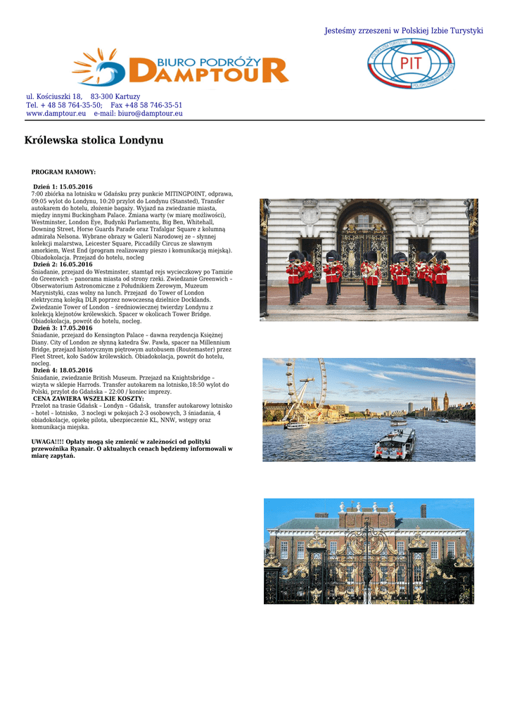 Jesteśmy zrzeszeni w Polskiej Izbie Turystyki ul. Kościuszki 18, 83-300 Kartuzy Tel. + 48 58 764-35-50; Fax +48 58 746-35-51 www.damptour.eu e-mail: [email protected] Królewska stolica Londynu PROGRAM RAMOWY: Dzień 1: 15.05.2016 7:00 zbiórka na lotnisku w Gdańsku przy punkcie MITINGPOINT, odprawa, 09:05 wylot do Londynu, 10:20 przylot do Londynu (Stansted), Transfer autokarem do hotelu, złożenie bagaży. Wyjazd na zwiedzanie miasta, między innymi Buckingham Palace. Zmiana warty (w miarę możliwości), Westminster, London Eye, Budynki Parlamentu, Big Ben, Whitehall, Downing Street, Horse Guards Parade oraz Trafalgar Square z kolumną admirała Nelsona. Wybrane obrazy w Galerii Narodowej ze – słynnej kolekcji malarstwa, Leicester Square, Piccadilly Circus ze sławnym amorkiem, West End (program realizowany pieszo i komunikacją miejską). Obiadokolacja. Przejazd do hotelu, nocleg Dzień 2: 16.05.2016 Śniadanie, przejazd do Westminster, stamtąd rejs wycieczkowy po Tamizie do Greenwich – panorama miasta od strony rzeki. Zwiedzanie Greenwich – Obserwatorium Astronomiczne z Południkiem Zerowym, Muzeum Marynistyki, czas wolny na lunch. Przejazd do Tower of London elektryczną kolejką DLR poprzez nowoczesną dzielnice Docklands. Zwiedzanie Tower of London – średniowiecznej twierdzy Londynu z kolekcją klejnotów królewskich. Spacer w okolicach Tower Bridge. Obiadokolacja, powrót do hotelu, nocleg. Dzień 3: 17.05.2016 Śniadanie, przejazd do Kensington Palace – dawna rezydencja Księżnej Diany. City of London ze słynną katedra Św. Pawła, spacer na Millennium Bridge, przejazd historycznym piętrowym autobusem (Routemaster) przez Fleet Street, koło Sadów królewskich. Obiadokolacja, powrót do hotelu, nocleg. Dzień 4: 18.05.2016 Śniadanie, zwiedzanie British Museum. Przejazd na Knightsbridge – wizyta w sklepie Harrods. Transfer autokarem na lotnisko,18:50 wylot do Polski, przylot do Gdańska – 22:00 / koniec imprezy. CENA ZAWIERA WSZELKIE KOSZTY: Przelot na trasie Gdańsk – Londyn – Gdańsk, transfer autokarowy lotnisko – hotel – lotnisko, 3 noclegi w pokojach 2-3 osobowych, 3 śniadania, 4 obiadokolacje, opiekę pilota, ubezpieczenie KL, NNW, wstępy oraz komunikacja miejska. UWAGA!!!! Opłaty mogą się zmienić w zależności od polityki przewoźnika Ryanair. O aktualnych cenach będziemy informowali w miarę zapytań.