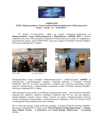 AMPER 2010 XVIII Międzynarodowe Targi Urządzeń Elektrotechnicznych i Elektronicznych Praga – Czechy, 13 – 16.04.2010 r. W dniach 12-16.04.2010 r. odbył się wyjazd techniczno-szkoleniowy na Międzynarodowe Targi Elektrotechniczne i Elektroniczne AMPER 2010 w Pradze, zorganizowany przez Stowarzyszenie Elektryków Polskich juŜ po raz piąty, we współpracy z organizatorem targów, firmą TERINVEST oraz przy wsparciu Wydziału Promocji Handlu i Inwestycji Ambasady RP w Pradze. Stoisko SEP fot. Anna Dzięcioł Przedstawiciele SEP: A Dzięcioł , J. Nowastowski Międzynarodowe Targi Urządzeń Elektrotechnicznych i Elektronicznych AMPER są największymi i najwaŜniejszymi targami z dziedziny elektryki w Czechach i Europie Centralnej. SEP po raz drugi uczestniczył w targach jako wystawca posiadając stoisko targowe, zlokalizowane w bezpośrednim sąsiedztwie stoiska Wydziału Promocji Handlu i Inwestycji Ambasady RP w Pradze. SEP udostępnił swoje stoisko uczestnikom zorganizowanej misji – dla wyłoŜenia materiałów reklamowych: plakatów, banerów, katalogów, folderów, płyt CD itp. oraz dla spotkań i przeprowadzania rozmów. Nasze stoisko cieszyło się duŜym zainteresowaniem zarówno wśród zwiedzających targi Polaków zainteresowanych współpracą z SEP, jak równieŜ wśród zwiedzających targi przedstawicieli firm czeskich . Jak co roku nasza grupa została serdecznie przyjęta na stoisku Wydziału Promocji Handlu i Inwestycji Ambasady RP w Pradze, przez Pana Wojciecha Pobóg-Pągowskiego – I Radcę, Pana Milana Wenita – I Sekretarza oraz Panią Kamilę Misiorowską – Asystentkę WPHiI. W wyjeździe wzięli udział przedstawiciele następujących firm: 1) Pan Janusz Nowastowski – Sekretarz Zarządu i Dyrektor Biura Stowarzyszenia Producentów Kabli i Osprzętu Elektrycznego – Bydgoszcz www.elektrotechnika.org.pl www.electro-poland.eu/ Stowarzyszenie Producentów Kabli i Osprzętu Elektrycznego powołano do istnienia w roku 2003 w Bydgoszczy. Celami Stowarzyszenia są: • reprezentowanie interesów producentów kabli i osprzętu elektrycznego wobec organów administracji państwowej i samorządowej • reprezentowanie polskich producentów branŜy elektrotechnicznej w organach europejskiego samorządu gospodarczego • wpływanie na tworzenie norm technicznych oraz dyrektyw europejskich • działanie na rzecz wdraŜania nowoczesnych technologii produkcji oraz systemów zarządzania jakością • podnoszenie kwalifikacji pracowników zrzeszonych firm poprzez organizowanie szkoleń • prowadzenie wspólnej działalności wystawienniczej i reklamowej 2) Pan Robert Berliński – Dyrektor Generalny i Pan Arnold Nasiłowski – Dyrektor ds. SprzedaŜy z firmy NIXEN – Warszawa www.nixen.pl Firma NIXEN zajmuje się szeroko rozumianym wykonawstwem instalacji elektrycznych, telekomunikacyjnych oraz niskoprądowych. Oferuje kompleksowe usługi począwszy od stworzenia projektu technicznego, poprzez analizę ryzyka, dostawę i montaŜ instalacji, uruchomienie systemu oraz przeszkolenie personelu i serwis gwarancyjny i pogwarancyjny wykonanych instalacji. 3) Pani Wioletta Nadziak i Pan Marcin Pawlak - Regionalny MenedŜer SprzedaŜy z firmy ERKO – Jonkowo www.erko.pl ERKO to polski producent końcówek i złączek kablowych oraz narzędzi do prac elektrycznych, działający na rynku od 1981 roku. Dzięki dbałości o klientów i otwartości na ich potrzeby na przestrzeni lat firma wypracowała opinię solidnego partnera handlowego. Wysoki poziom technologii produkcji, efektywne zarządzanie, profesjonalna, Ŝyczliwa obsługa oraz sprawna logistyka sprawiły, Ŝe firma stała się czołowym producentem krajowym w branŜy elektrotechnicznej. W ofercie ERKO znajduje się obecnie: Ponad 1700 typowymiarów końcówek i łączników kablowych Oprócz standardowych końcówek i złączek, wykonują detale o wymiarach i kształtach odbiegających od katalogowych, wg indywidualnych potrzeb klienta: mechaniczne, hydrauliczne i pneumatyczne narzędzia, przeznaczone do zaprasowywania końcówek., cięcia kabli, ściągania izolacji, wycinania otworów w blachach i tworzywach, obróbki szyn prądowych i montaŜowych, narzędzia do demontaŜu, narzędzia monterskie. 4) Pan Paweł Skrzypek – Dyrektor Handlowy i Pan Marek Jabłoński ze Spółdzielni Niewidomych im. Modesta Sękowskiego z Lublina www.lsn.pl LSN Lublin jest Zakładem Pracy Chronionej. Działalność firmy oparta jest głównie na produkcji wyrobów elektrotechnicznych takich jak : wiązki przewodów elektrycznych, przewody przyłączeniowe, wtyczki rozbieralne, przedłuŜacze , rozgałęźniki. 5) Anna Dzięcioł – SEP Foreign Relations – koordynator wyjazdu www.sep.com.pl 6) Grupa studentów z Koła Naukowego „Faza” działającego przy Katedrze Wysokich Napięć i Aparatów Elektrycznych Politechniki Warszawskiej : Sylwia Jaśpińska, Grzegorz Jankowicz, Michał Swoboda, Radosław Szreder http://www.faza.pw.edu.pl/ Członkowie koła zajmują się głównie eksperymentami z wysokimi napięciami oraz pracą na rzecz Wydziału Elektrycznego. W obrębie naszych zainteresowań leŜą równieŜ problemy ogólno-elektrotechniczne i podstawy tej nauki. Przeprowadzane przez nas doświadczenia i kampanie mają przybliŜyć zagadnienia związane z wysokimi napięciami, kompatybilnością elektromagnetyczną szerszym kręgom odbiorców. Pierwszego dnia targów, w dniu 13.04.2010 r. w godz. 15.00 – 17.00 nasza grupa wzięła udział w SEMINARIUM zorganizowanym przez Wydział Promocji Handlu i Inwestycji Ambasady RP w Pradze oraz SEP, dla przedstawicieli polskich firm biorących udział w targach oraz przedstawicieli firm czeskich, zainteresowanych nawiązaniem kontaktów kooperacyjnych i handlowych z firmami polskimi. Tytuł wiodący tegorocznego Seminarium to „Kierunki rozwoju i moŜliwości współpracy czeskiego i polskiego przemysłu elektrotechnicznego”. Seminarium Seminarium – Pan W. Pobóg-Pągo