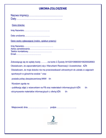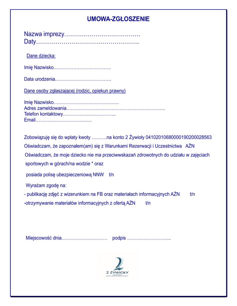 UMOWA-ZGŁOSZENIE Nazwa imprezy………………………………… Daty…………………………………………….. Dane dziecka: Imię Nazwisko……………………………….. Data urodzenia………………………………. Dane osoby zgłaszającej (rodzic, opiekun prawny) Imię Nazwisko……………………………………. Adres zameldowania……………………………………………………….. Telefon kontaktowy…………………………….. Email………………………………. Zobowiązuję się do wpłaty kwoty ……….na konto 2 Żywioły 04102010680000190200028563 Oświadczam, że zapoznałem(am) się z Warunkami Rezerwacji i Uczestnictwa AŻN Oświadczam, że moje dziecko nie ma przeciwwskazań zdrowotnych do udziału w zajęciach sportowych w górach/na wodzie * oraz posiada polisę ubezpieczeniową NNW t/n Wyrażam zgodę na: - publikację zdjęć z wizerunkiem na FB oraz materiałach informacyjnych AŻN -otrzymywanie materiałów informacyjnych z ofertą AŻN t/n Miejscowość dnia………………………… podpis ……………………….. t/n