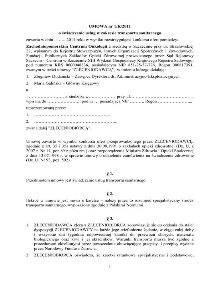 UMOWA nr 1/K/2011 o świadczenie usług w zakresie transportu sanitarnego zawarta w dniu ....….. 2011 roku w wyniku rozstrzygnięcia konkursu ofert pomiędzy: Zachodniopomorskim Centrum Onkologii z siedzibą w Szczecinie przy ul. Strzałowskiej 22, wpisanym do Rejestru Stowarzyszeń, Innych Organizacji Społecznych i Zawodowych, Fundacji, Publicznych Zakładów Opieki Zdrowotnej prowadzonego przez Sąd Rejonowy Szczecin – Centrum w Szczecinie XIII Wydział Gospodarczy Krajowego Rejestru Sądowego, pod numerem KRS 0000048836, posiadającym NIP 851-25-37-776, Regon 000817391, zwanym w treści umowy "ZLECENIODAWCĄ", w imieniu którego działają: 1. Zbigniew Dudziński – Zastępca Dyrektora ds. Administracyjno-Eksploatacyjnych 2. Maria Galińska – Główny Księgowy a ……………………. z siedzibą w……………… przy ul………………………………….. ., wpisaną do …………………, pod nr … posiadającą NIP ………, Regon ………………….., reprezentowaną przez: 1. ……………………………………………. 2. ……………………………………………….. zwaną dalej "ZLECENIOBIORCĄ". Umowę zawarto w wyniku konkursu ofert przeprowadzonego przez ZLECENIODAWCĘ, zgodnie z art. 35 i 35a ustawy z dnia 30.08.1991 o zakładach opieki zdrowotnej (Dz. U. z 2007 r. Nr 14, poz.89 z późn.zm.) oraz rozporządzenia Ministra Zdrowia i Opieki Społecznej z dnia 13.07.1998 r. w sprawie umowy o udzielenie zamówienia na świadczenia zdrowotne (Dz. U. Nr 93, poz. 592). § 1. Przedmiotem umowy jest świadczenie usług transportu sanitarnego. § 2. Ilekroć w umowie jest mowa o karetce – należy przez to rozumieć specjalistyczny środek transportu sanitarnego, wyposażony zgodnie z Polskimi Normami. § 3. 1. ZLECENIODAWCA zleca a ZLECENIOBIORCA zobowiązuje się do oddania do stałej dyspozycji ZLECENIODAWCY na każde jego telefoniczne żądanie, w ciągu całej doby i wszystkie dni tygodnia odpowiedniej karetki do przewozu chorych, materiału biologicznego oraz krwi i jej składników. Warunki transportu muszą być zgodne z procedurami określonymi przez powszechnie obowiązujące przepisy i przepisy wydane przez Narodowy Fundusz Zdrowia. 2. ZLECENIOBIORCA oświadcza, że karetki ratunkowe specjalistyczne i podstawowe, 1 którymi dysponuje, odpowiadają: 1) warunkom technicznym określonym w rozporządzeniu Ministra Infrastruktury z dnia 31.12.2002 r. w sprawie warunków technicznych pojazdów oraz zakresu ich niezbędnego wyposażenia (Dz. U. z 2003r. Nr 32 poz. 262 z późn. zm.), 2) warunkom określonym w art. 53 ust.1 ustawy z dnia 20.06.1997r. Prawo o ruchu drogowym (tj. Dz. U. z 2005r. Nr 108, poz.908 z późn. zm.), w rozumieniu którego są pojazdami uprzywilejowanymi. 3. ZLECENIOBIORCA zobowiązuje się spełnić następujące warunki transportu: 3.1. Przewóz chorych musi odbywać się w zgodzie z zasadami transportu sanitarnego. 3.2. Transport materiału biologicznego: stosowanie pojemników transportowych zapewniających stałą temperaturę, materiał przewożony w pozycji pionowej, zabezpieczony przed przewróceniem, rozlaniem lub uszkodzeniem, czas transportu nie może przekraczać 1 godziny. 3.3. Transport krwi i jej składników: stosowanie pojemników transportowych przeznaczonych tylko do tego celu, zaopatrzonych w termometry (temperaturę transportu krwi i jej składników określają stosowne procedury ZLECENIODAWCY), czas transportu nie może przekraczać 1 godziny. 4. W ramach wykonania czynności, o których mowa w ust. l kierowcy ZLECENIOBIORCY zobowiązani są do świadczenia usług polegających na pomocy pacjentom przy wsiadaniu i wysiadaniu, przekazywaniu i odbiorze przewożonych przedmiotów, dokumentów oraz materiałów do badań, stosownie do zleceń. 5. Osobami upoważnionymi przez ZLECENIODAWCĘ do zgłoszenia żądania, o którym mowa w ust. 1 są lekarze dyżurni oddziałów szpitala i pracownicy laboratorium szpitala. 6. ZLECENIOBIORCA zobowiązuje się do podstawiania specjalistycznej w ciągu 20 minut od chwili zgłoszenia żądania. 7. ZLECENIOBIORCA oświadcza, iż zlecone usługi wykona z najwyższą starannością, a za zaniechanie lub opóźnienie realizacji żądania lekarza dyżurnego odpowiadać będzie na zasadzie ryzyka. 8. ZLECENIOBIORCA zobowiązuje się do poddania kontroli przez Narodowy Fundusz Zdrowia na zasadach określonych w ustawie z dnia 27 sierpnia 2004 roku o świadczeniach opieki zdrowotnej finansowanych ze środków publicznych, w zakresie wynikającym z umowy, zawartej przez ZLECENIOBIORCĘ, z Zachodniopomorskim Oddziałem Wojewódzkim NFZ. karetki ratunkowej § 4. 1. ZLECENIOBIORCA określać będzie na podstawie otrzymanego od ZLECENIODAWCY zlecenia wyjazdu następujące dane: rodzaj transportu, nr zlecenia, w przypadku transportu pacjenta jego imię i nazwisko, imię i nazwisko lekarza zlecającego transport pacjenta, faktyczną liczbę przejechanych kilometrów, przebieg trasy. 2 2. Przejechane kilometry ZLECENIOBIORCA zobowiązany jest ustalać na podstawie wskazań licznika zainstalowanego w karetce. 3. ZLECEBIOBIORCA zobowiązany jest podać rzeczywistą liczbę kilometrów na trasie przewiezienia pacjenta. 4. Informacje określone w ust. 1 ZLECENIOBIORCA zobowiązany jest przedstawiać w wystawianej fakturze lub w postaci załącznika do faktury. § 5. 1. ZLECENIODAWCA zapłaci ZLECENIOBIORCY wynagrodzenie w wysokości: 1) za jednorazową dyspozycję, o której mowa w §3 ust.1, w granicach administracyjnych miasta Szczecina: a) ………. zł za karetkę ratunkową podstawową w celu przewiezienia chorego na terenie miasta, w części lewobrzeżnej, b) ………. zł za karetkę ratunkową podstawową w celu przewiezienia chorego na terenie miasta, w części prawobrzeżnej, c) ……….. zł za karetkę ratunkową specjalistyczną w celu przewiezienia chorego na terenie miasta, d) ………..zł za karetkę ratunkową podstawową w celu przewozu krwi i je