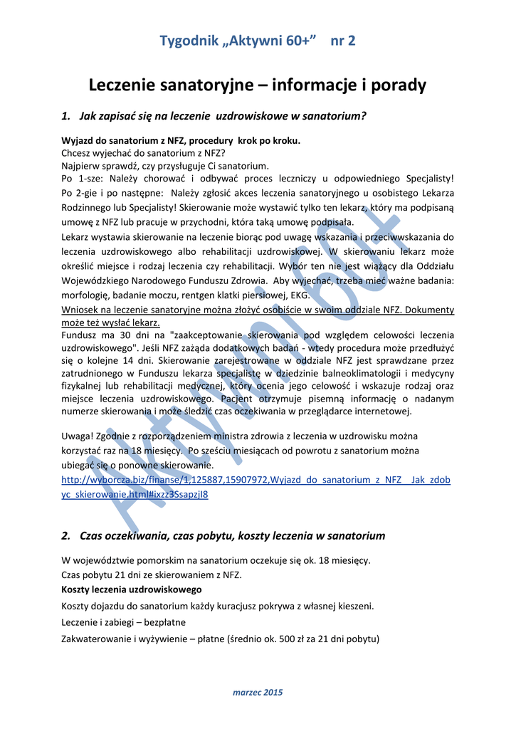 Tygodnik „Aktywni 60+” nr 2 Leczenie sanatoryjne – informacje i porady 1. Jak zapisać się na leczenie uzdrowiskowe w sanatorium? Wyjazd do sanatorium z NFZ, procedury krok po kroku. Chcesz wyjechać do sanatorium z NFZ? Najpierw sprawdź, czy przysługuje Ci sanatorium. Po 1-sze: Należy chorować i odbywać proces leczniczy u odpowiedniego Specjalisty! Po 2-gie i po następne: Należy zgłosić akces leczenia sanatoryjnego u osobistego Lekarza Rodzinnego lub Specjalisty! Skierowanie może wystawić tylko ten lekarz, który ma podpisaną umowę z NFZ lub pracuje w przychodni, która taką umowę podpisała. Lekarz wystawia skierowanie na leczenie biorąc pod uwagę wskazania i przeciwwskazania do leczenia uzdrowiskowego albo rehabilitacji uzdrowiskowej. W skierowaniu lekarz może określić miejsce i rodzaj leczenia czy rehabilitacji. Wybór ten nie jest wiążący dla Oddziału Wojewódzkiego Narodowego Funduszu Zdrowia. Aby wyjechać, trzeba mieć ważne badania: morfologię, badanie moczu, rentgen klatki piersiowej, EKG. Wniosek na leczenie sanatoryjne można złożyć osobiście w swoim oddziale NFZ. Dokumenty może też wysłać lekarz. Fundusz ma 30 dni na "zaakceptowanie skierowania pod względem celowości leczenia uzdrowiskowego". Jeśli NFZ zażąda dodatkowych badań - wtedy procedura może przedłużyć się o kolejne 14 dni. Skierowanie zarejestrowane w oddziale NFZ jest sprawdzane przez zatrudnionego w Funduszu lekarza specjalistę w dziedzinie balneoklimatologii i medycyny fizykalnej lub rehabilitacji medycznej, który ocenia jego celowość i wskazuje rodzaj oraz miejsce leczenia uzdrowiskowego. Pacjent otrzymuje pisemną informację o nadanym numerze skierowania i może śledzić czas oczekiwania w przeglądarce internetowej. Uwaga! Zgodnie z rozporządzeniem ministra zdrowia z leczenia w uzdrowisku można korzystać raz na 18 miesięcy. Po sześciu miesiącach od powrotu z sanatorium można ubiegać się o ponowne skierowanie. http://wyborcza.biz/finanse/1,125887,15907972,Wyjazd_do_sanatorium_z_NFZ__Jak_zdob yc_skierowanie.html#ixzz3SsapzjI8 2. Czas oczekiwania, czas pobytu, koszty leczenia w sanatorium W województwie pomorskim na sanatorium oczekuje się ok. 18 miesięcy. Czas pobytu 21 dni ze skierowaniem z NFZ. Koszty leczenia uzdrowiskowego Koszty dojazdu do sanatorium każdy kuracjusz pokrywa z własnej kieszeni. Leczenie i zabiegi – bezpłatne Zakwaterowanie i wyżywienie – płatne (średnio ok. 500 zł za 21 dni pobytu) marzec 2015 Tygodnik „Aktywni 60+” nr 2 Tabela przedstawia częściową odpłatność za koszty wyżywienia i zakwaterowania w sanatorium uzdrowiskowym za jeden dzień pobytu. I sezon rozliczeniowy (w złotych) w okresie 1 października - 30 kwietnia II sezon rozliczeniowy (w złotych) w okresie 1 maja - 30 września pokój 1-osobowy z pełnym węzłem higieniczno-sanitarnym 25,00 31,50 pokój 1-osobowy w studio 20,00 28,50 pokój 1-osobowy bez pełnego węzła higieniczno-sanitarnego 19,00 25,50 pokój 2-osobowy z pełnym węzłem higieniczno-sanitarnym 15,00 21,00 pokój 2-osobowy w studio – to oznacza jeden z dwóch lub więcej pokoi posiadających wspólną łazienkę i przedpokój 13,00 19,00 pokój 2-osobowy bez pełnego węzła higieniczno-sanitarnego 11,00 15,00 pokój wieloosobowy z pełnym węzłem higieniczno-sanitarnym 9,50 11,50 pokój wieloosobowy w studio 9,00 10,50 pokój wieloosobowy bez pełnego węzła higienicznosanitarnego 8,00 9,00 Pokój 3. Przydatne linki Polskie sanatoria (mapa uzdrowiska i sanatoria, profile leczenie, baza zabiegowa poszczególnych obiektów, atrakcje na wolny czas, poradnik kuracjusza) http://www.sanatoria.com.pl/ Przeglądarka skierowań na leczenie uzdrowiskowe : https://skierowania.nfz.gov.pl/ http://www.sanatorium.mobi/ 4. Praktyczne rady Lidka: Jadąc do sanatorium trzeba zabrać: -skierowanie do sanatorium potwierdzone przez NFZ oraz wszystkie wyniki badań -dowód osobisty -potwierdzenie ubezpieczenia -leki na cały okres pobytu, jeżeli je przyjmujesz -ubranie w ilości wystarczającej (strój sportowy, strój wyjściowy na wypadek dancingu) -dobry humor Janina: Gdy już uzyskamy z NFZ termin wyjazdu do sanatorium: -Należy wykupić bilecik PKP w przedsprzedaży, gdyż przy wcześniejszym zakupie (miesiąc) bilet kosztuje odpowiednio mniej. -Należy wziąć wygodne obuwie (spacery, wycieczki) oraz buciki „taneczne”, gdyż są organizowane wieczorki „rozpoznawcze” i wszelkiego rodzaju „balety” później. marzec 2015 Tygodnik „Aktywni 60+” nr 2 -Bywają organizowane wycieczki zagraniczne, szczególnie w pasie przygranicznym, np. ze Szczawna Zdroju do Pragi, Drezna i Budapesztu; stąd konieczny dowód osobisty, paszport oraz jakiś pieniądz ogólnie obowiązujący „unijny”. Ela R.: Nigdy nie korzystałam z leczenia uzdrowiskowego w sanatorium, natomiast przez kilka lat chodziłam na zabiegi do Sopotu, do Zakładu Balneologicznego. Ze skierowaniem od lekarza pierwszego kontaktu należy zgłosić się do Zakładu Balneologicznego i zapisać się na wizytę do lekarza reumatologa–rehabilitanta. Oczywiście na wizytę do lekarza warto zabrać wyniki badań, usg, rtg. Lekarz przepisuje zabiegi, które wykonywane są bardzo profesjonalnie przez 10 dni. Polecam między wyjazdami do sanatorium. 5. Sanatoria godne polecenia Sanatorium Limba położone jest w centrum Piwnicznej - Zdrój, na malowniczym cyplu utworzonym przy zakolu rzeki Poprad. Obiekt zlokalizowany jest na nasłonecznionym stoku góry Kicarz, pokrytej dorodnym lasem z przewagą drzewostanu iglastego. W okolicy są świetne tereny narciarskie Kokuszka, Mała Wierchomla, Sucha Dolina. http://www.sanatoriumlimba.pl/ Sanatorium MSW w Krynicy Zdrój. Szeroki wachlarz zabiegów w jednym budynku. W sierpniu dodatkową atrakcją jest Festiwal im. Jana Kiepury. http://www.sanatorium.krynica.com.pl/ Sanatorium Leśnik-Drzewiarz w Krynicy Zdroju. http://lesnik-drzewiarz.pl/ Ośrodek Rehabilitacyjno – Wypoczynk